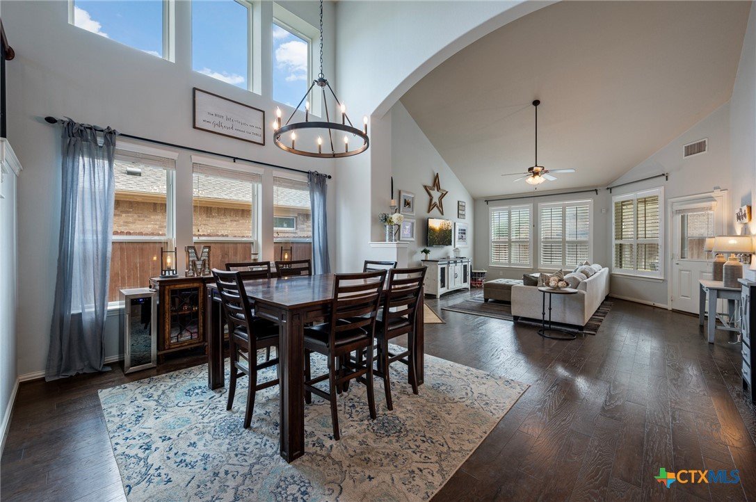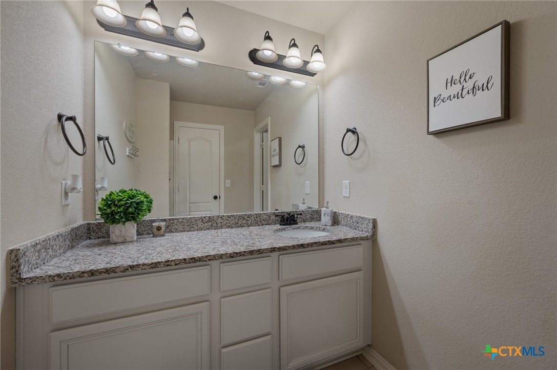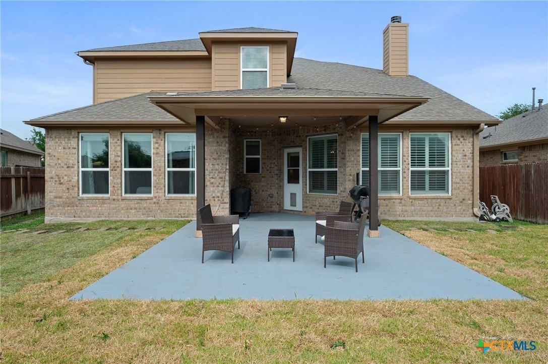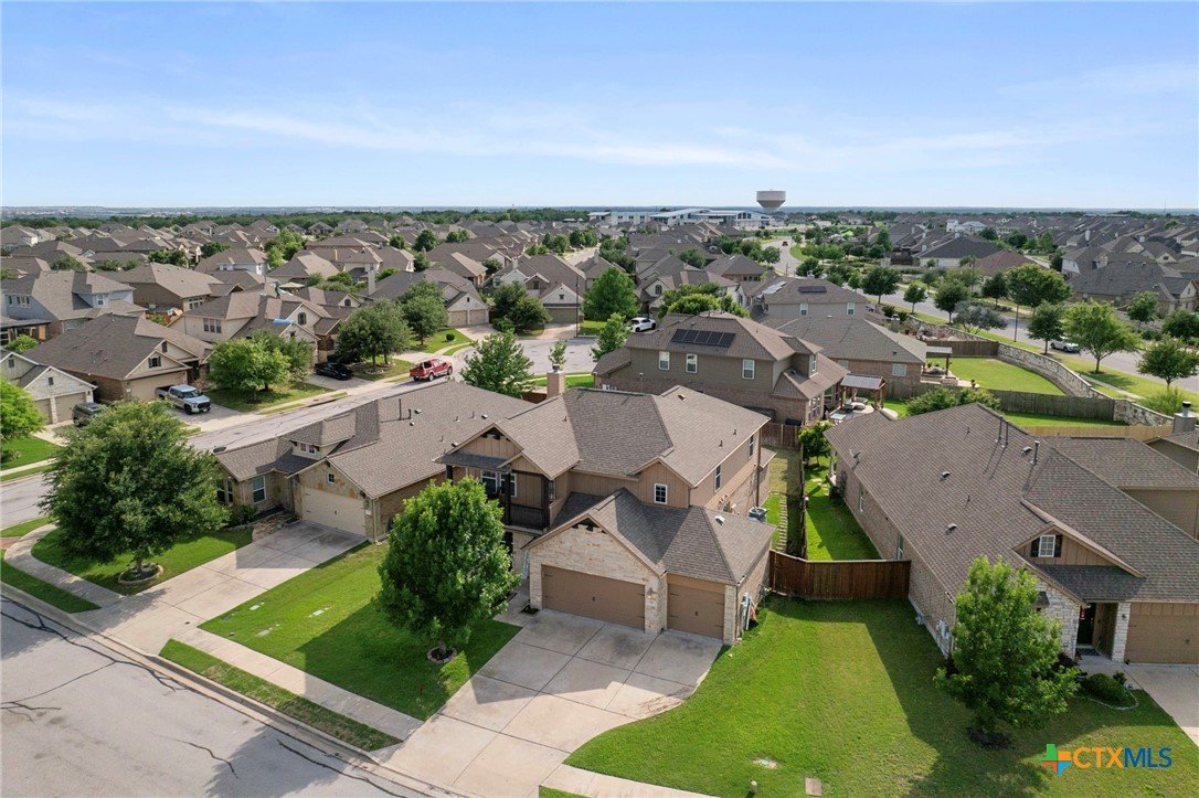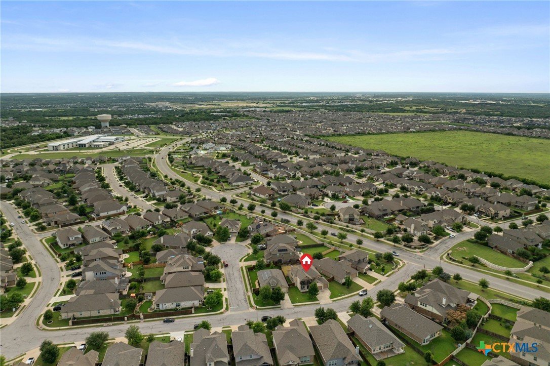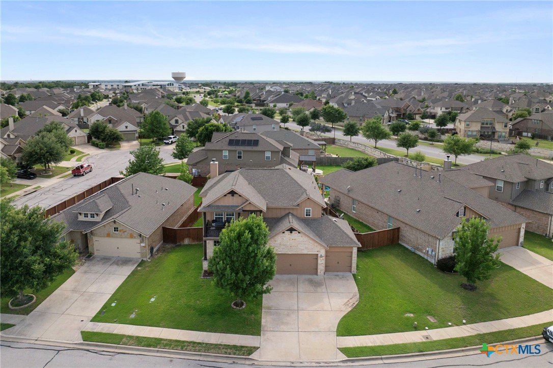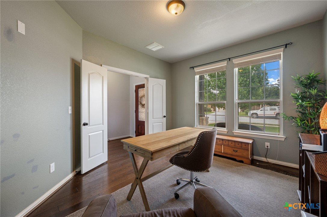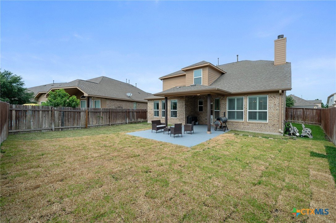 Welcome to this stunning 4-bedroom, 2.5-bath home in the highly sought-after community of Santa Rita Ranch in Liberty Hill, TX. This beautifully designed residence offers an expansive open floor plan with soaring ceilings, creating a light and airy atmosphere perfect for both everyday living and entertaining. The spacious kitchen at the heart of the home features a large center island, gleaming granite countertops, and seamless flow into the living and dining areas. The living room boasts a cozy fireplace, while the dining room is framed by a wall of windows that flood the space with natural light. Elegant wood flooring extends throughout the main floor living areas, enhancing the home’s warmth and charm. The primary suite, conveniently located on the main floor, includes a generous ensuite bath with dual vanities, a luxurious soaking tub, and a separate walk-in shower. A dedicated home office and a half bath complete the main level. Upstairs, enjoy a spacious loft lounge area, an inviting media room perfect for movie nights, and a balcony overlooking the peaceful neighborhood. Three additional bedrooms and a full bath provide plenty of space for family or guests. Wander outside to a covered, extended back patio—ideal for relaxing or hosting gatherings. A 3-car garage offers ample storage and convenience. Residents of Santa Rita Ranch enjoy resort-style amenities, including a sparkling pools, splash pad, sport courts, playgrounds, and scenic park spaces. Don’t miss your chance to call this exceptional property home!