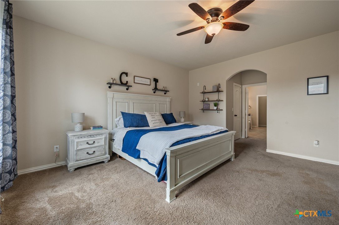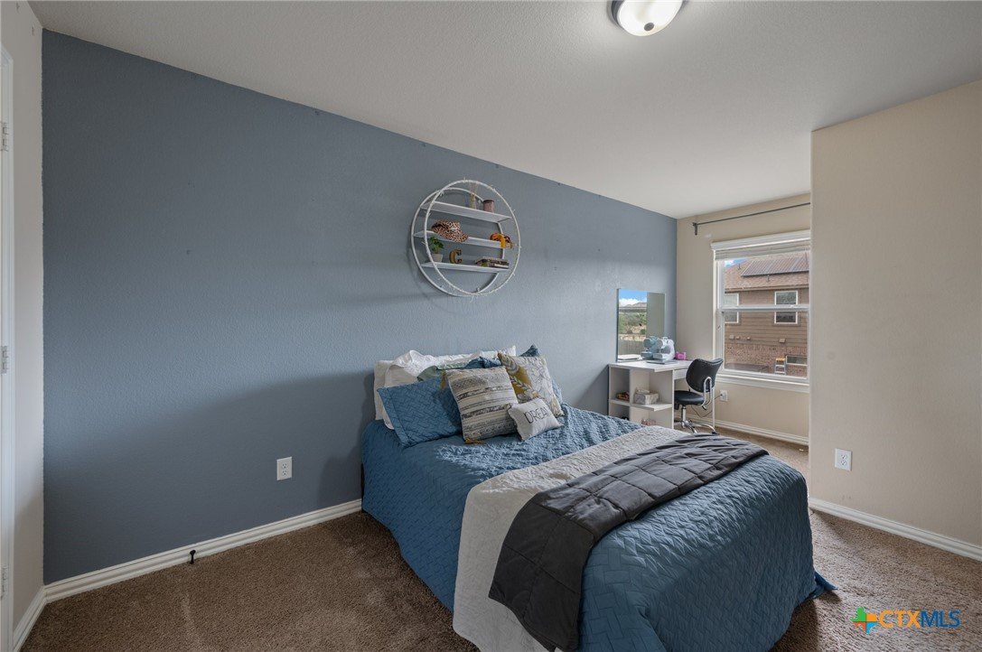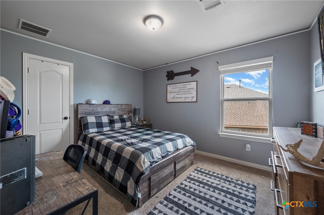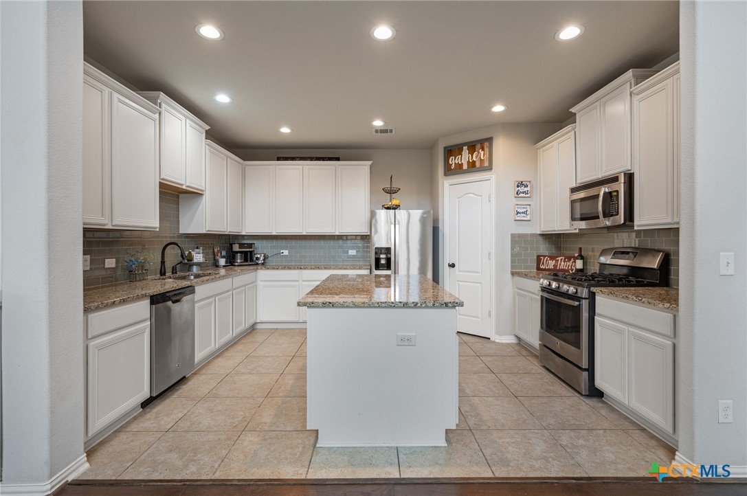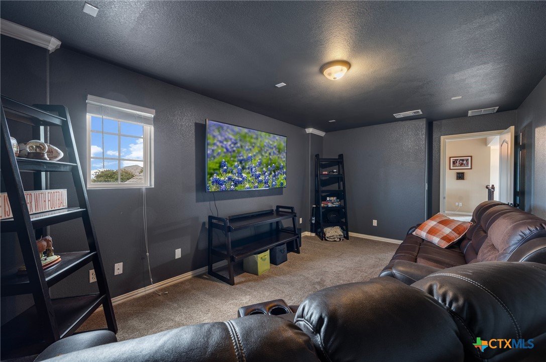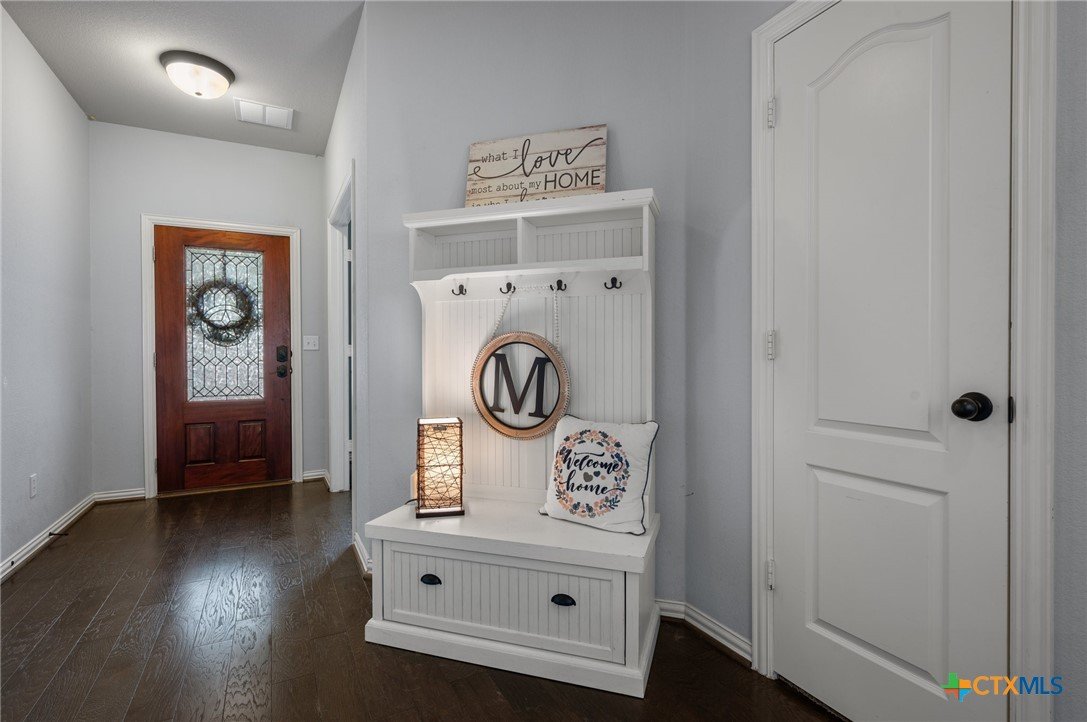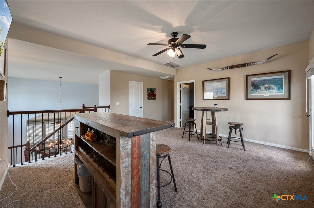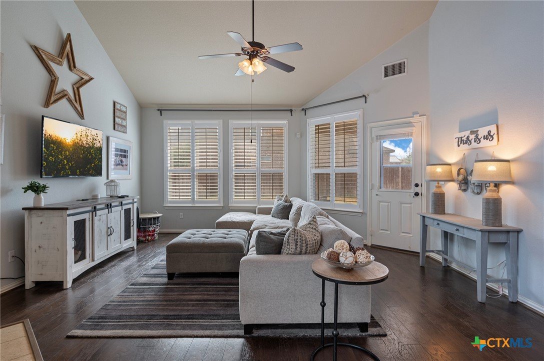Welcome to this stunning 4-bedroom, 2.5-bath home in the highly sought-after community of Santa Rita Ranch in Liberty Hill, TX. This beautifully designed residence offers an expansive open floor plan with soaring ceilings, creating a light and airy atmosphere perfect for both everyday living and entertaining. The spacious kitchen at the heart of the home features a large center island, gleaming granite countertops, and seamless flow into the living and dining areas. The living room boasts a cozy fireplace, while the dining room is framed by a wall of windows that flood the space with natural light. Elegant wood flooring extends throughout the main floor living areas, enhancing the home’s warmth and charm. The primary suite, conveniently located on the main floor, includes a generous ensuite bath with dual vanities, a luxurious soaking tub, and a separate walk-in shower. A dedicated home office and a half bath complete the main level. Upstairs, enjoy a spacious loft lounge area, an inviting media room perfect for movie nights, and a balcony overlooking the peaceful neighborhood. Three additional bedrooms and a full bath provide plenty of space for family or guests. Wander outside to a covered, extended back patio—ideal for relaxing or hosting gatherings. A 3-car garage offers ample storage and convenience. Residents of Santa Rita Ranch enjoy resort-style amenities, including a sparkling pools, splash pad, sport courts, playgrounds, and scenic park spaces. Don’t miss your chance to call this exceptional property home!