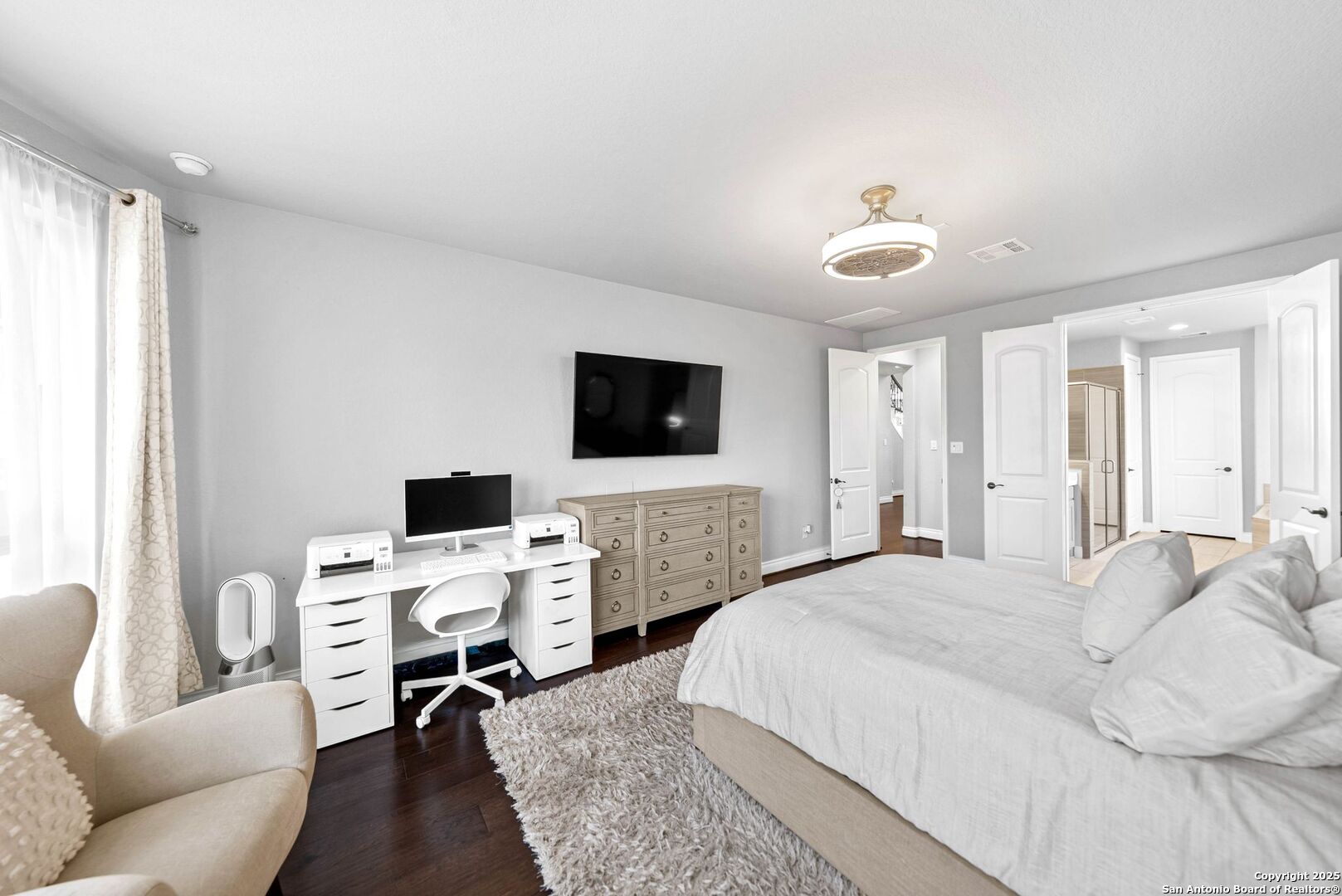 Located on a cul-de-sac in the gated community of The Ranches at Creekside, this Perry Home was built in 2020 and offers 4,098 square feet with five bedrooms, four and a half bathrooms, a dedicated office, game room, media room, and a flex space. The main level includes the primary suite, an additional bedroom with an ensuite bath, the office, and the main living areas. The open living space connects to an island kitchen with gas cooking, a butler's pantry, a breakfast area, and a separate dining room. Upstairs features two bedrooms connected by a Jack-and-Jill bathroom, an additional bedroom with a full bath, along with the game room, media room, and flex space. The home sits on an oversized lot with a turf backyard for easy maintenance. Community amenities, including the pool, clubhouse, trails, parks, and playgrounds, are within walking distance. Zoned to Boerne ISD, the property offers convenient access to Highway 46 and I-10, with direct routes to downtown Boerne, San Antonio employment centers, shopping, dining, and the San Antonio International Airport. This location is well-suited for buyers relocating to Boerne or the greater San Antonio area who want gated community living close to daily conveniences.