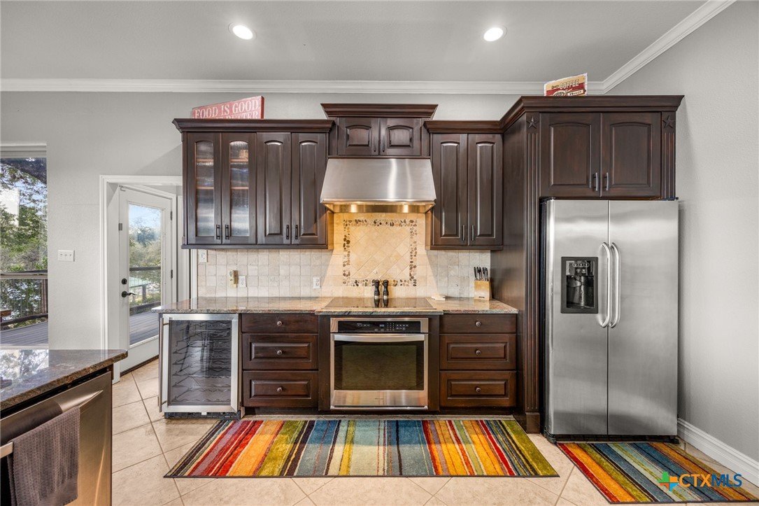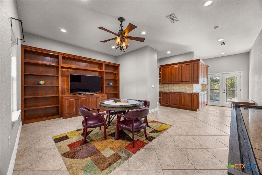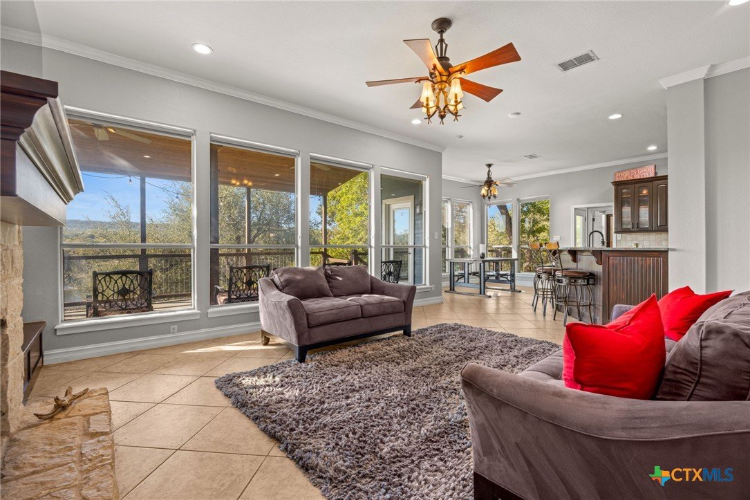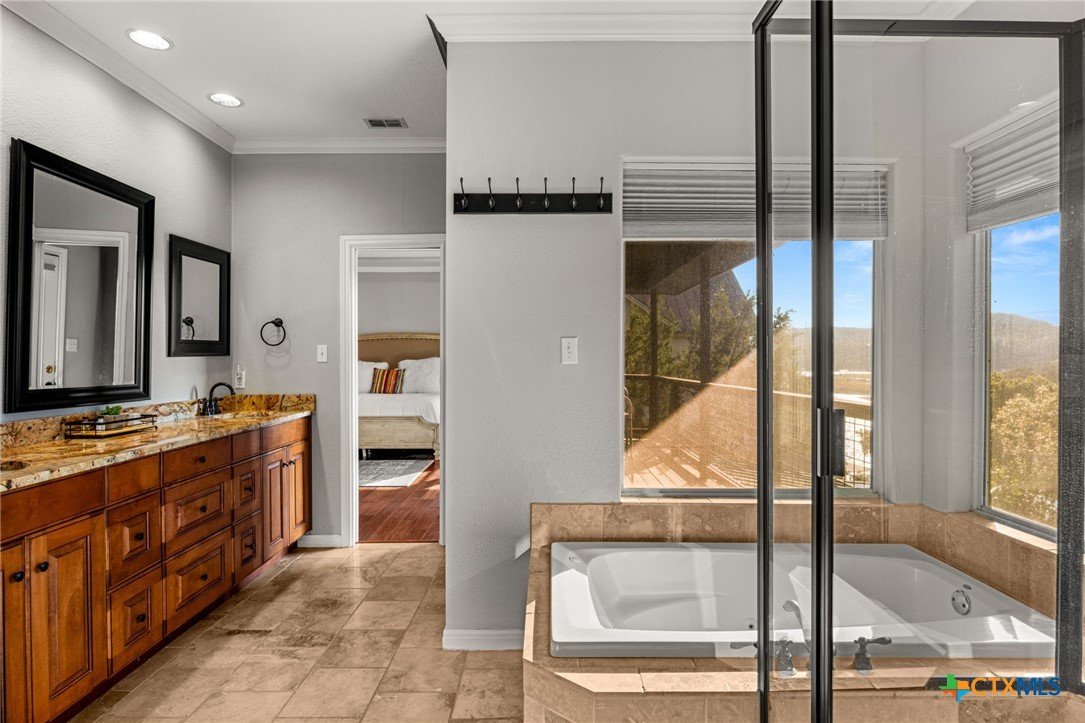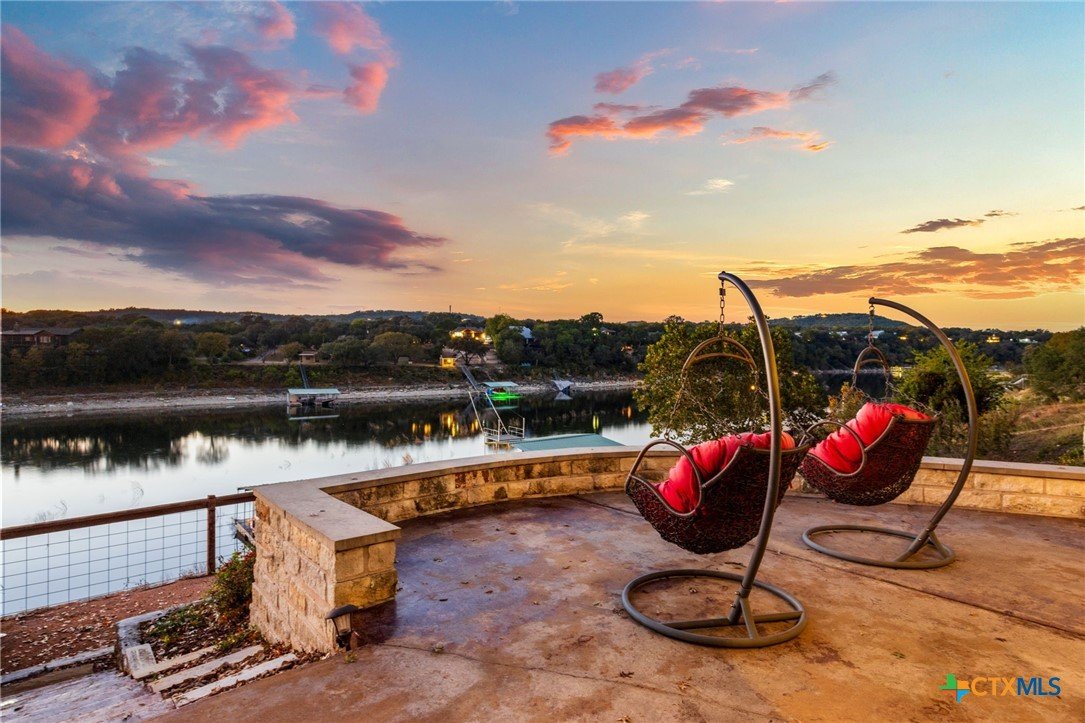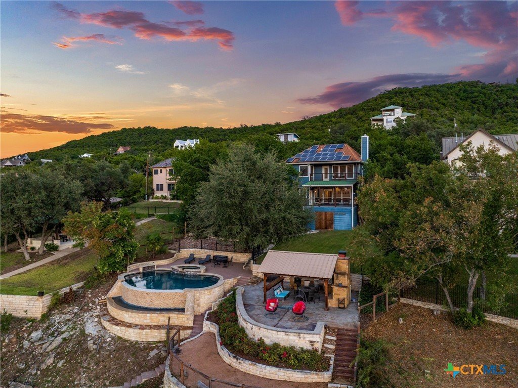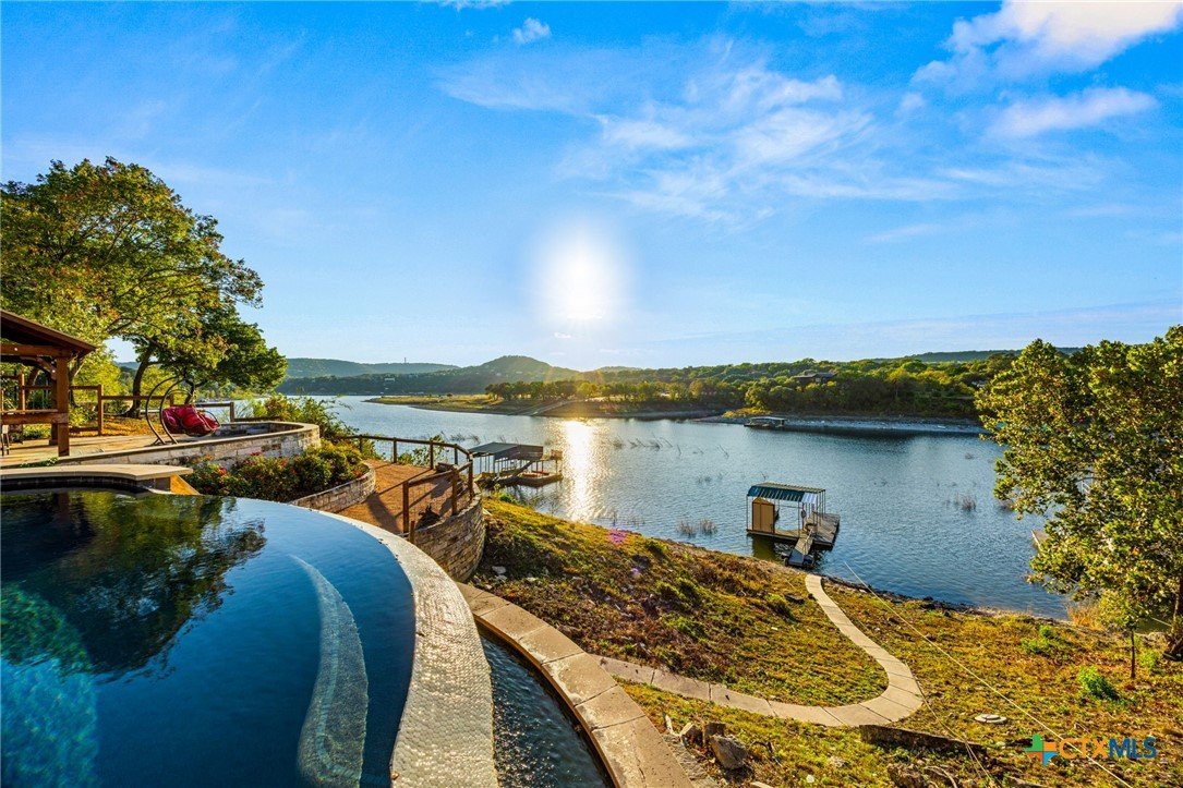 Welcome to your lakefront oasis nestled in the private hills of Lake Travis, where breathtaking Hill Country and water views create a serene, resort-style escape. Whether you're seeking a peaceful personal retreat or a lucrative investment opportunity, this rare property is fully furnished and ready to enjoy or rent from day one. A charming guest house greets you upon arrival, offering warm wood accents and cozy, cabin-like character—ideal for visitors or home office. The main residence sits further down the drive, showcasing beautiful stonework and timeless curb appeal. Inside, a light-filled layout features a welcoming living room with fireplace and a wall of windows, seamlessly connecting you to the surrounding landscape. The chef’s kitchen is designed for entertaining, with stainless steel appliances, a professional-grade refrigerator, and extensive storage. The primary suite is a true sanctuary with private balcony access, a spa-style bath featuring dual vanities, walk-in shower, soaking tub, and a spacious closet. Make your way outside to multi-level decks designed for relaxation and gatherings, complete with shaded lounging areas and an infinity-edge pool and spa that overlook Lake Travis. The outdoor pavilion kitchen is fully equipped with a grill, refrigerator, fireplace, TV, and pull-down shades—perfect for hosting everything from game day to sunset dinners. A gentle private walkway leads down to your personal boat dock, offering effortless lake access. With solar panels for energy savings, an expansive yard for recreation or future additions, owner financing options, and easy access to Austin, this one-of-a-kind property checks every box.