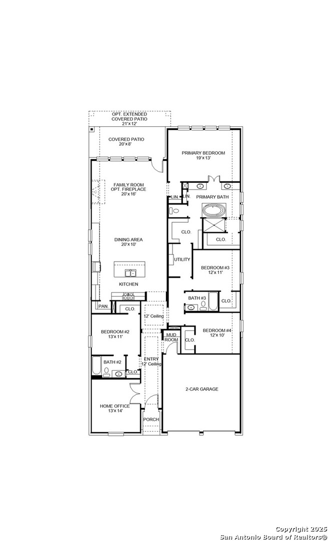 Welcoming entry framed by home office with French doors. Generous family room with a wall of windows extends to the kitchen and dining area. Island kitchen with built-in seating space offers a corner pantry and a 5-burner gas cooktop. Private primary suite with a large wall of windows. Primary bathroom features a French door entry, dual vanities, garden tub, separate glass enclosed shower, a linen closet, two walk-in closets and private access to the utility room. Guest suite with a full bathroom and walk-in closet and secondary bedrooms with walk-in closets complete this spacious design. Extended covered backyard patio and a 5-zone sprinkler system. Mud room just off the two-car garage.
