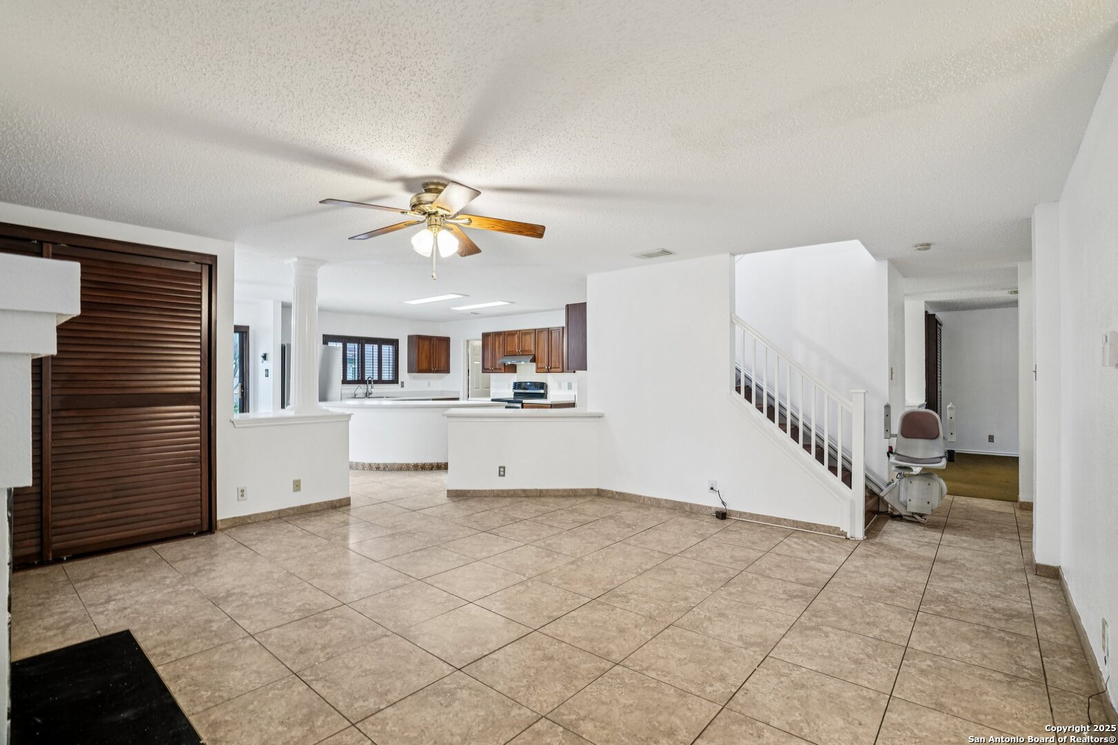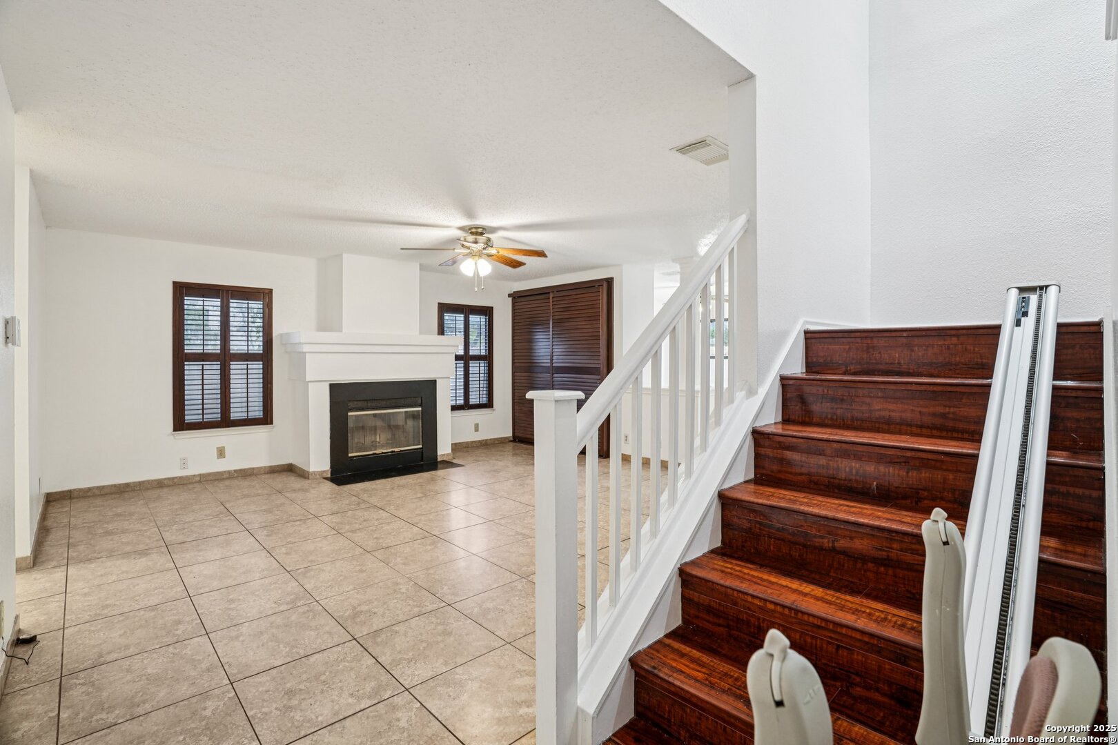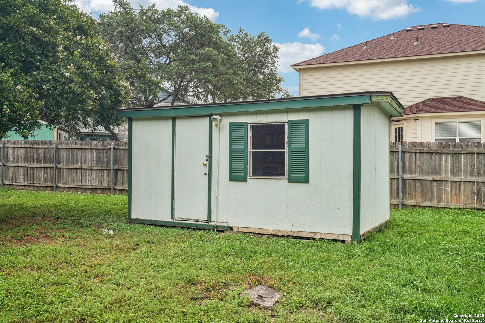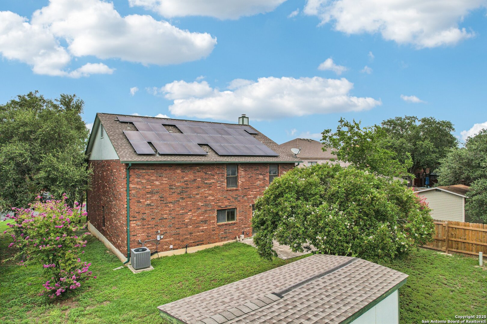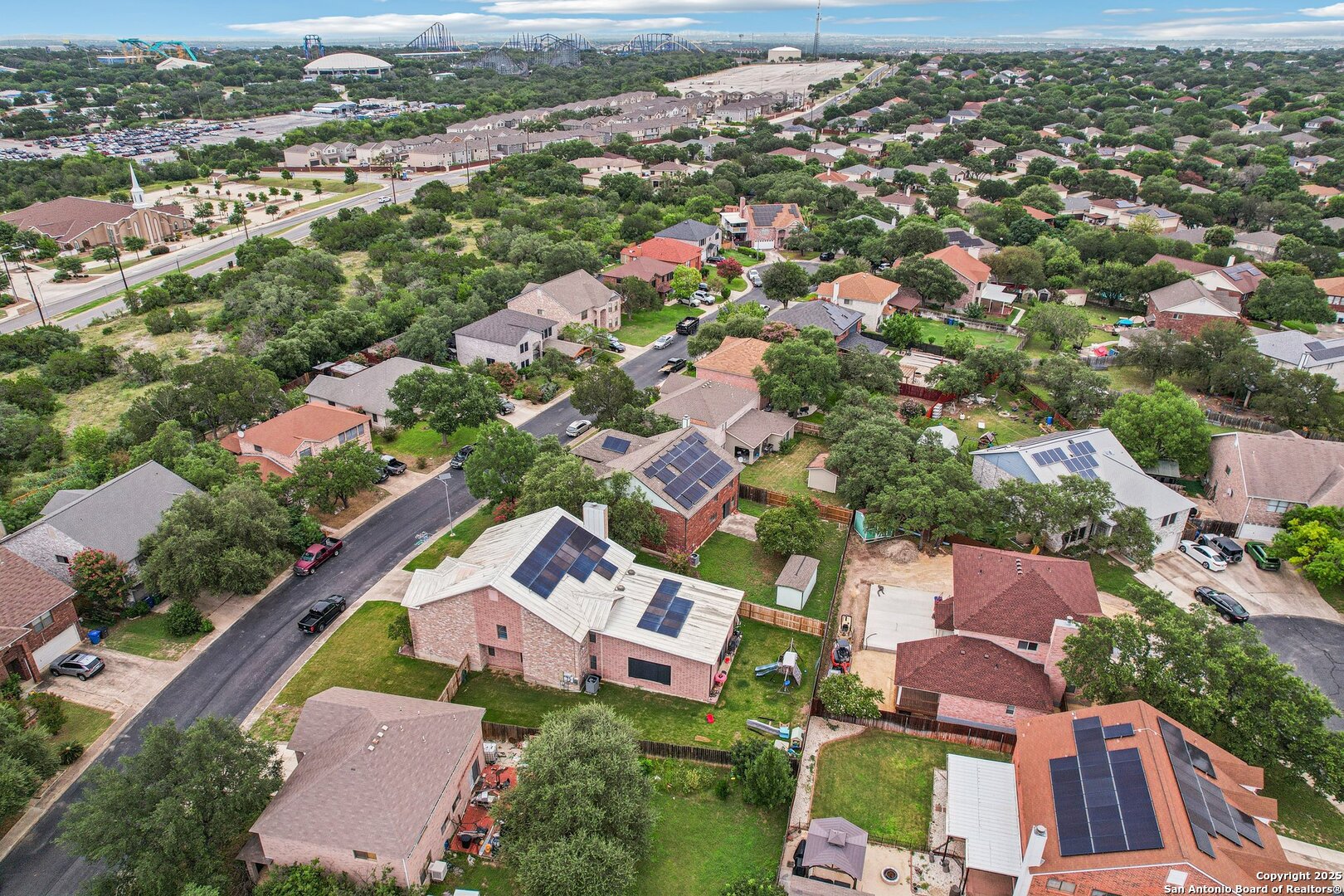 Spacious and thoughtfully upgraded, this 3,300+ sq ft home is located in the thriving Northside ISD with easy access to Loop 1604. Enjoy views of SeaWorld fireworks right from your bedroom windows! Inside, you'll find porcelain tile flooring, fresh interior paint, plantation shutters, and three versatile living areas-perfect for entertaining or relaxing. The kitchen features stainless steel appliances, and the home is equipped with a soft water system for added comfort. Accessibility is a priority with a stair lift and walk-in shower. Outside, an added slab and storage shed complete this exceptional property. Roomy, refined, and ready to welcome you home.