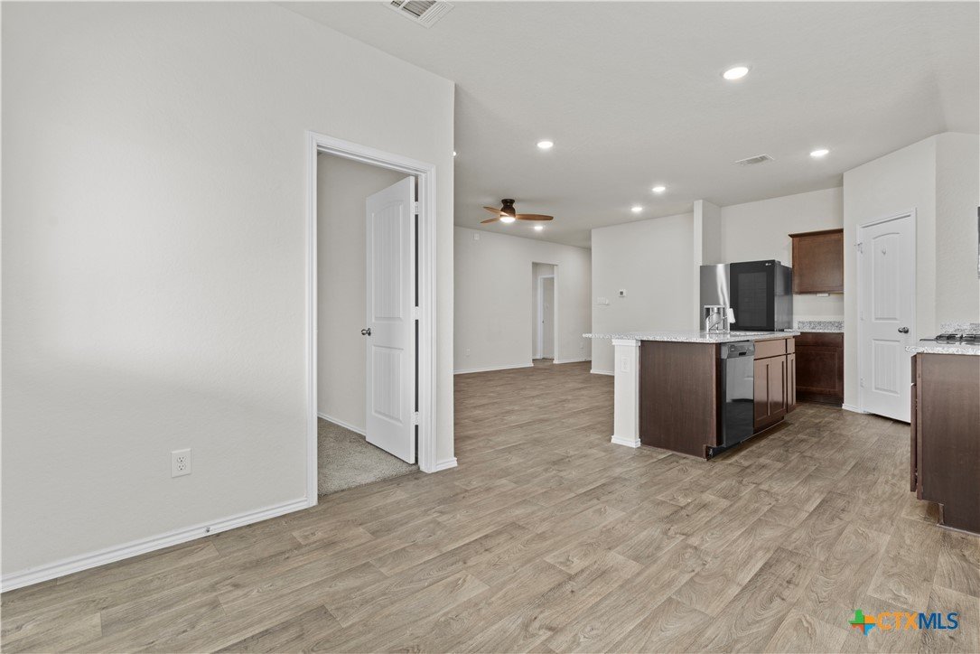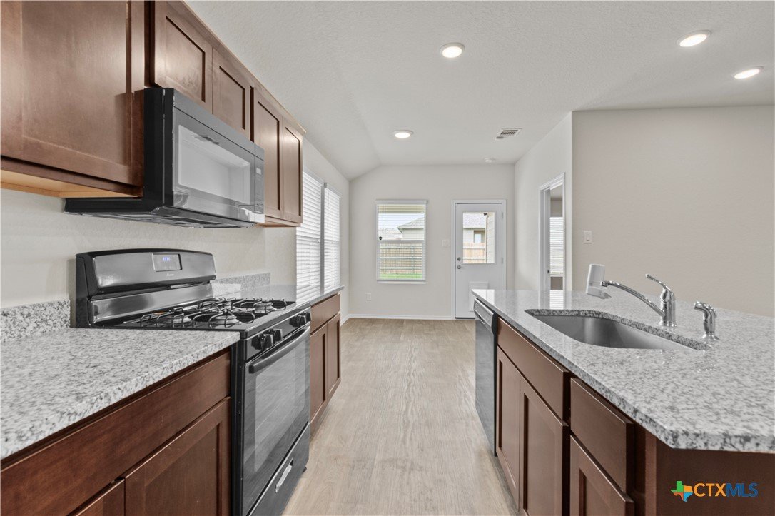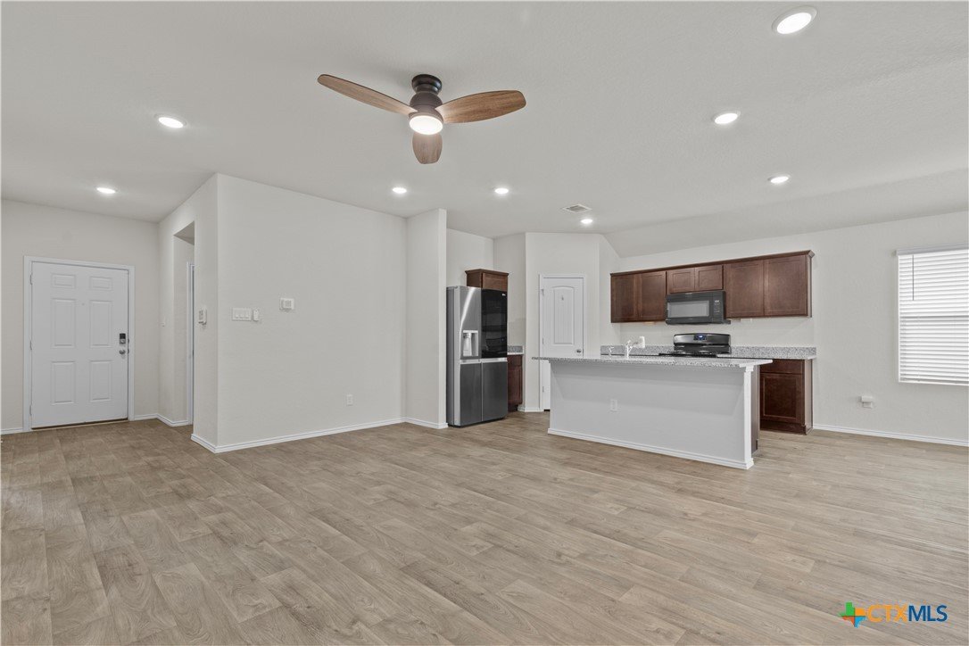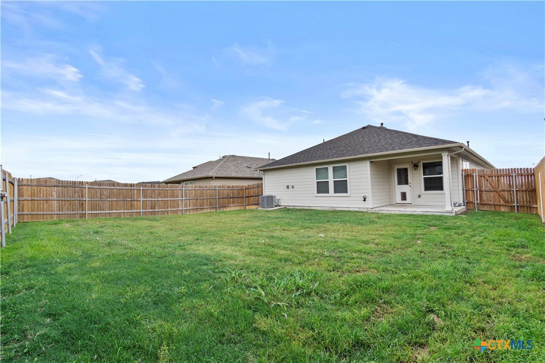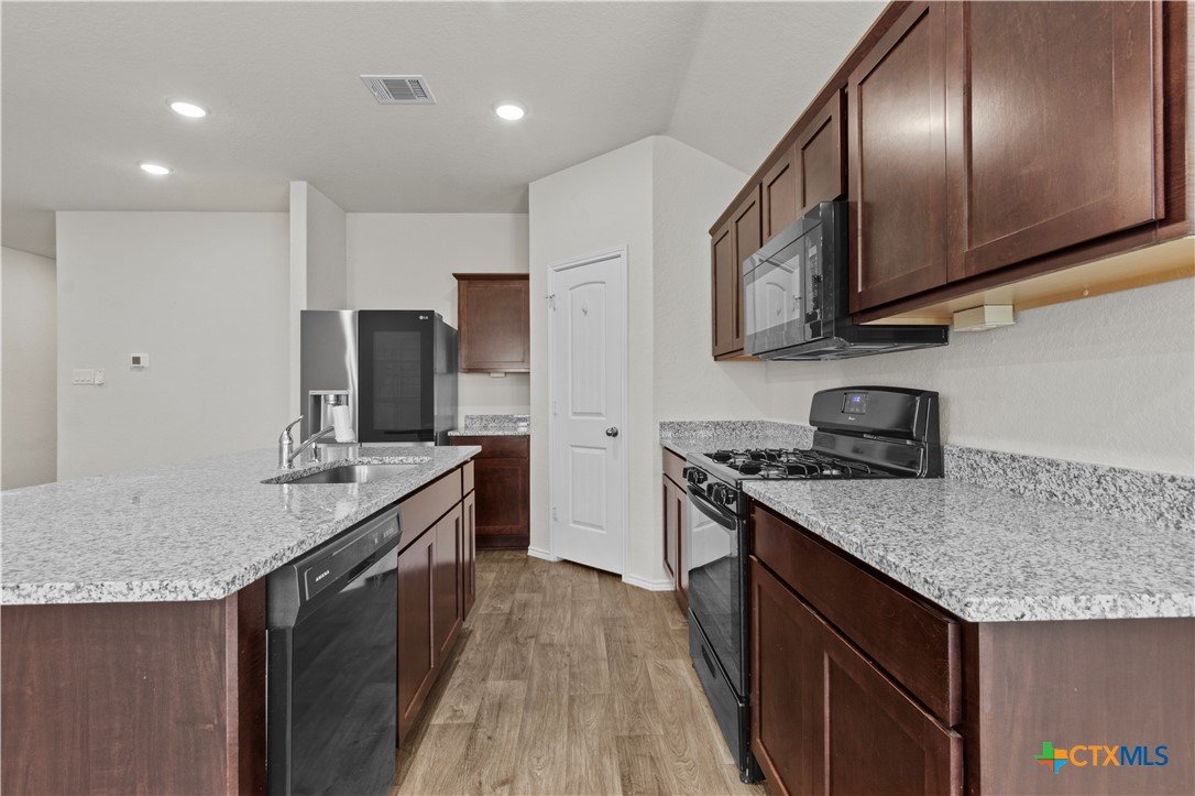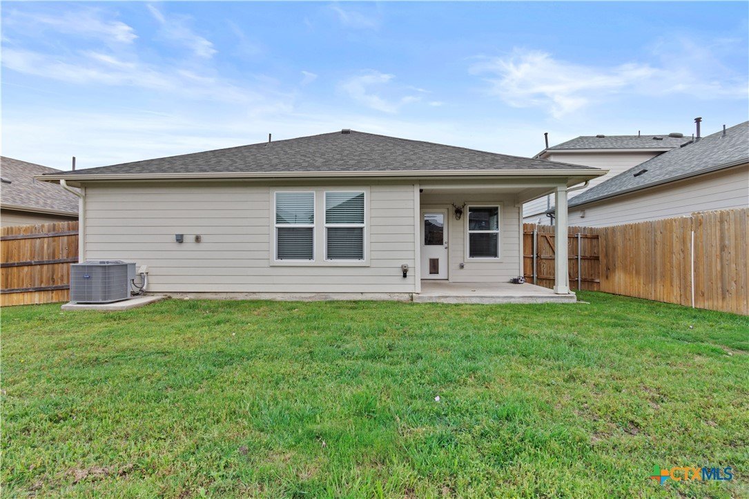 Welcome to 109 Half Moon Ct—a charming and move-in-ready single-story home located in a quiet cul-de-sac. With 1,409 sq ft of well-utilized space, this 3-bedroom, 2-bath residence offers comfort and functionality at every turn. Step into an open-concept living and kitchen area that seamlessly blends space for cooking, dining, and relaxing. The kitchen features granite countertops, espresso cabinetry, a walk-in pantry, and a center island with bar seating—ideal for meal prep and casual gatherings. Sleek black appliances, including a gas range and microwave, complete the modern kitchen setup. The spacious living room provides a welcoming atmosphere with natural light streaming in from well-placed windows. Enjoy a flexible layout that easily accommodates entertainment setups and cozy seating arrangements. The primary suite is tucked away at the rear of the home, offering privacy and comfort. It features a large bedroom with neutral tones and an en-suite bathroom with an oversized walk-in shower, double vanity, and generous walk-in closet. Two additional bedrooms are located at the front of the home, sharing a full bathroom and perfect for guests, family, or a home office setup. A dedicated laundry room includes a washer and dryer—ready for immediate use. Additional features include ceiling fans and luxury vinyl plank flooring in the main living areas with carpet in the bedrooms for added comfort. Step outside to enjoy a covered back patio overlooking a fully fenced-in yard—perfect for pets, play, or future garden plans. The attached 2-car garage provides secure parking and additional storage options. Located just minutes from San Marcos High School, shopping, and dining, this home combines peaceful living with everyday convenience in the Cottonwood Creek neighborhood.