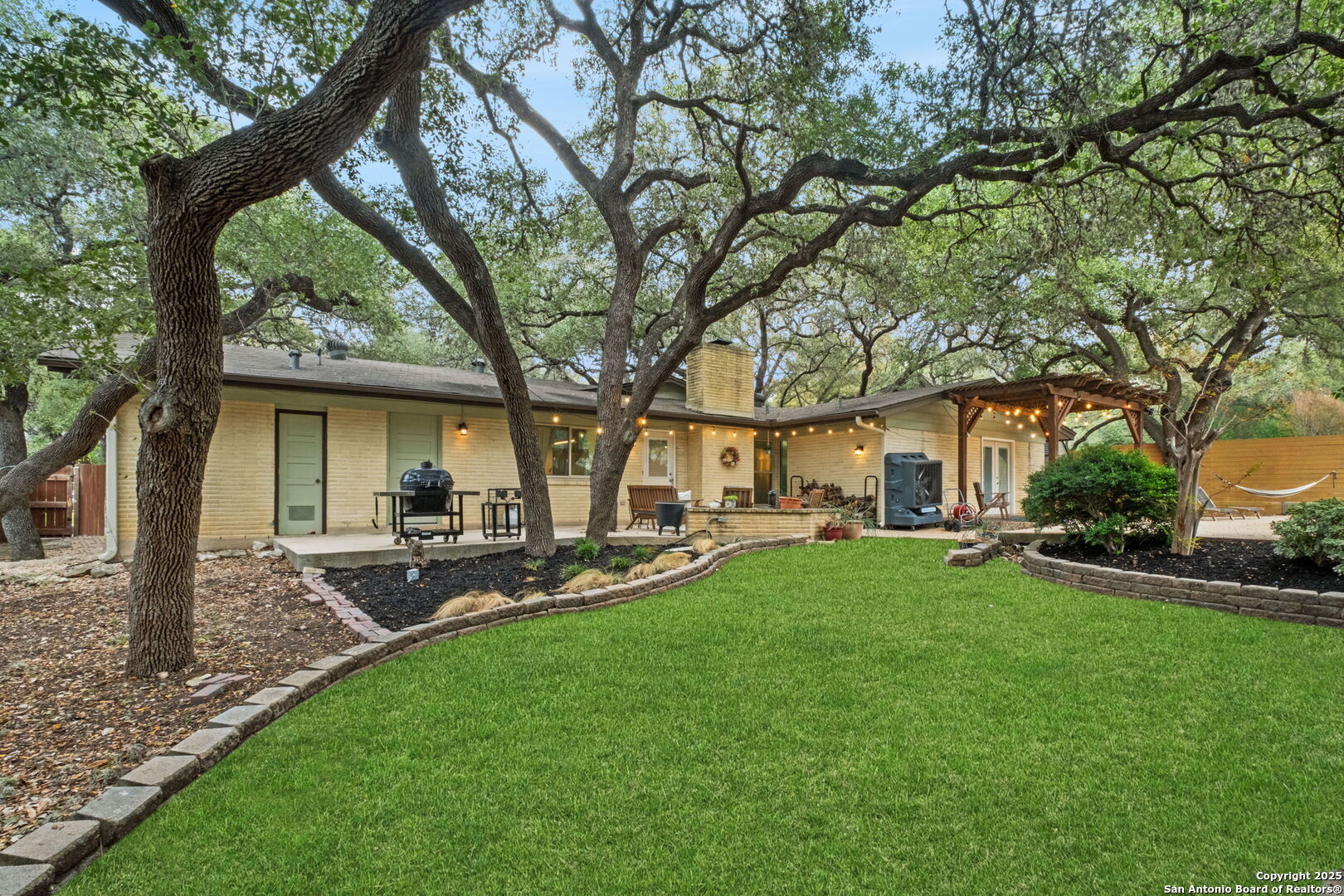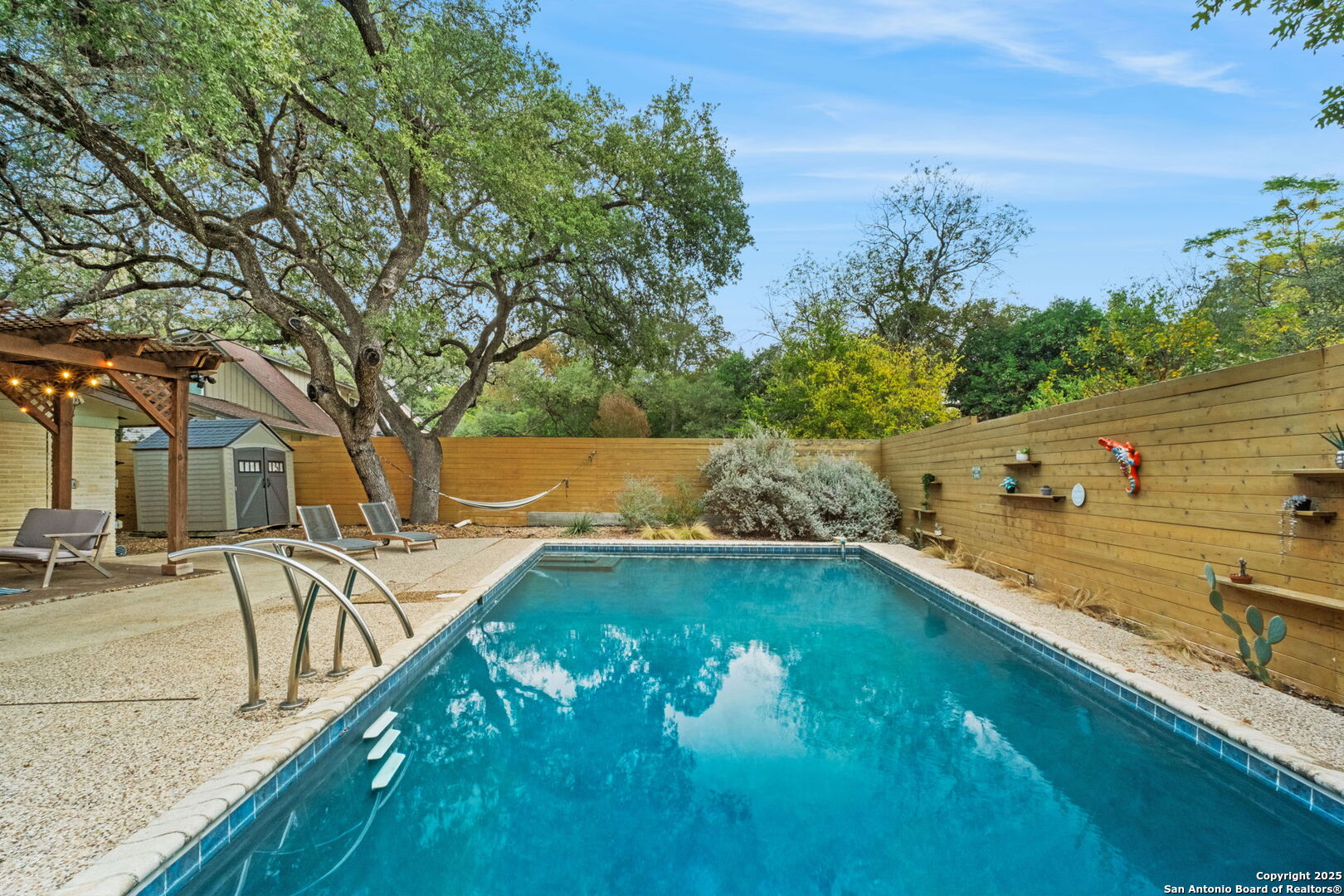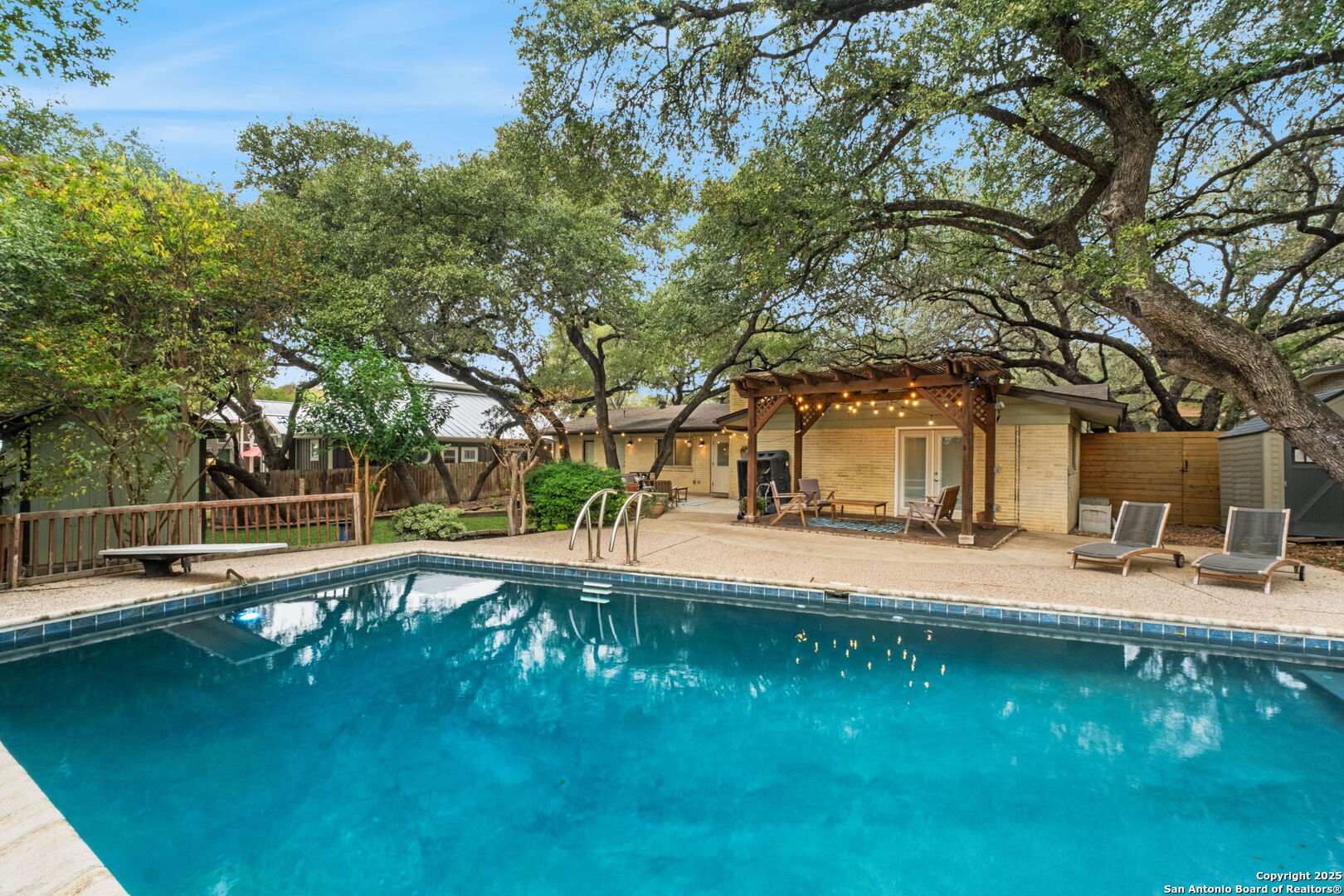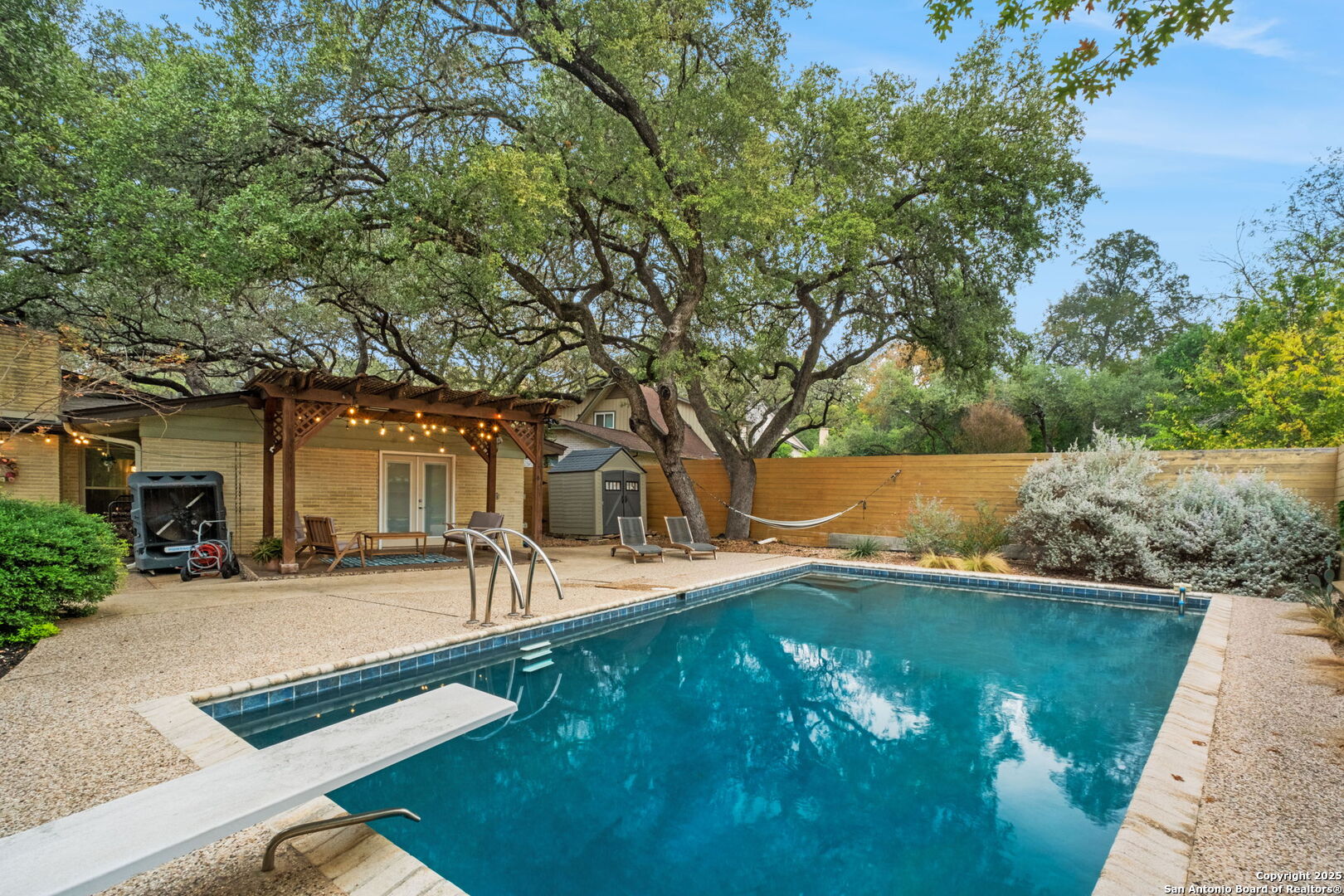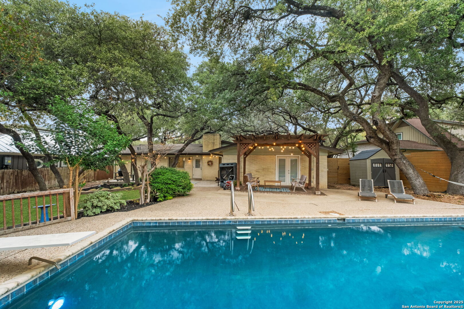 Welcome home to 10922 Whispering Wind, a beautifully updated, single-story retreat tucked into the peaceful, heavily treed Whispering Oaks community - the perfect place for anyone looking to plant roots. Step inside to an open, airy layout with soaring vaulted ceilings and elegant wooden-beam accents that lend a warm, welcoming feel. The heart of the home is a chef's dream: a modern kitchen with gas cooking, double ovens, and a generous waterfall quartz island - ideal for easy entertaining or cooking for loved ones. This home boasts three comfortable bedrooms and two bathrooms, offering relaxed, everyday living without the fuss. Outside, your private backyard oasis comes alive: a sparkling pool glistens under mature trees, while a shaded pergola invites mornings with coffee or evenings with family barbecues. The backyard also includes a shed with connected power - your workshop or crafting getaway. The two-car garage is multi-purpose; the homeowner has added air conditioning. When not storing your cars, use it as an office, gym, or anything you want! Beyond the backyard, the location shines. You're just minutes from essential conveniences - including H-E-B grocery, top-rated schools, the Medical Center, The airport, shopping, dining, and entertainment. Plus, this community offers optional HOA access to a pool and tennis amenities for added recreation. When it comes to dining and leisure, you're spoiled for choice: Pam's Patio Kitchen, Milano on Wurzbach, and Myrons Prime Steakhouse are just a few of the great eateries within one mile located on nearby Wurzbach Road, - perfect for a relaxed evening out. For outdoor enjoyment, the Salado creek greenway runs directly past the neighborhood offering miles of biking and hiking and connecting to many of San Antonio's storied outdoor spaces such as the renowned Phil Hardberger Park less than one mile away. Spread over 330 acres, this urban oasis features miles of trails, a nature-play area, butterfly garden, land-bridge, dog parks, and open fields - ideal for peaceful walks, birdwatching, or family picnics. At 10922 Whispering Wind, you truly get the best of many worlds: serene privacy and a comfortable, friendly space - all within a vibrant, well-connected North San Antonio neighborhood. Let this be the place where your next chapter begins.