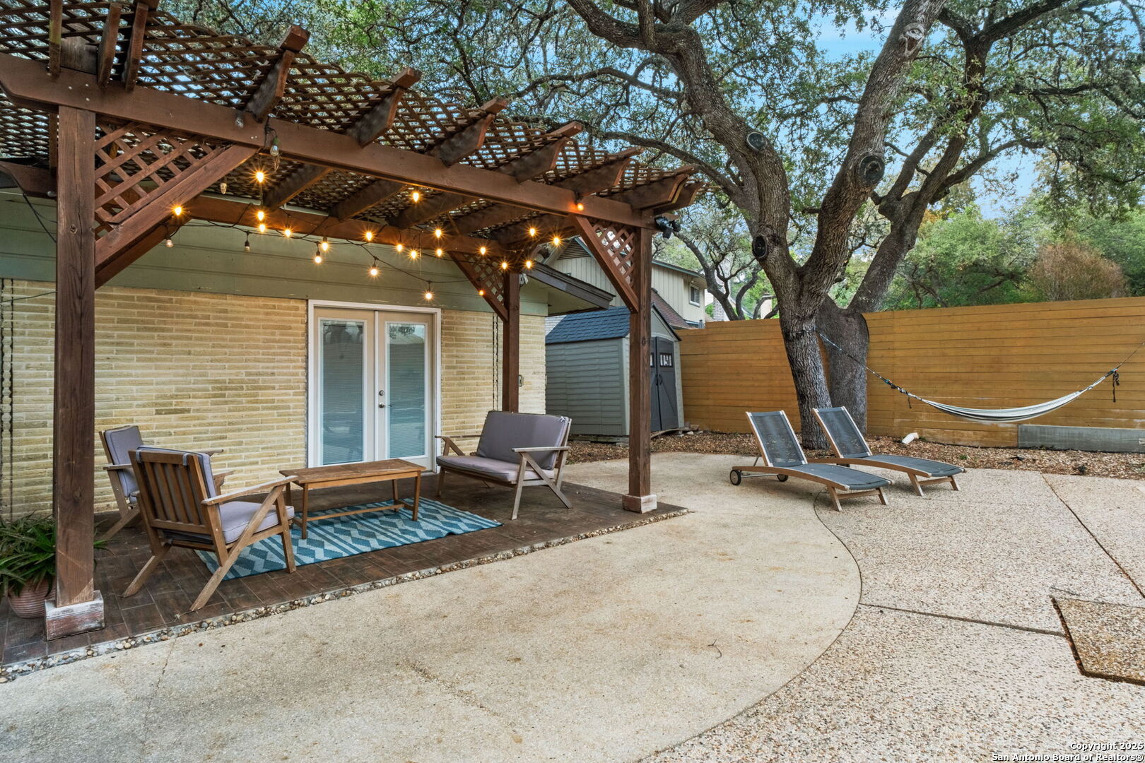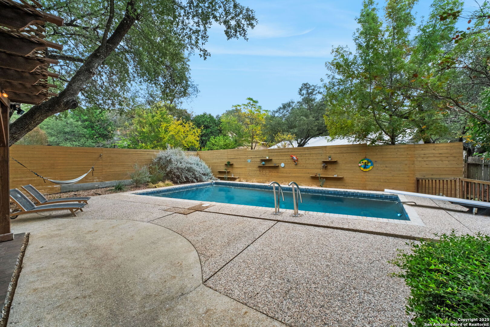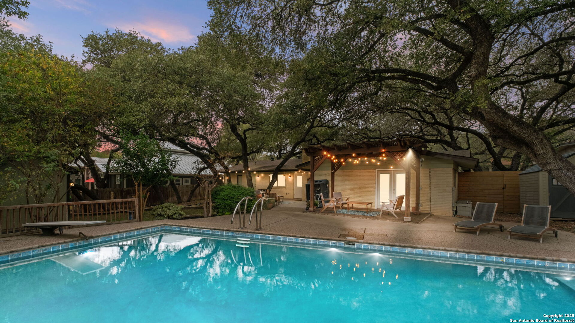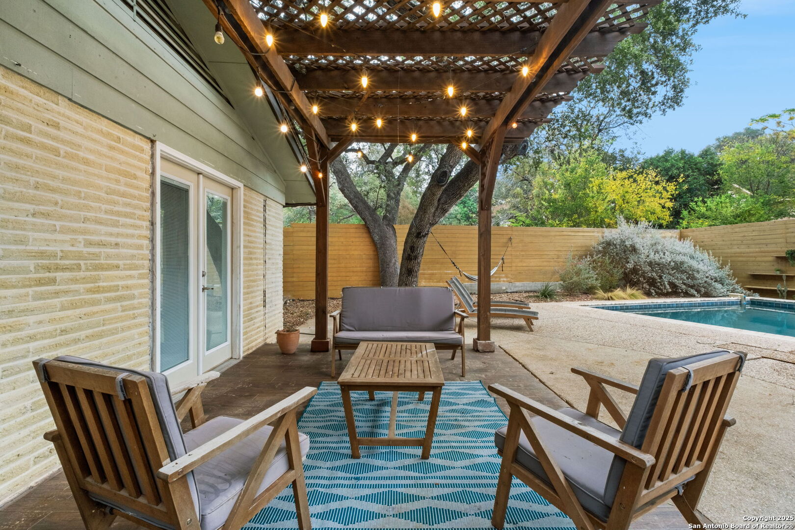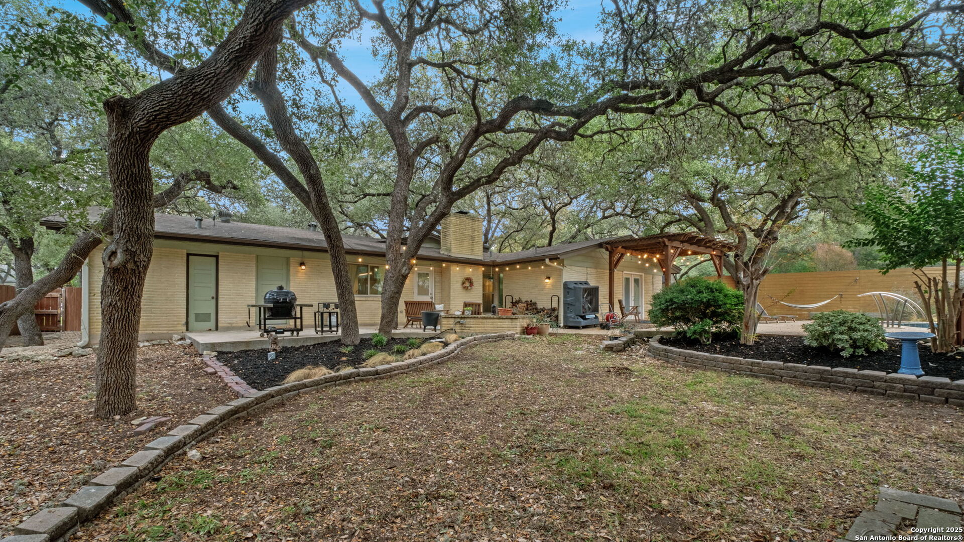 Welcome home to 10922 Whispering Wind, a beautifully updated, single-story retreat tucked into the peaceful, heavily treed Whispering Oaks community - the perfect place for anyone looking to plant roots. Step inside to an open, airy layout with soaring vaulted ceilings and elegant wooden-beam accents that lend a warm, welcoming feel. The heart of the home is a chef's dream: a modern kitchen with gas cooking, double ovens, and a generous waterfall quartz island - ideal for easy entertaining or cooking for loved ones. This home boasts three comfortable bedrooms and two bathrooms, offering relaxed, everyday living without the fuss. Outside, your private backyard oasis comes alive: a sparkling pool glistens under mature trees, while a shaded pergola invites mornings with coffee or evenings with family barbecues. The backyard also includes a shed with connected power - your workshop or crafting getaway. The two-car garage is multi-purpose; the homeowner has added air conditioning. When not storing your cars, use it as an office, gym, or anything you want! Beyond the backyard, the location shines. You're just minutes from essential conveniences - including H-E-B grocery, top-rated schools, the Medical Center, The airport, shopping, dining, and entertainment. Plus, this community offers optional HOA access to a pool and tennis amenities for added recreation. When it comes to dining and leisure, you're spoiled for choice: Pam's Patio Kitchen, Milano on Wurzbach, and Myrons Prime Steakhouse are just a few of the great eateries within one mile located on nearby Wurzbach Road, - perfect for a relaxed evening out. For outdoor enjoyment, the Salado creek greenway runs directly past the neighborhood offering miles of biking and hiking and connecting to many of San Antonio's storied outdoor spaces such as the renowned Phil Hardberger Park less than one mile away. Spread over 330 acres, this urban oasis features miles of trails, a nature-play area, butterfly garden, land-bridge, dog parks, and open fields - ideal for peaceful walks, birdwatching, or family picnics. At 10922 Whispering Wind, you truly get the best of many worlds: serene privacy and a comfortable, friendly space - all within a vibrant, well-connected North San Antonio neighborhood. Let this be the place where your next chapter begins.