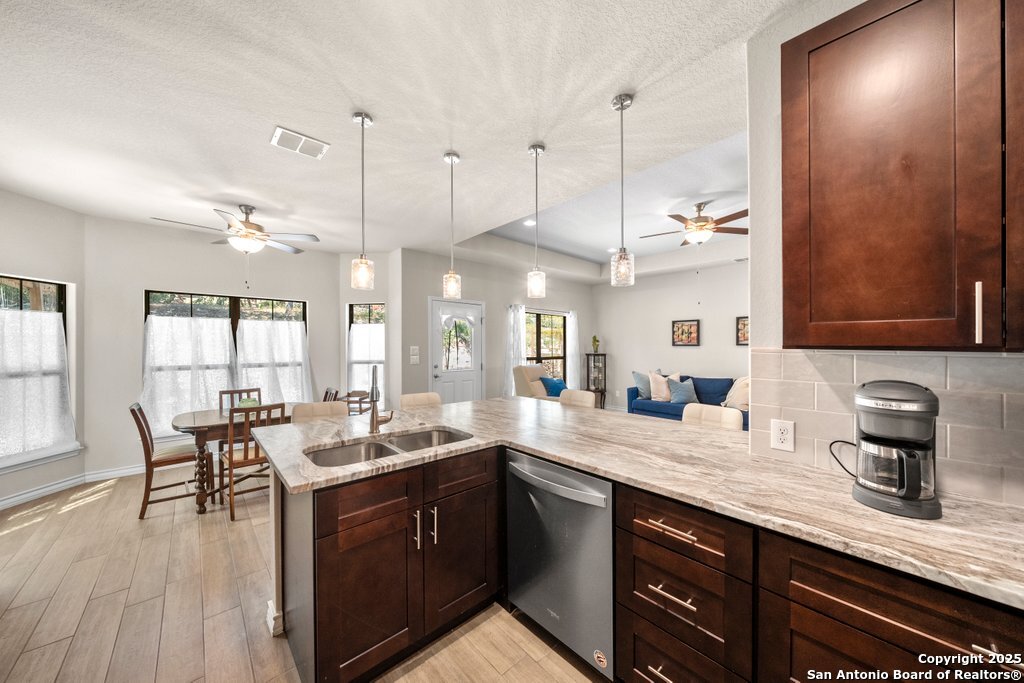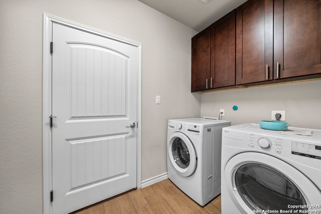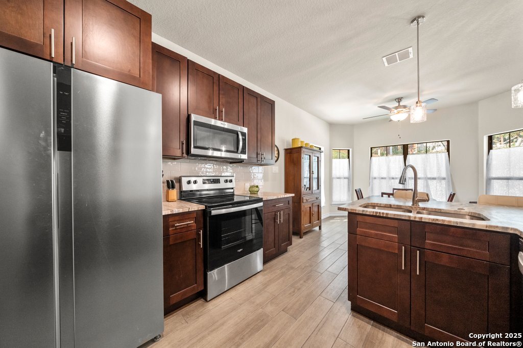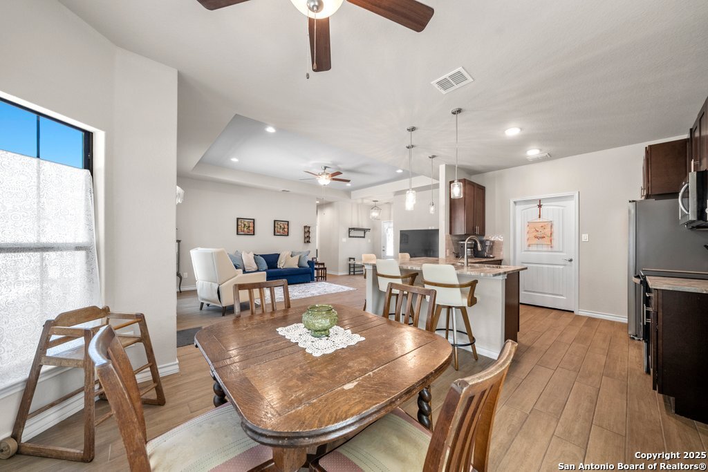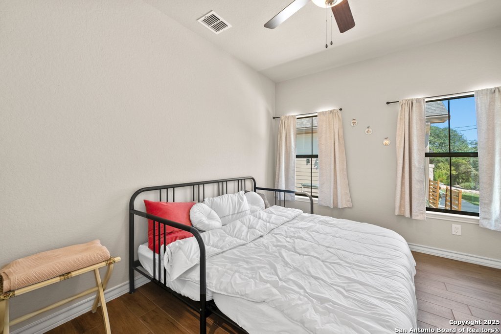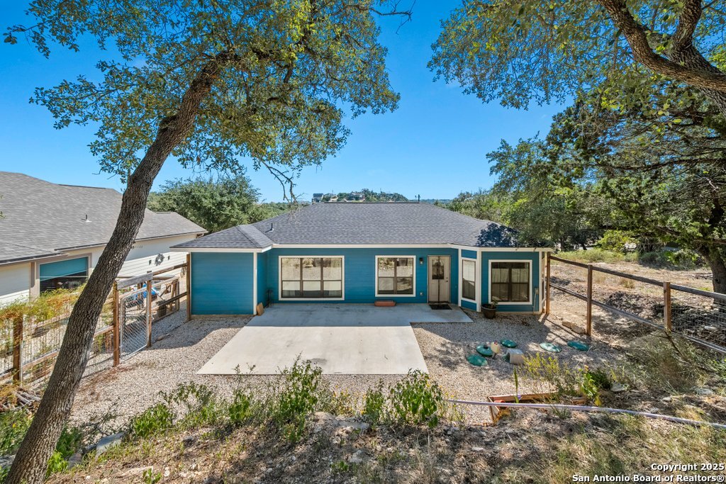 Like-New Move-In Ready Home with Hill Country Views - Attractively priced for immediate interest! Lightly lived in and used only for weekend getaways, this home feels practically brand new and is ready for immediate move-in. Enjoy breathtaking Hill Country views from an open, naturally lit floor plan featuring no carpet throughout and a charming bay window in the dining area. The kitchen is a true centerpiece, boasting custom cabinetry, a spacious island, and deep storage drawers designed for convenience and style. Refrigerator, Washer, and Dryer will convey with sale! Each bedroom includes its own walk-in closet, providing generous storage and comfort for every member of the household. The primary suite showcases elegant tray ceilings, while the secondary bedroom feature beautiful vaulted ceiling that enhance the home's airy, welcoming feel. Thoughtful details such as recessed lighting, ceiling fans, and extra-wide doors ensure both comfort and accessibility throughout. Step outside to a low-maintenance fenced backyard ideal for relaxing or entertaining, with an untouched second portion of the lot offering endless possibilities for natural vision or future usage. Meticulously maintained, move-in ready, and strategically priced to sale - this is the Hill Country home you've been waiting for!