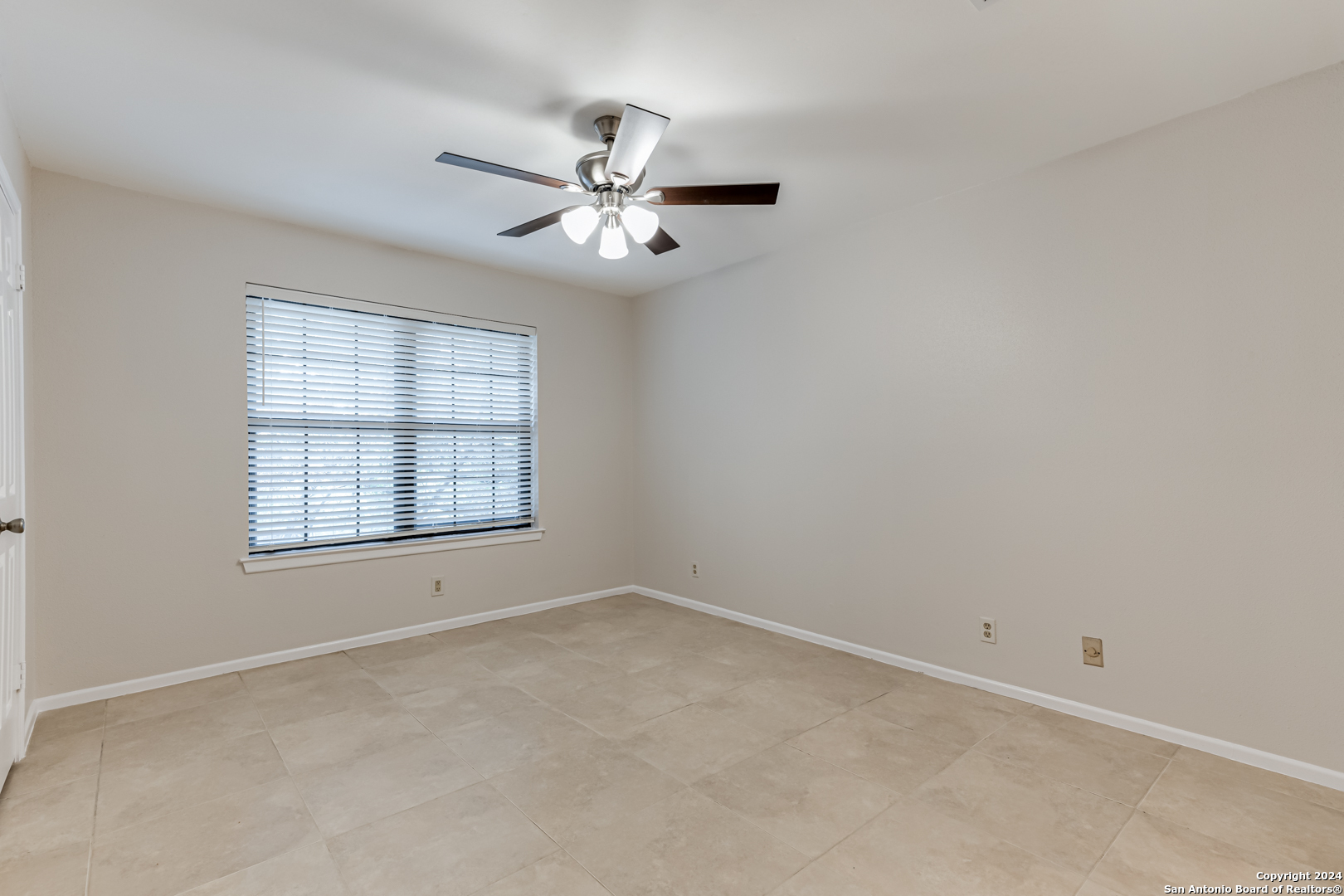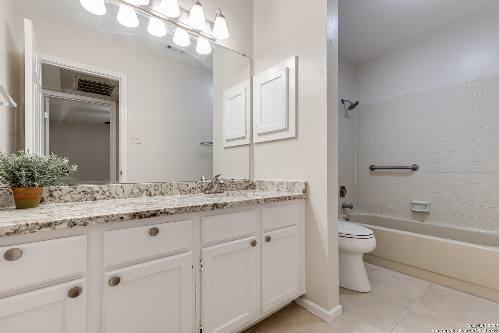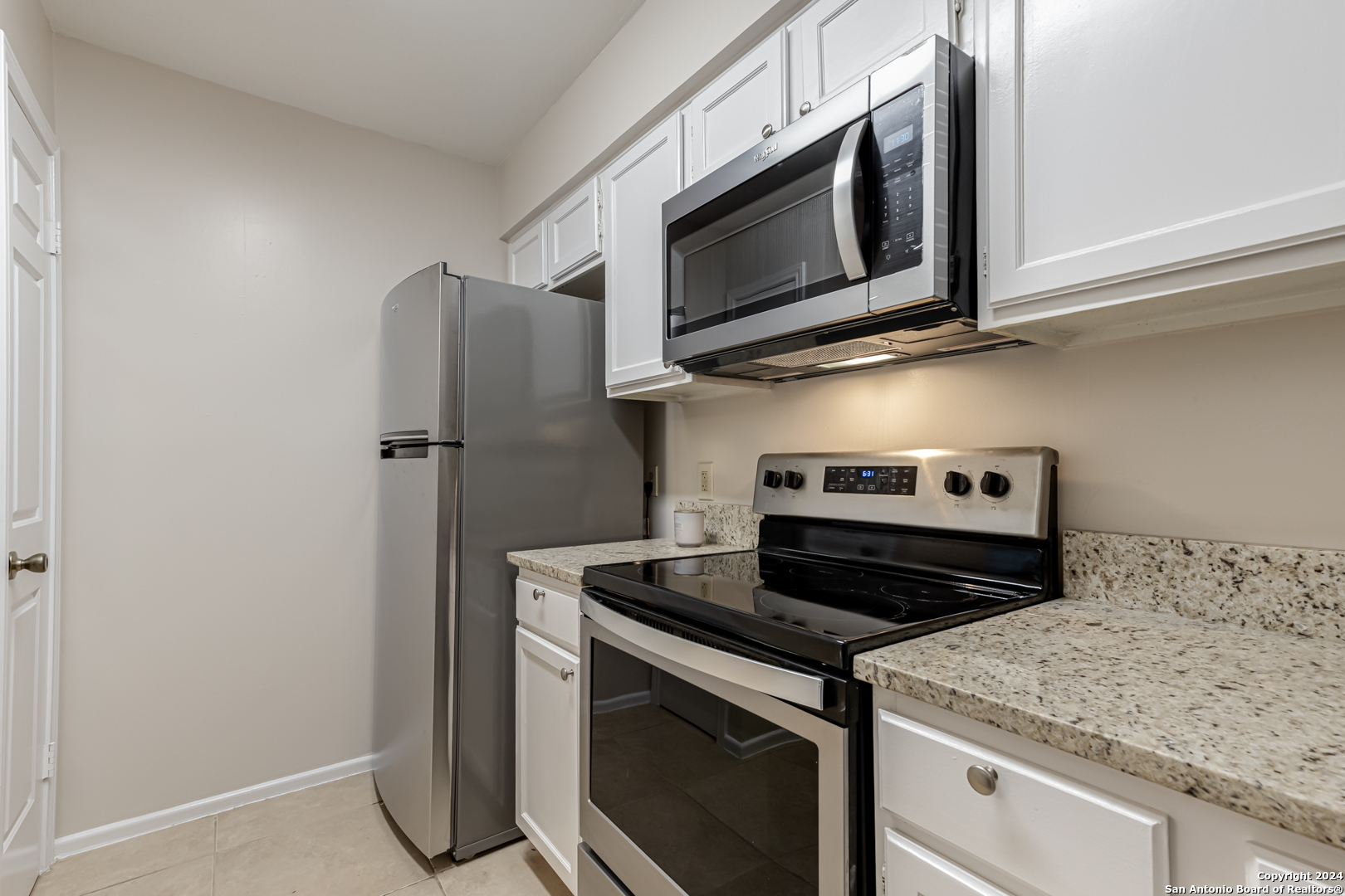 Wow! Renovated condo in Whisper Hollow. 2024 renovations costing $26,000 include all rooms completely painted, popcorn ceilings removed from all rooms, new granite countertops, sinks and fixtures in kitchen and both bathrooms, light fixtures and two fans with lights in bedrooms, kitchen microwave, dishwasher, garbage disposal and refrigerator. Levolor blinds in all rooms. Crown molding. Two new door frames and doors to bedrooms. No carpet! Tile floors. Inside AC unit/air handler replaced August 2024, including new thermostat, drain line and pan, $3,907. Exterior unit replace October 2019. Refrigerator (2024), washer and dryer convey, as is. Covered balcony overlooks beautiful pool. Other amenities include hot tub, clubhouse and tennis court. Priced well below BCAD. Close to Medical Center, USAA and UTSA.