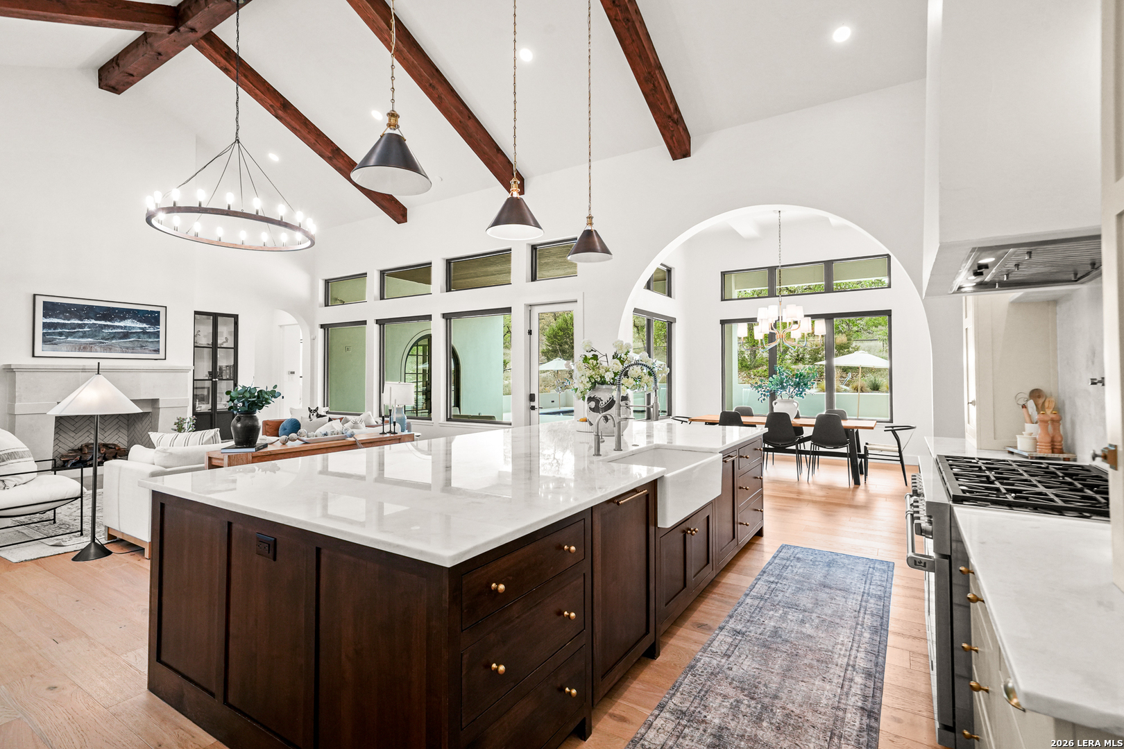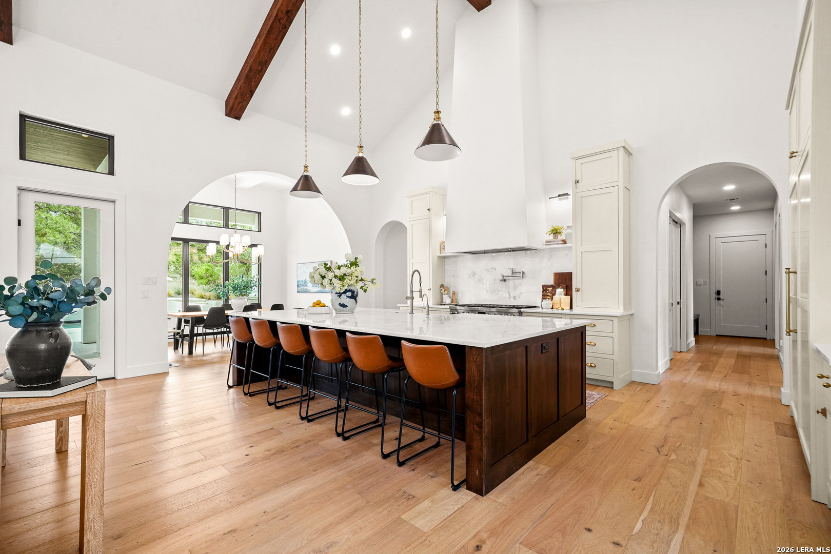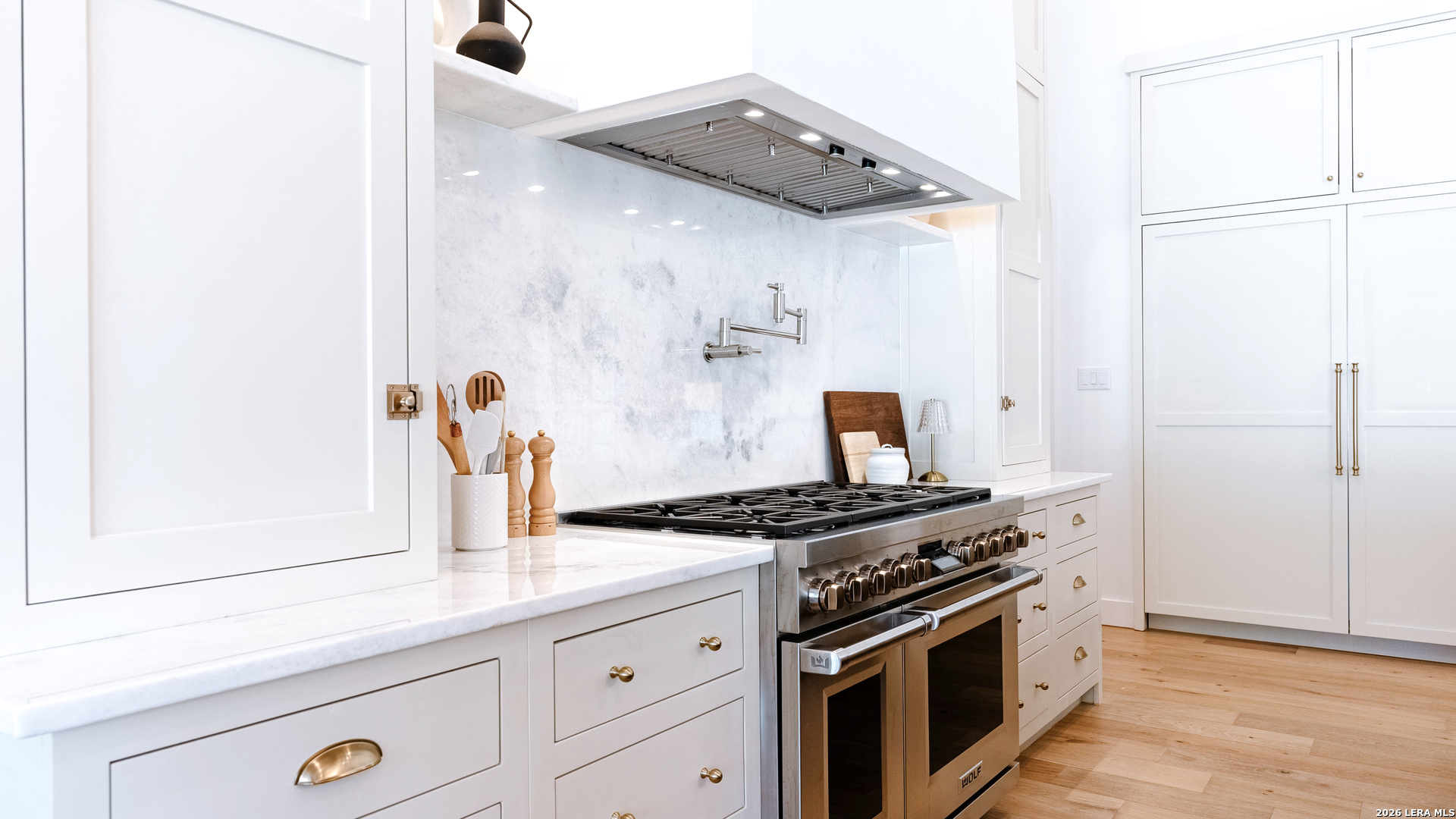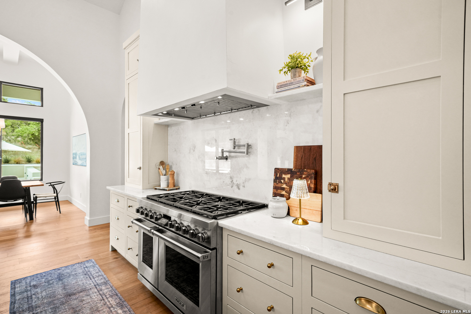 Tucked into the prestigious gated (and soon to be guarded) Pecan Springs community in Boerne, this exceptional modern European estate blends refined luxury with thoughtful, everyday functionality. Set atop a gentle hill with no rear neighbors, the home captures the serenity of Hill Country living while remaining just minutes from the charm of downtown Boerne and the premier shopping and dining destinations at La Cantera and The Rim. Designed for both elevated entertaining and comfortable living, this five-bedroom, five-bathroom residence showcases an expansive open layout anchored by an oversized island that is perfect for hosting. The chef's kitchen is outfitted with a built-in Sub-Zero 36" refrigerator and 36" freezer, a Wolf 48" double oven and range, plus an additional oven in the show-stopping butler's pantry which wouldn't be complete without a convenient "Costco door" from the garage for effortless stocking. The butler's pantry is truly a dream space, complemented by an oversized laundry room and an additional washer and dryer tucked within the luxurious primary suite closet. The serene primary retreat features a spa-like bath with a freestanding soaking tub, oversized walk-in shower, and private patio access for peaceful mornings or evenings. Flexible living spaces include a bonus room off the main living area, ideal as a home office or playroom, and a custom bunk room with four full-size built-in beds, perfect for guests or family gatherings. Step outside to your private resort-style oasis, where the outdoor living area seamlessly connects to a pool and spa, along with a full bathroom accessible directly from the exterior, perfect for entertaining. Energy-efficient solar panels with battery backup provide peace of mind during outages while helping reduce utility costs. Additional highlights include an oversized three-car garage with epoxy floors, abundant storage, and a tankless water heater. Residents of Pecan Springs enjoy scenic walking trails, with the neighborhood proudly selected to host the 2027 San Antonio Builder's Parade of Homes. This is Hill Country luxury redefined, where elegance, innovation, and comfort meet in one extraordinary home.