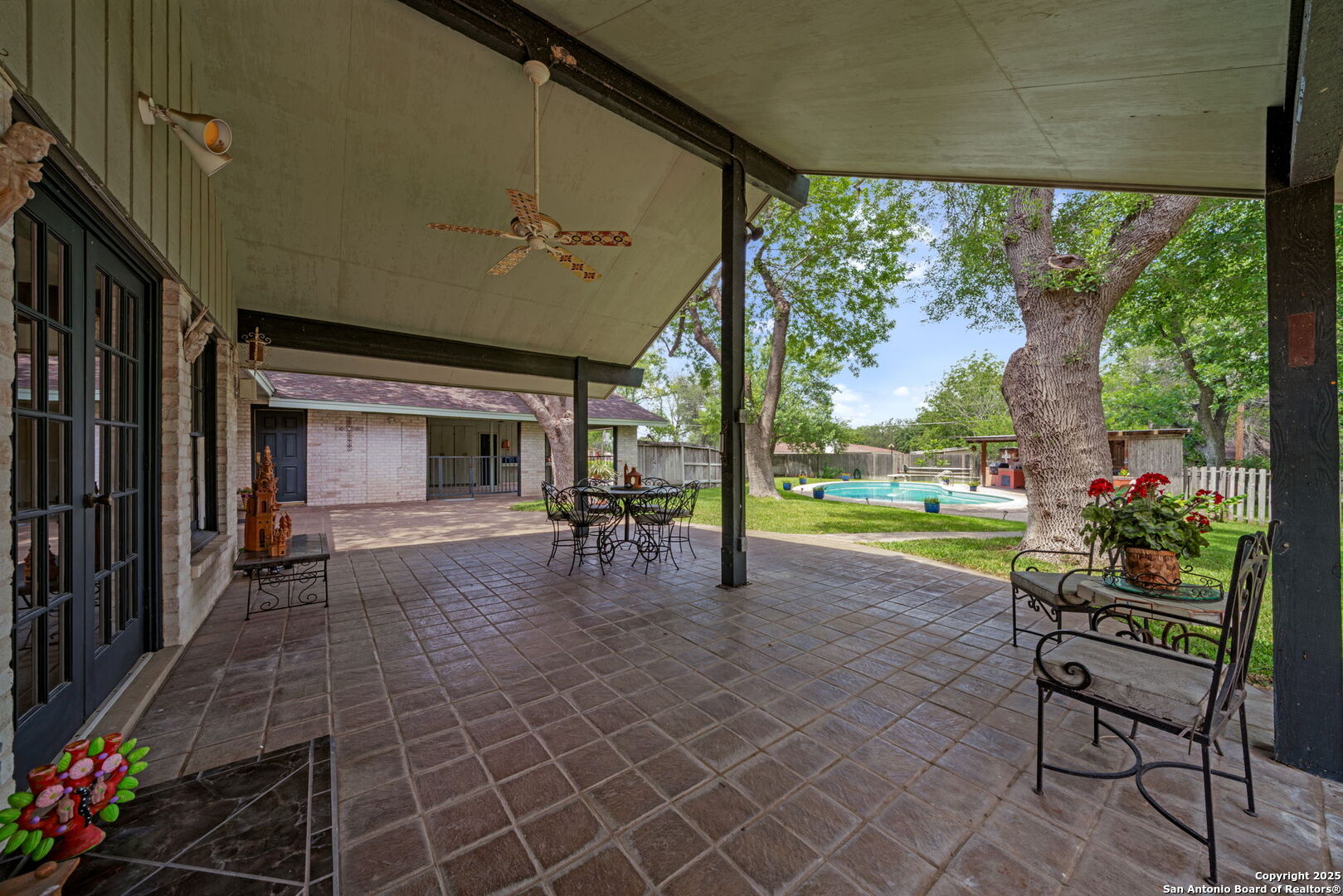 Spanish-Style Elegance on a 3/4 Acre Corner Lot. Nestled on a quiet cul-de-sac, this beautifully designed one-story home offers 4,665 sq ft of living space. Featuring 4 bedrooms and 4 full bathrooms, this property blends timeless character with spacious, modern functionality. Inside, you'll find two inviting living areas, a formal dining room, a dedicated office, and a large game room, providing flexibility for work, play, and entertaining. Rich architectural details, custom finishes, and natural light throughout highlight the home's craftsmanship and warmth. The kitchen is the heart of the home featuring effortless connection to indoor and outdoor living spaces. The primary suite is a true retreat, and each secondary bedroom offers privacy and space for guests or family. Step outside to your private retreat: a sparkling pool, covered cabana, and greenhouse with garden beds - perfect for relaxing weekends or vibrant gatherings. This home is a rare blend of square footage and soul - offering space to live, grow, and enjoy life's quiet and unforgettable moments.
