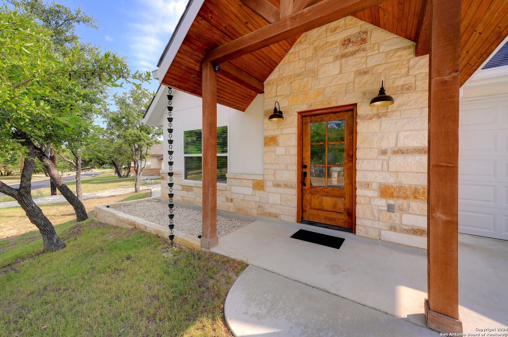 This custom-built farmhouse style home is absolutely stunning! With its luxurious features and attention to detail, it's sure to impress. The master bedroom downstairs, complete with a beautiful master bath featuring a luxury tub and shower, offers a relaxing retreat. The natural stone exterior in the front, stucco elsewhere, and covered front porch add to its curb appeal, while the oasis-like covered patio in the back creates a perfect outdoor space for relaxation and entertaining. The kitchen with matching stainless-steel appliances, granite countertops, spacious island and white cabinets is a chef's dream. The additional room upstairs provides flexibility for a small office or reading area, adding to the home's functionality. With its corner lot location, well-maintained floors, and seamless gutters with a rain chain, this home offers both style and practicality. Plus, the neighborhood's private road and proximity to Lakeside Golf Club make it an ideal place to call home!