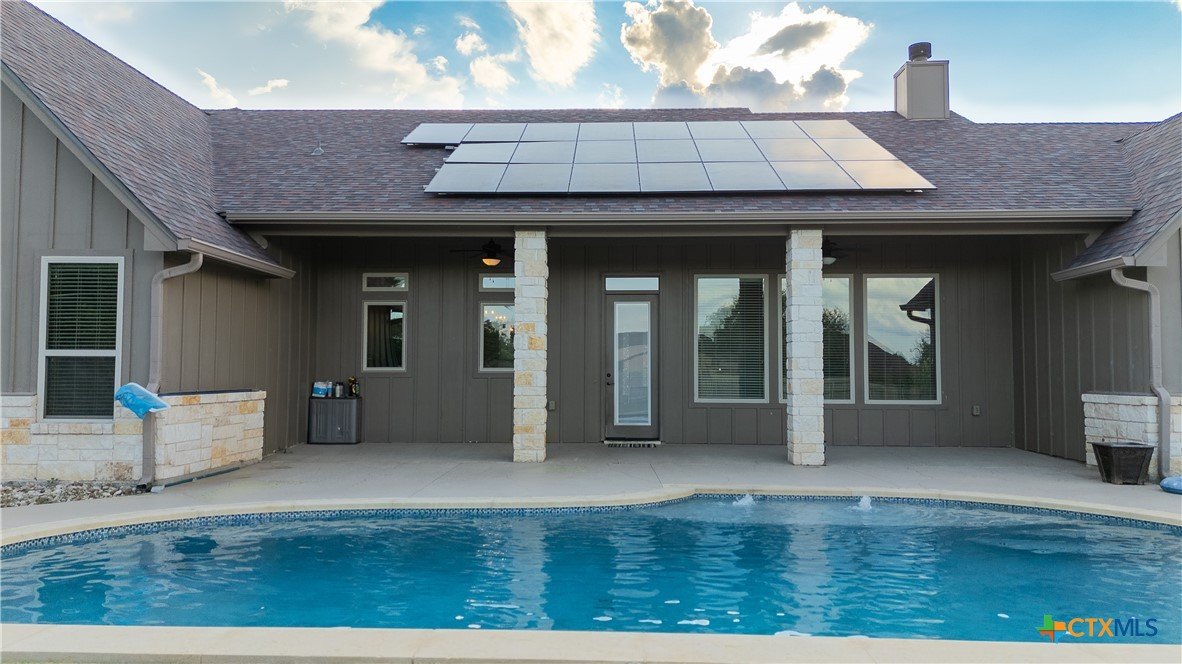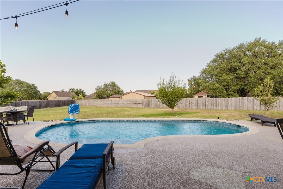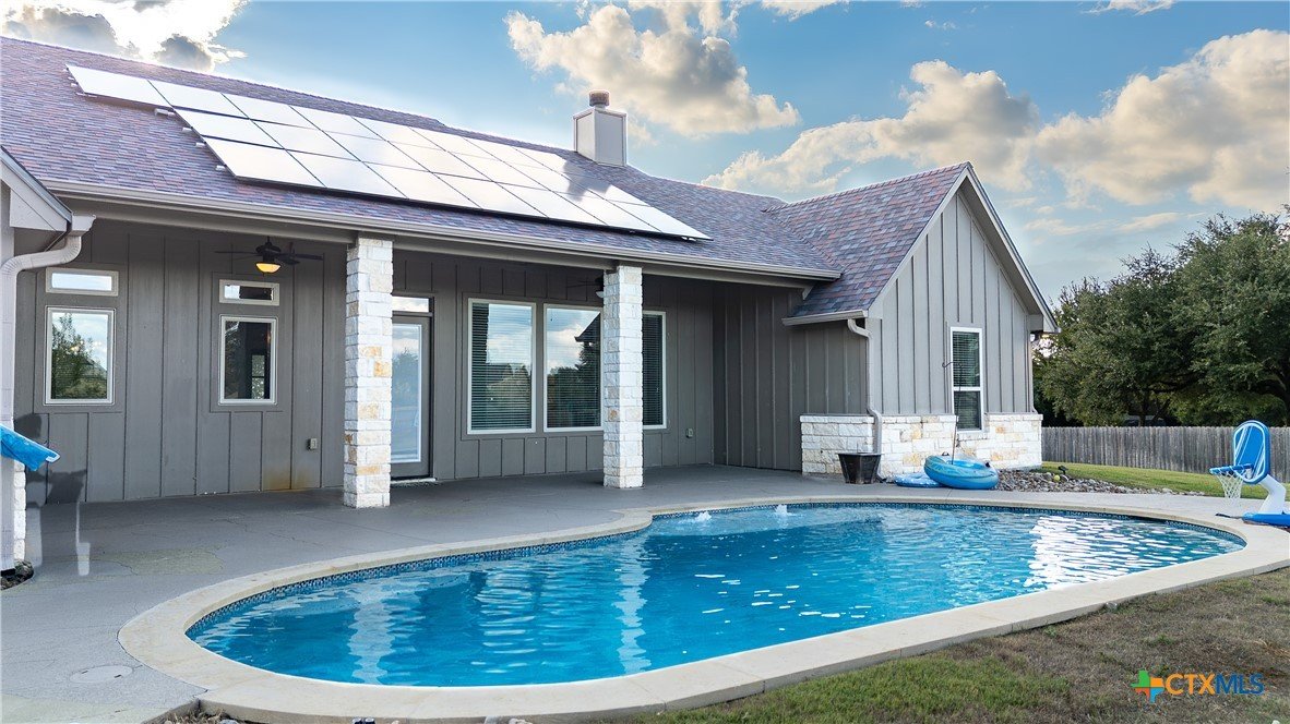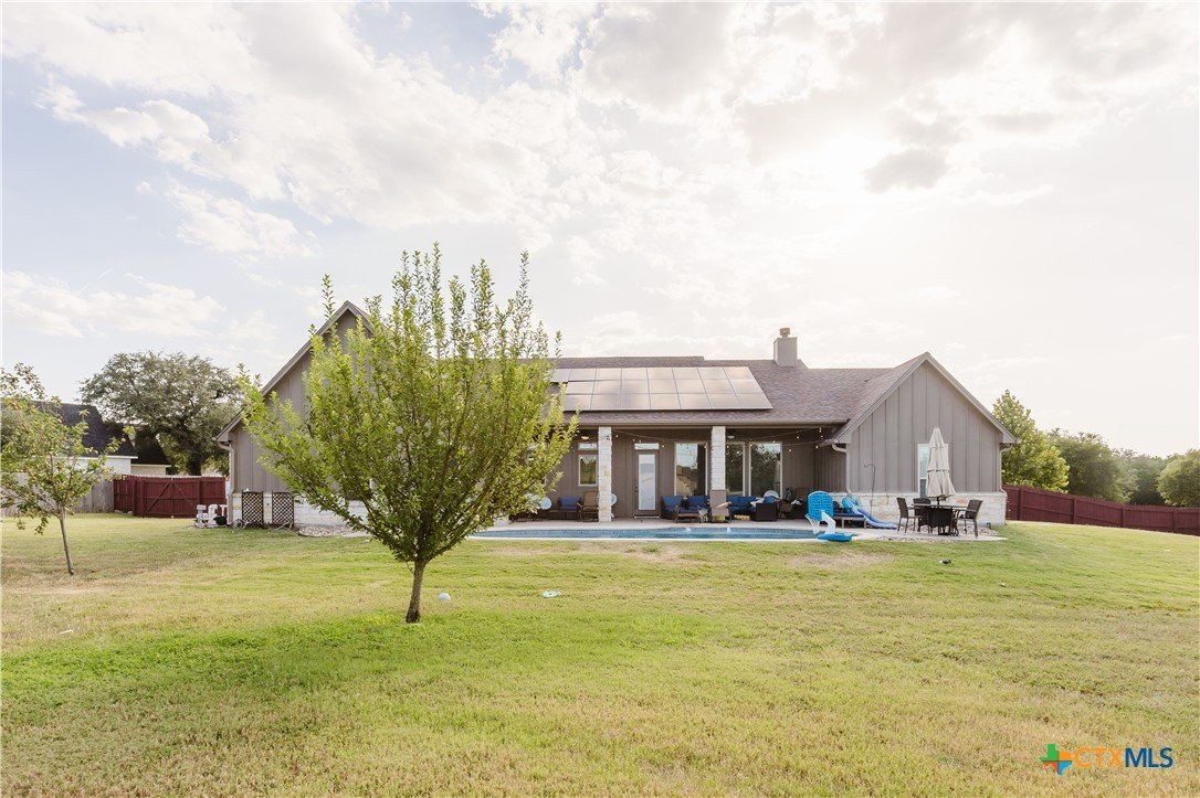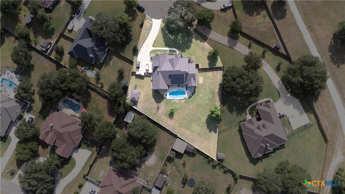 Located on a peaceful cul-de-sac in the heart of Salado, this beautifully designed home sits on a generous 0.7-acre lot and offers a true retreat both inside and out. From the sparkling backyard pool to the converted shed gym, every inch of this property is crafted with purpose and style. Inside, you’re welcomed by cathedral ceilings with wood beams that add depth and architectural interest. The polished, stylized concrete floors throughout the main living space set a bold tone, anchored by a stunning floor-to-ceiling stone fireplace that draws the eye and creates a warm focal point. The kitchen is large and functional, with granite countertops, extensive cabinet storage, and open sightlines to the spacious dining room and living areas—ideal for entertaining or daily life. The dining area easily accommodates large gatherings while remaining open and connected. Downstairs offers 4 bedrooms and 3 full bathrooms, including a guest bedroom with its own en-suite. The other two secondary bedrooms share a full bathroom with dual vanities. The primary suite feels like a private wing, complete with a garden tub, stone walk-in shower, dual vanities, and a massive walk-in closet that connects directly to an oversized laundry room with built-ins and a sink. Upstairs, a flex bonus room can serve as a media room, home office, or 5th bedroom. Additional highlights include a covered front porch, shaded back patio, side-entry garage, extended driveway, solar panels, central vac system and ceiling fans in every room for year-round comfort. All located within the highly rated Salado ISD, this home delivers unique finishes, generous space, and thoughtful features from top to bottom