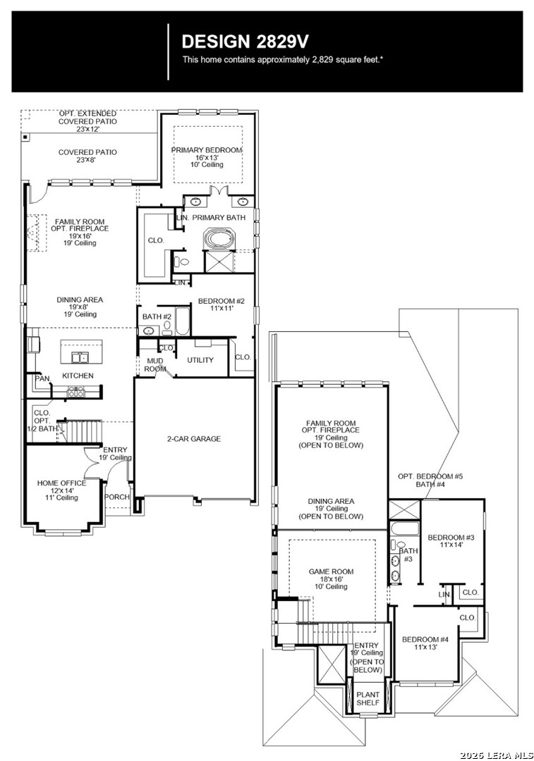 Home office frames entry with 19-foot ceiling. Family room offers a wall of windows and extends to dining area. Island kitchen with built-in seating space and a walk-in pantry. Private primary suite. Primary bathroom offers dual vanities, garden tub, separate glass enclosed shower and a walk-in closet. Additional bedroom on first floor. Second floor hosts a large game room and two bedrooms with walk-in closets. Utility room. Covered backyard patio. Mud room just off the two-car garage.