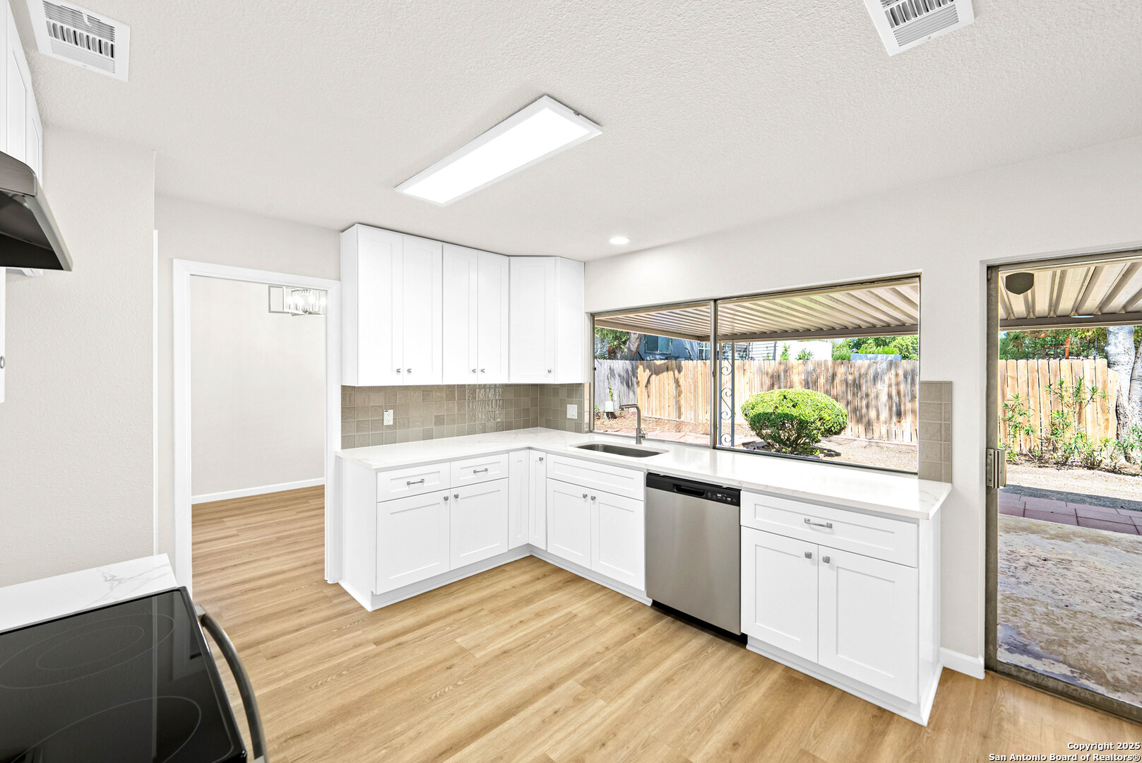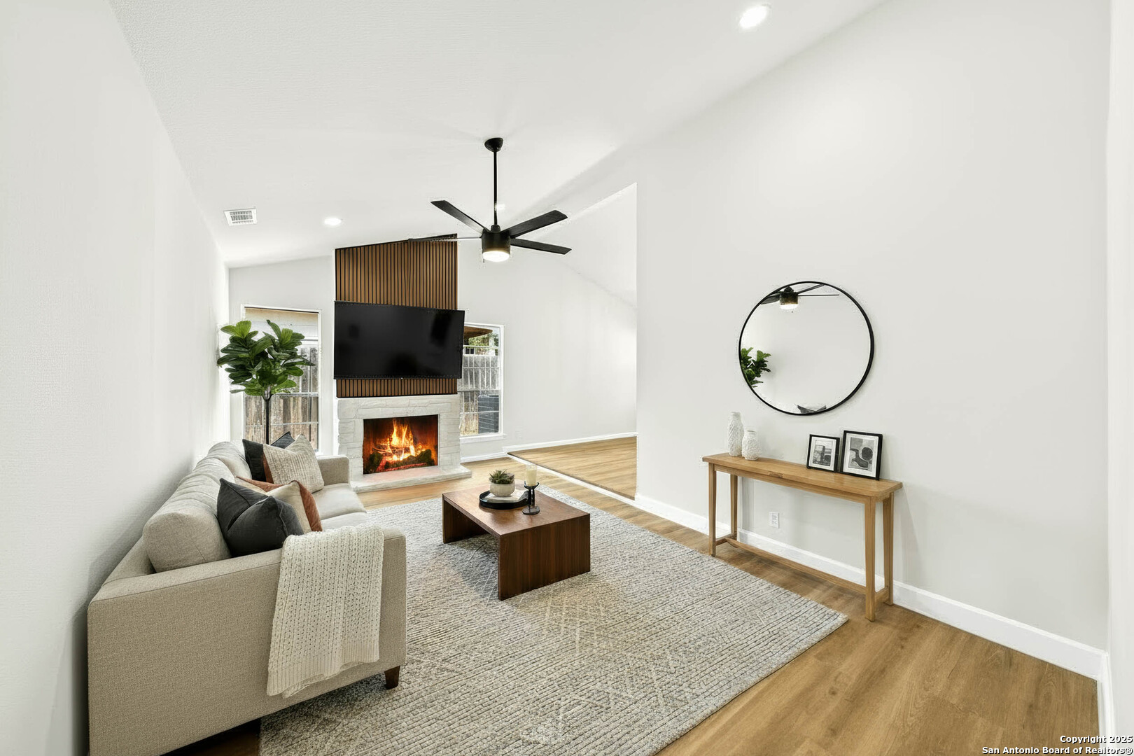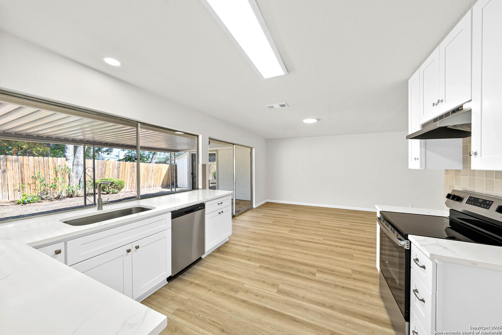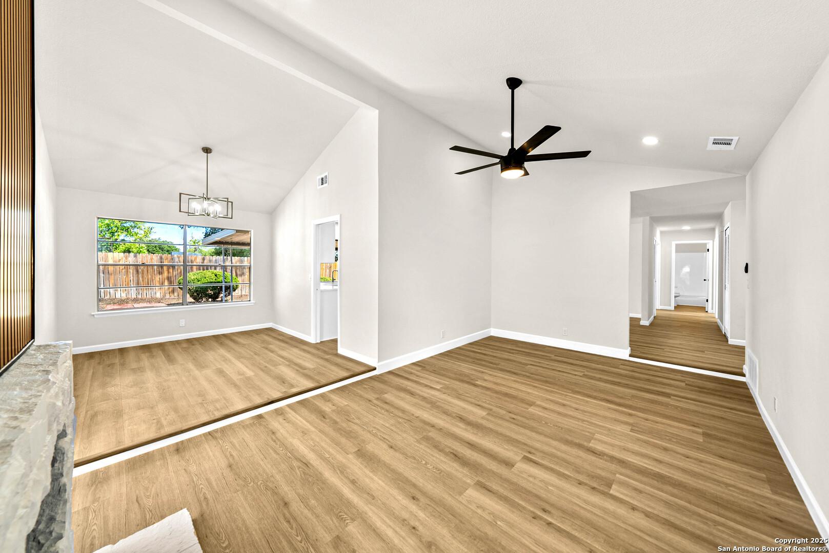 Welcome to 1106 Rio Linda St- a beautifully remodeled traditional home, where modern updates meet timeless charm. Featuring 3 spacious bedrooms and 2 full baths, this inviting residence boats an open-concept layout filled with natural light and new wood-like flooring. The living room offers soaring ceilings, a sleek accent wall with a cozy fireplace, and plenty of room for family gatherings. The bright kitchen shines with crisp new white cabinetry, stainless steel stove, quartz countertops, and a picture window overlooking the backyard. Enjoy meals in the charming dining area with vaulted ceilings and an elegant chandelier. A separate dining area also awaits for large gatherings perfect for hosting! Double doors welcome you into the primary bedroom with an expansive wall of closets that provide abundant storage. A stylish ceiling fan adds comfort and contemporary flair, while natural lighting peeks through a private outdoor access. The adjoining en-suite bath features a beautiful walk-in shower that showcases full-height tile walls and a sleek floor pan. Including a spacious double vanity with new quarts countertops, plumbing fixtures, and a large wall-to-wall mirror enhancing the sense of space and light, illuminated by recessed lighting above. This home provides the perfect blend of community and modern comfort. Schedule your showing today!