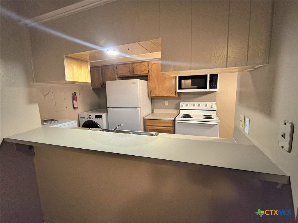 Welcome to your new home! This charming 2-bedroom, 1.5-bath unit in a well-maintained quadplex offers comfort, functionality, and convenience — perfect for individuals, couples, or small families. Featuring a bright & open living area. Enjoy the large living room with beautiful wood-style flooring, neutral tones, and natural light. A ceiling fan adds comfort year-round. The open layout flows seamlessly into the kitchen and dining space. The functional galley-style kitchen features ample cabinet storage, full-size appliances including a refrigerator, electric stove, microwave, and even a washer/dryer combo — all included for your convenience. A bar-height counter offers extra dining or prep space. The bathrooms are updated with a full tub/shower combo in the full bath, stylish lighting, and generous vanity storage in both baths. Over-the-toilet shelving and cabinets maximize organization. The large bedrooms are spacious and carpeted for comfort, with good closet space and natural light. Extras You'll Love: Private entrance, Under-stair storage closet, Central HVAC, On-site parking, Great Location – Convenient to major roads, schools, shopping, and dining, yet tucked away in a peaceful residential area. Qualifications are 3 x rent net income, good rental history(no evictions), reasonable credit, and a clear background (no violent convictions)