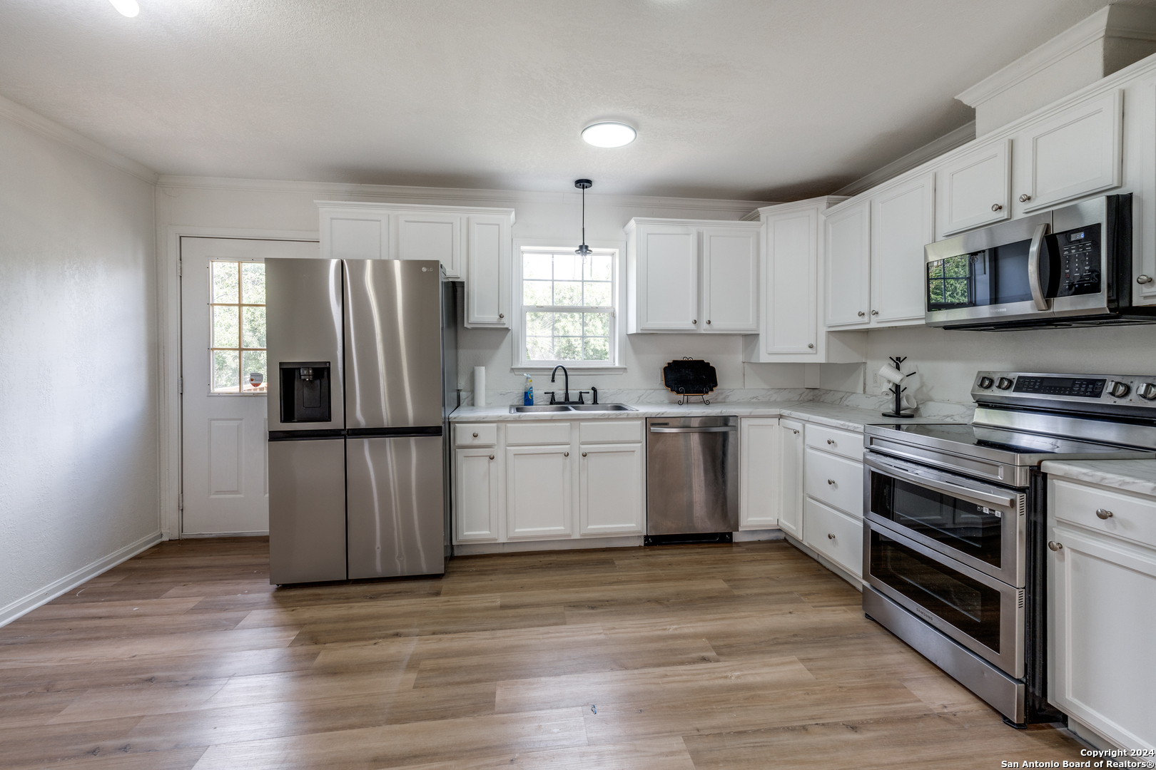 Main house is 1232 sqft and the detached dwelling is 288 sqft. Explore this inviting 3-bedroom, 2-bathroom home with an additional 2 separate rooms with versatile space, perfect for a guest bedroom or home office. Located in the peaceful town of Marion, TX 78124, this home offers a spacious, open floor plan that's ideal for comfortable family living. With features like luxury vinyl flooring, modern black light fixtures, stainless steel appliances, it's ready for you to move in. You'll also find a large 20x30 garage/workshop and a two-car carport with an extended concrete driveway.
