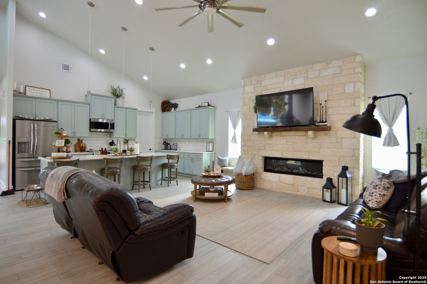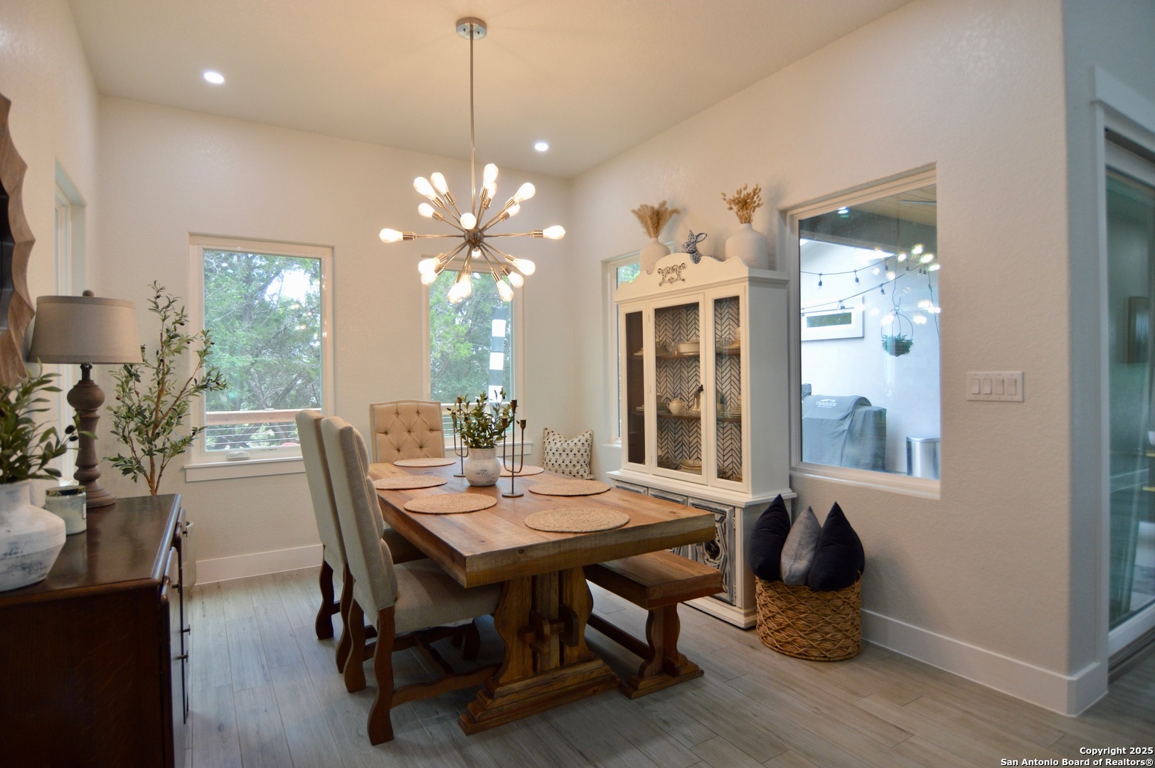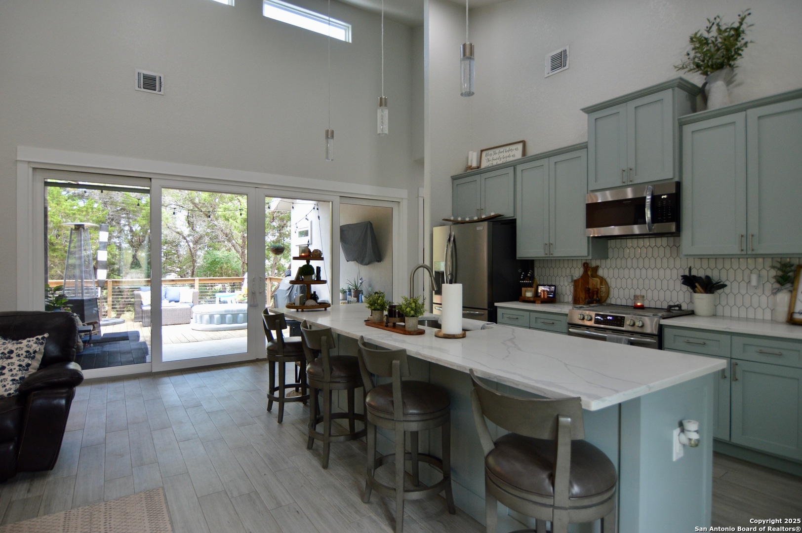 Nestled in the serene Mystic Bluffs community of Canyon Lake, this stunning 2,503 sqft home on a sprawling 1-acre lot offers the perfect blend of luxury and Hill Country charm. With 3 spacious bedrooms, 3 full baths, and 1 half bath, this single-family residence is ideal for families, entertainers, or those seeking a tranquil escape. Step inside to an open-concept living area with soaring ceilings, abundant natural light, and breathtaking views of the surrounding landscape. The gourmet kitchen is a chef's dream, featuring sleek quartz countertops, stainless steel appliances, and a large island perfect for gatherings. The primary suite is a private oasis with a spa-inspired ensuite boasting dual vanities and generous closet space. Two additional bedrooms, each with access to full baths, offer flexibility for guests or a home office. Outside, the expansive lot is an entertainer's paradise, featuring a large deck ideal for hosting and a custom backyard fire pit for cozy evenings under the stars. Surrounded by mature trees, the property provides privacy and ample space for future additions like a pool or garden. Enjoy the freedom of no HOA in this nicely maintained neighborhood, which benefits from basic restrictions to preserve its charm and appeal. Just minutes from Canyon Lake, you'll have easy access to boating, fishing, and hiking.