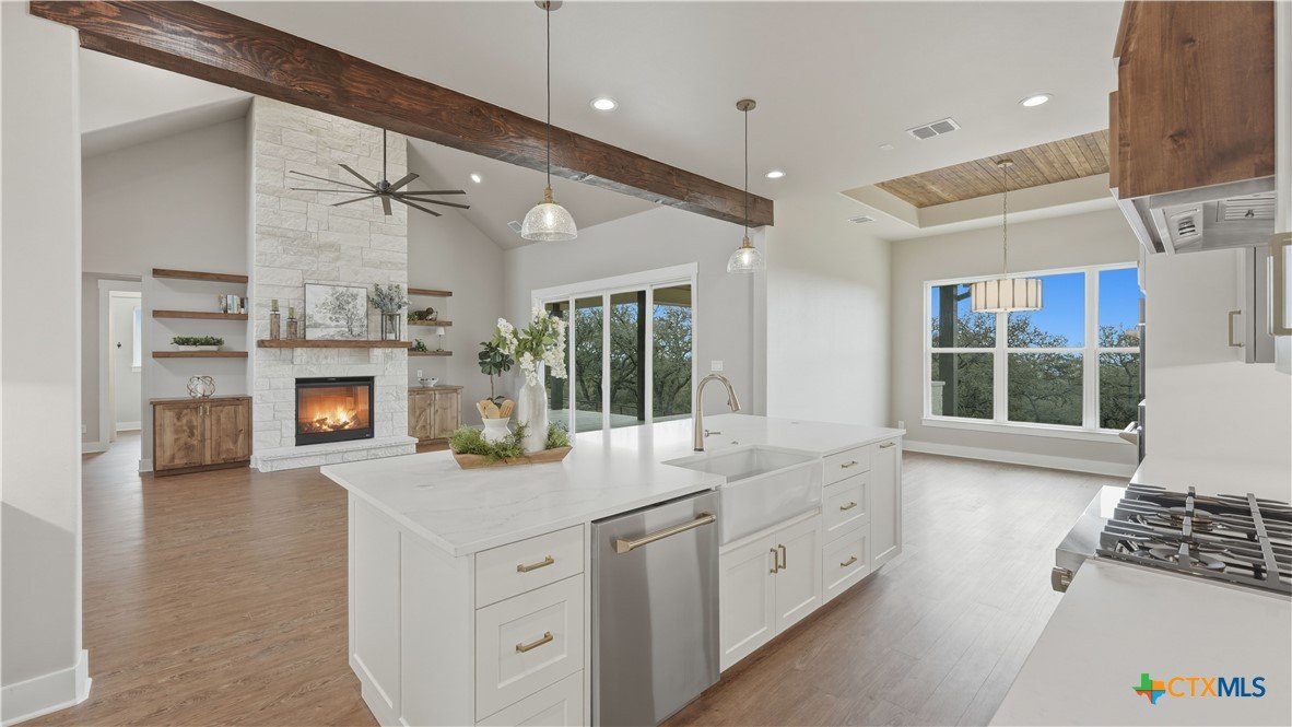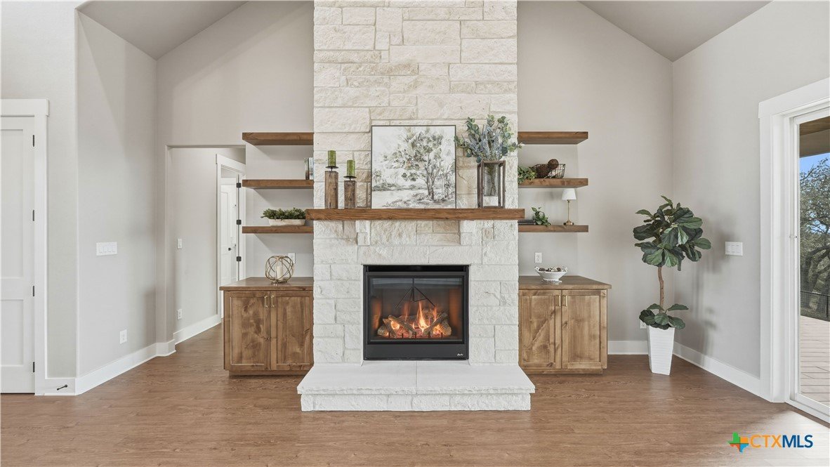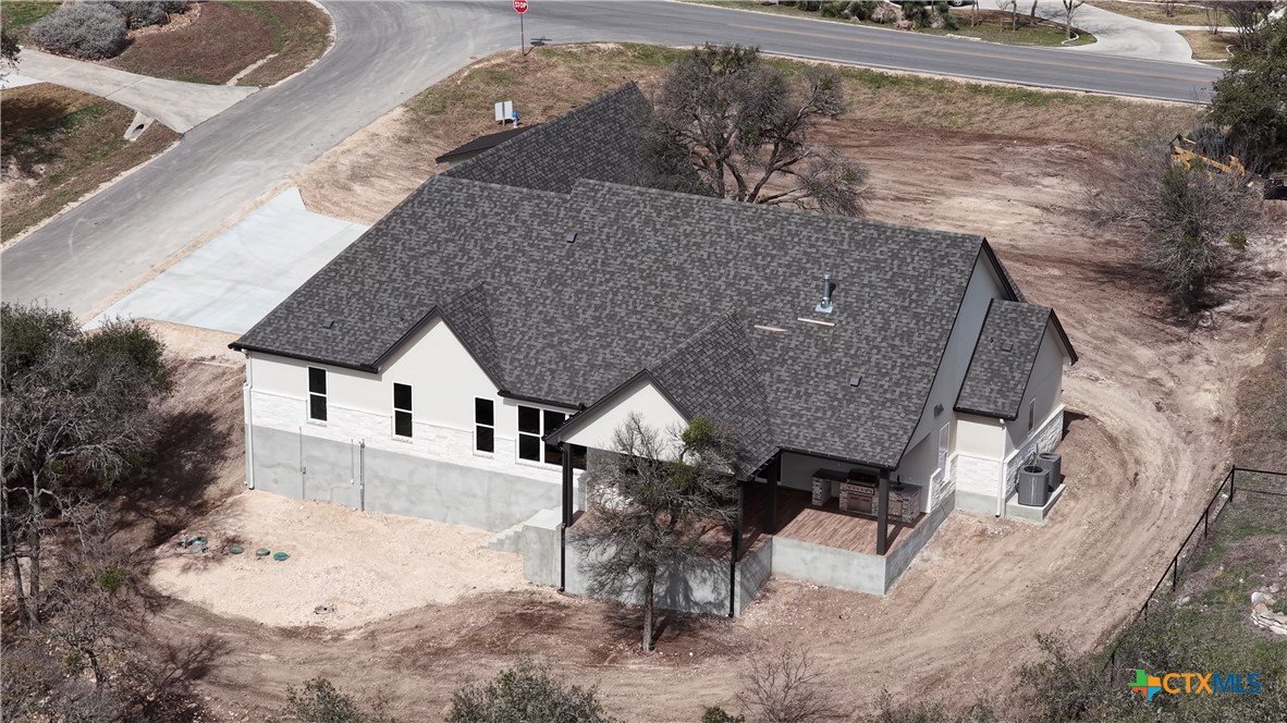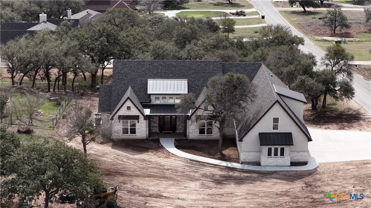 Welcome to this stunning new build in the beautiful Texas Hill Country. Located in the River Chase subdivision this luxury home boasts breathtaking views. The main floor features Mannington designer vinyl flooring, four bedrooms, jack and jill bath, powder room, a beautifully designed master suite, a large kitchen with white cabinetry, quartz counter tops, a large eat-in island, marble backsplash tile, gold fixtures, and Zline designer appliances. The walk-in pantry has butcher block counters and room for small appliances as well as dry goods. The living area features a gas fireplace, logs and a rock surround, flanked on both sides with stained alder cabinetry and shelving. The master suite has his and her closets, a tiled feature wall behind the soaking tub, two separate vanities, and a tiled walk-through shower. The upstairs game room spans the three car garage and features a closet and full bath. The exterior of the home is stucco and white rock, with bronze accents. The garage has one 18' and one 8' door both with garage door openers. The walk out covered patio features an outdoor kitchen, metal railings, and a full masonry gas fireplace. The Electric company is PEC, NBU water, and a private aerobic septic system. The River Chase POA has a river park with a covered picnic area on the Guadalupe River, a community clubhouse, pool, and tennis courts. Check out the video tour!