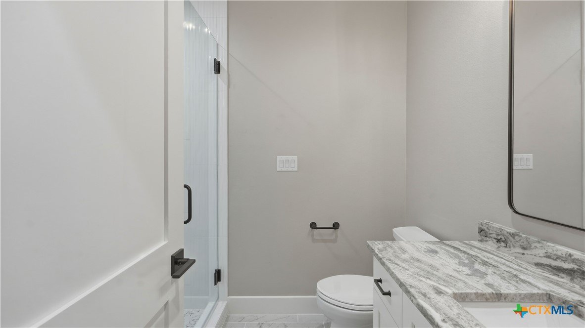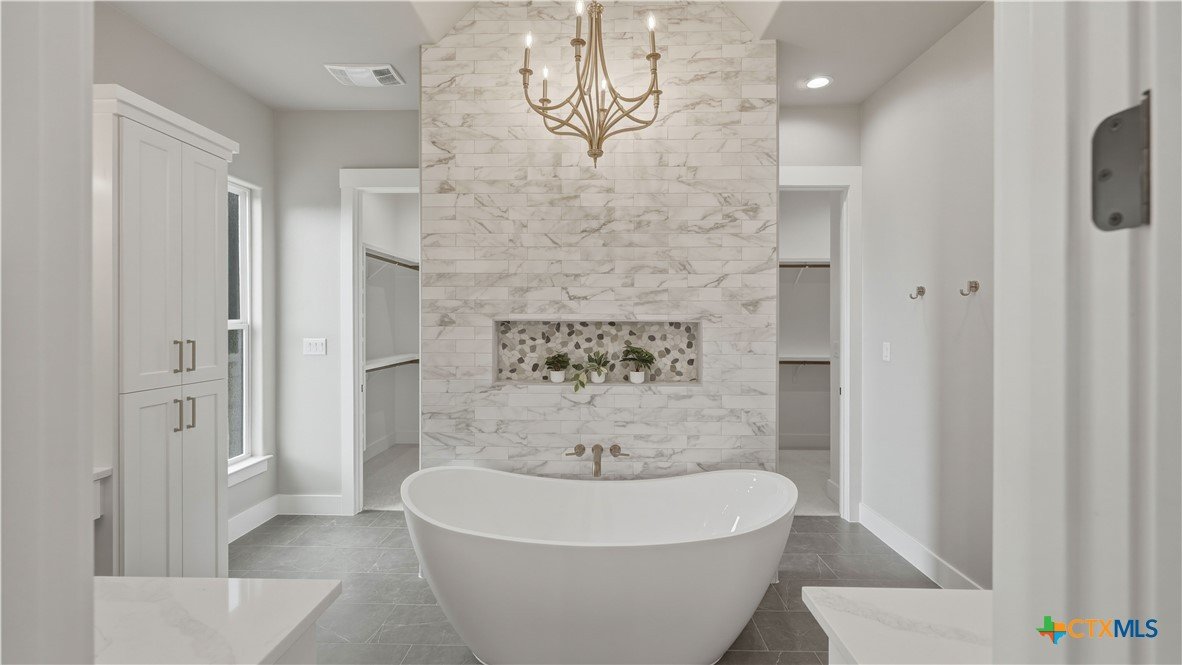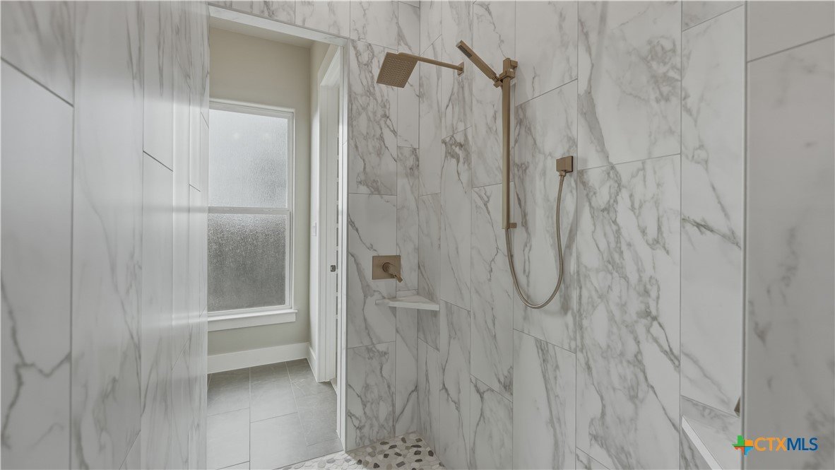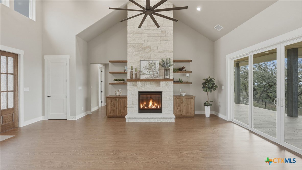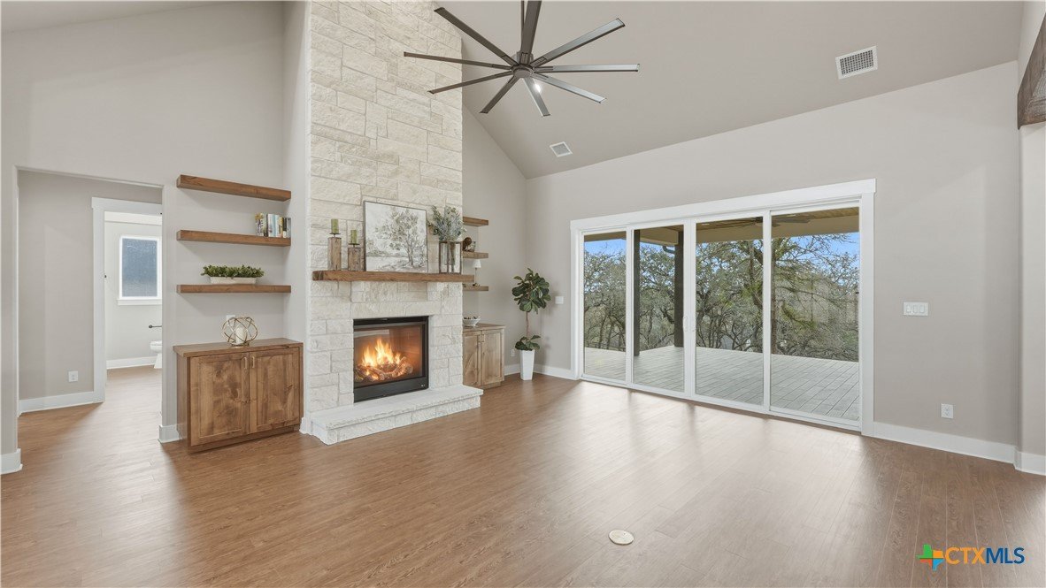 Welcome to this stunning new build in the beautiful Texas Hill Country. Located in the River Chase subdivision this luxury home boasts breathtaking views. The main floor features Mannington designer vinyl flooring, four bedrooms, jack and jill bath, powder room, a beautifully designed master suite, a large kitchen with white cabinetry, quartz counter tops, a large eat-in island, marble backsplash tile, gold fixtures, and Zline designer appliances. The walk-in pantry has butcher block counters and room for small appliances as well as dry goods. The living area features a gas fireplace, logs and a rock surround, flanked on both sides with stained alder cabinetry and shelving. The master suite has his and her closets, a tiled feature wall behind the soaking tub, two separate vanities, and a tiled walk-through shower. The upstairs game room spans the three car garage and features a closet and full bath. The exterior of the home is stucco and white rock, with bronze accents. The garage has one 18' and one 8' door both with garage door openers. The walk out covered patio features an outdoor kitchen, metal railings, and a full masonry gas fireplace. The Electric company is PEC, NBU water, and a private aerobic septic system. The River Chase POA has a river park with a covered picnic area on the Guadalupe River, a community clubhouse, pool, and tennis courts. Check out the video tour!