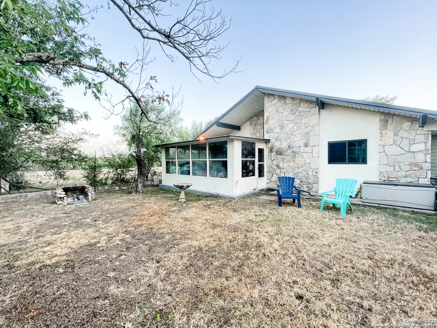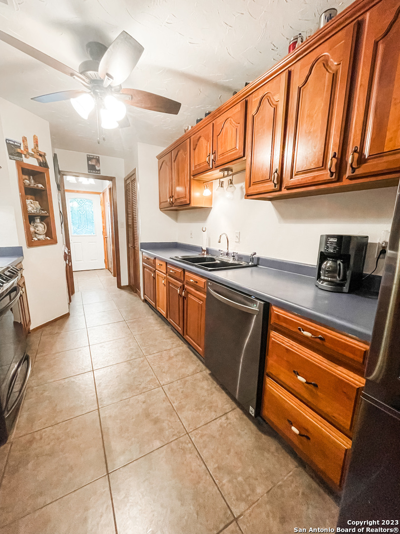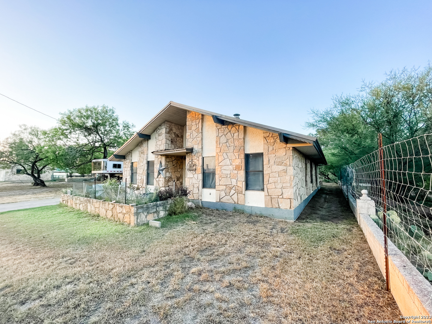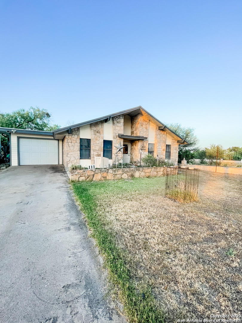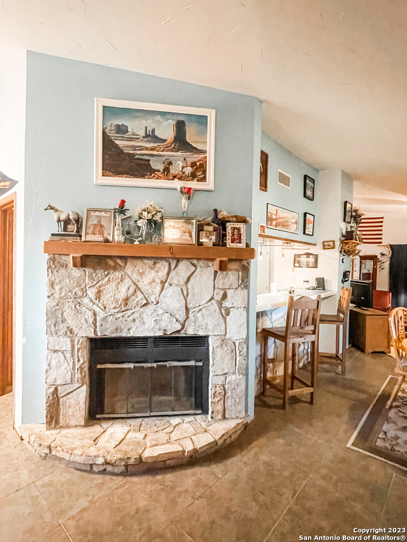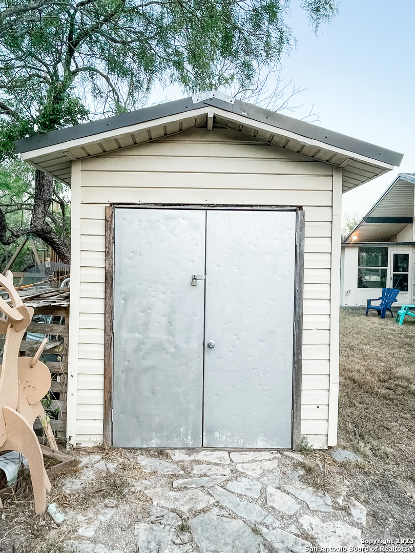 Located on the Historical Fort Clark Springs, this two bedroom two bath home is placed nicely on the end of Dawn Dr giving you plenty of privacy and open views from the front of your home. Enjoy the vast amount of wildlife the Fort offers as they graze across the way in the open green space. This home offers a newly added on one car garage, a storage shed in the backyard, a large "green room" with windows form floor to ceiling that could also make for an office with the quick install of a window unit or mini split. As you enter you are welcomed with vaulted ceilings and a wonderful wood burning fireplace perfect for those cool nights. The kitchen offers ample storage throughout as well as a walk-in pantry. The dishwasher and stove/range are brand new and convey with the property. The master bedroom was renovated with his and her closets added by the current owner along with a complete bathroom make over. The HVAC system is newly installed as of early 2023.