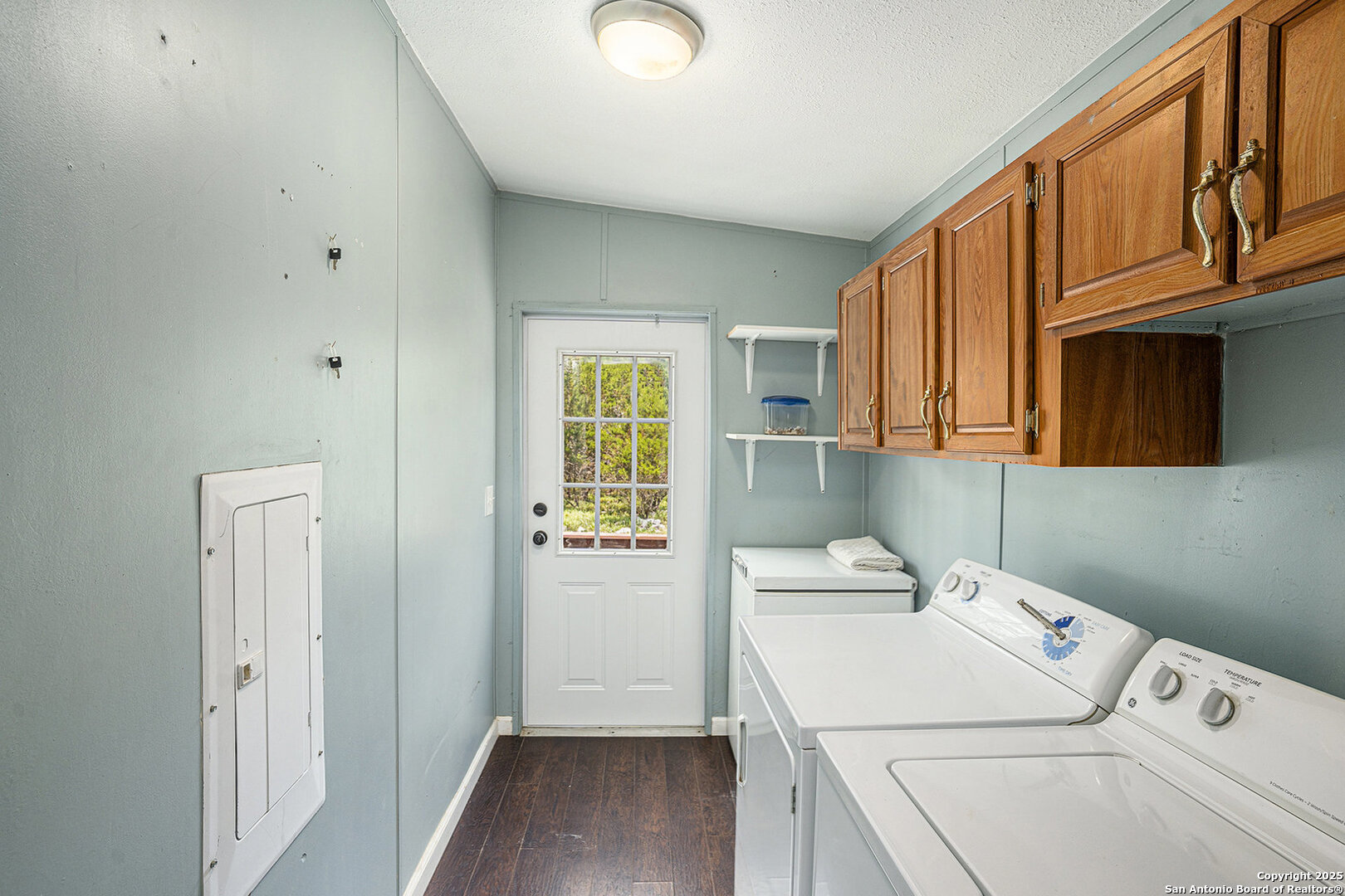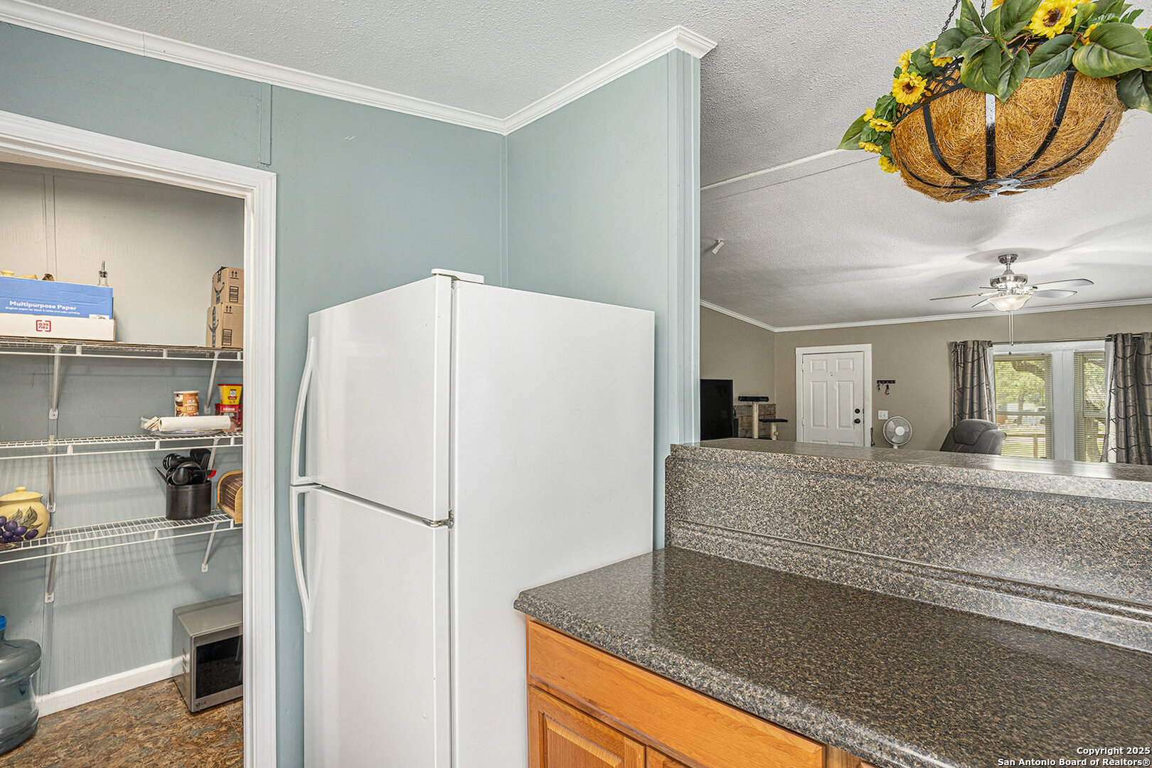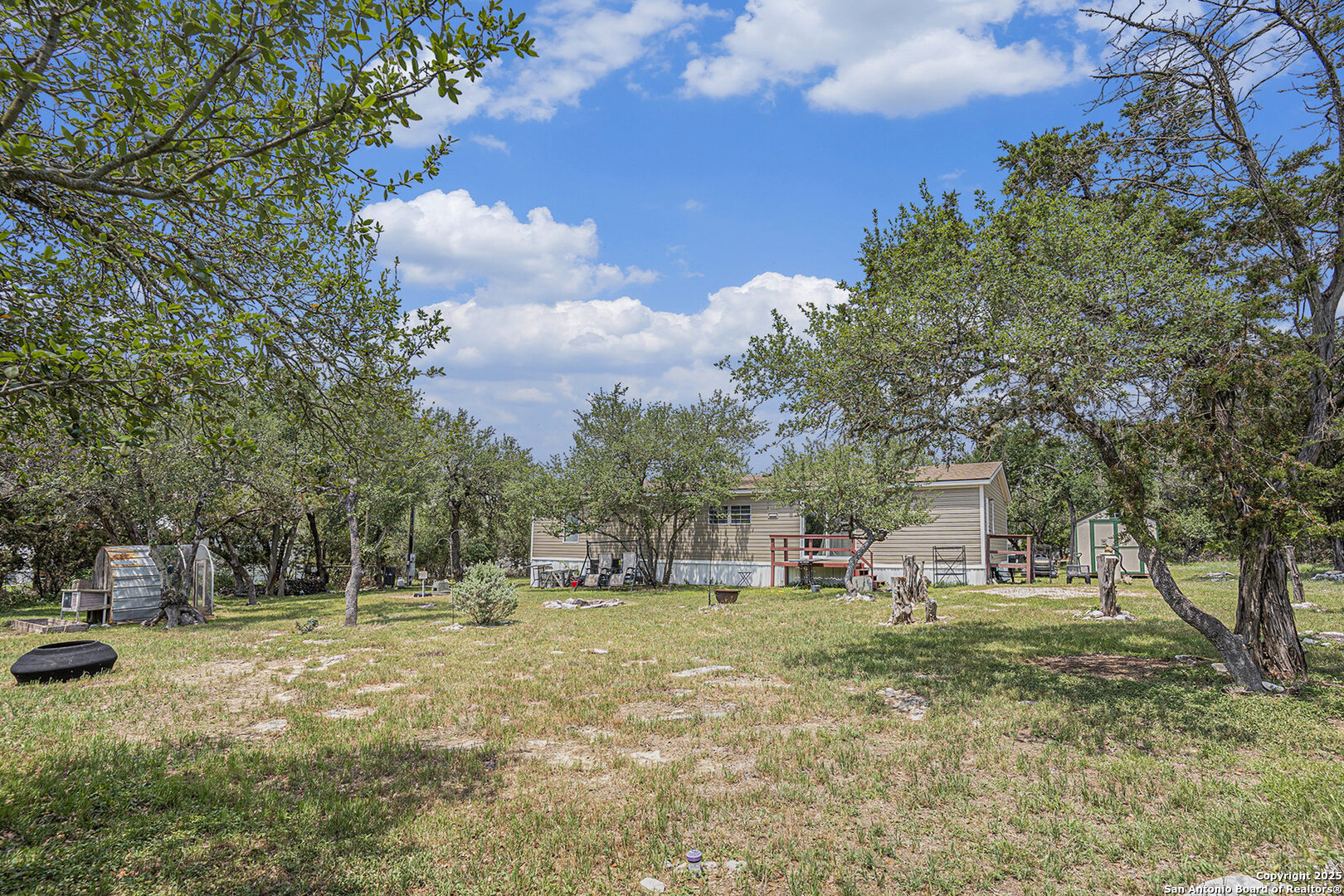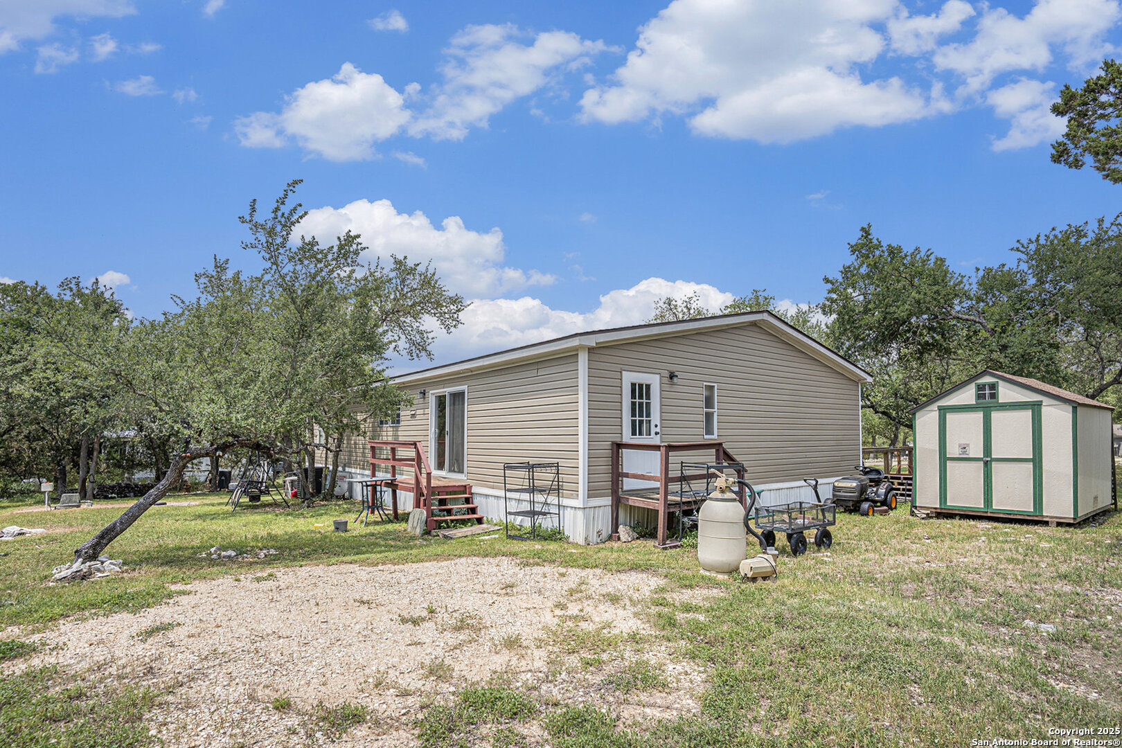 Welcome Home! Experience affordable hill country living in this beautifully maintained 3-bedroom, 2-bath manufactured home, situated on just over an acre and backing up to 1,000 acres of scenic landscape. The spacious primary suite features a large walk-in closet and a private ensuite bath. New sliding glass doors in the dining area open to expansive backyard views, bringing the outdoors in. The open-concept kitchen offers generous cabinet space, a walk-in pantry, and flows effortlessly into the living room-perfect for gatherings and everyday living. Comfort is key with a brand-new A/C unit for year-round climate control. The laundry room adds convenience with extra cabinetry and direct outdoor access. Recent upgrades include NEW heavy composition roof, new vinyl siding, crawl space skirting, and new double pane windows! Outdoors, you'll find a fenced front yard, a new covered porch, a storage shed, and daily visits from friendly deer and local wildlife. Located just outside city limits, this peaceful property is only 15 minutes from I-35 and Texas State University, and within 30-45 minutes of both Austin and San Antonio. With a low tax rate, nearby playground access, and move-in-ready condition, this is hill country living at its best!