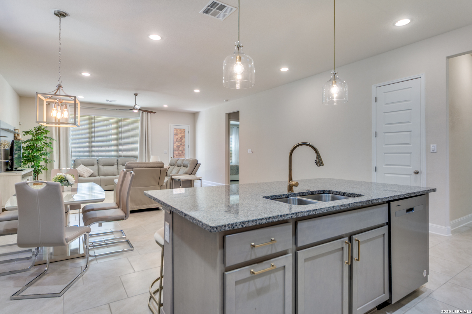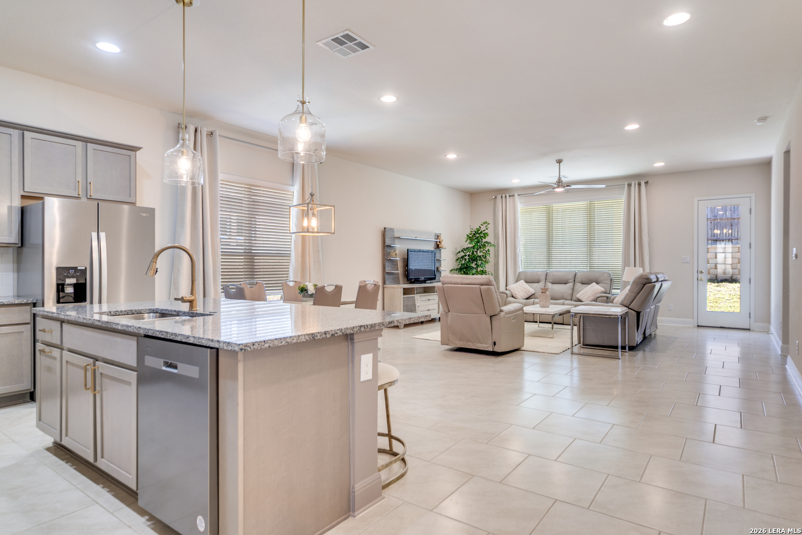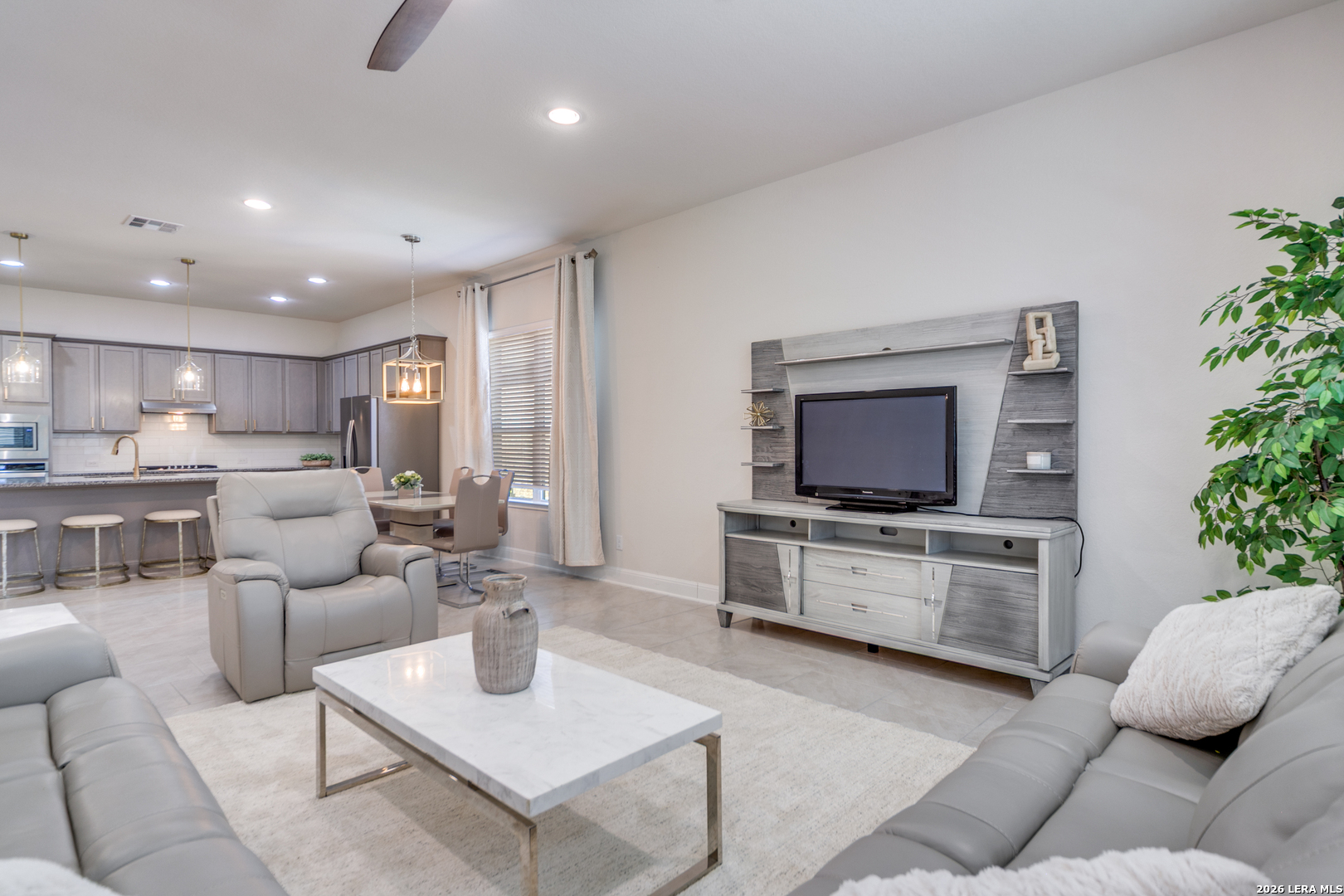 Welcome to 1114 Aidenbaum. Nestled within the desirable gated community of the Enclave at Kinder Ranch, and located in the beautiful Sunday Creek section just across the street and within walking distance to both the middle and high school, this stunning single-story residence built in 2022 offers a seamless blend of modern Hill Country style and everyday convenience. Featuring 4 spacious bedrooms and 3.5 baths, the thoughtfully designed open-concept layout is ideal for both refined entertaining and comfortable daily living. The gourmet kitchen anchors the home with an expansive island, sleek solid-surface countertops, and built-in appliances, all overlooking a bright, airy living space enhanced by soaring ceilings and ceramic tile flooring throughout. The private primary suite serves as a true retreat, complete with dual vanities and an oversized walk-in closet. Step outside to a covered patio that opens to a well-maintained backyard, perfect for relaxing or hosting guests. This move-in ready home also offers access to resort-style community amenities including a pool, recreation center, and scenic trails, all while being just minutes from shopping, dining, and major roadways, and zoned to the highly sought-after Comal ISD.