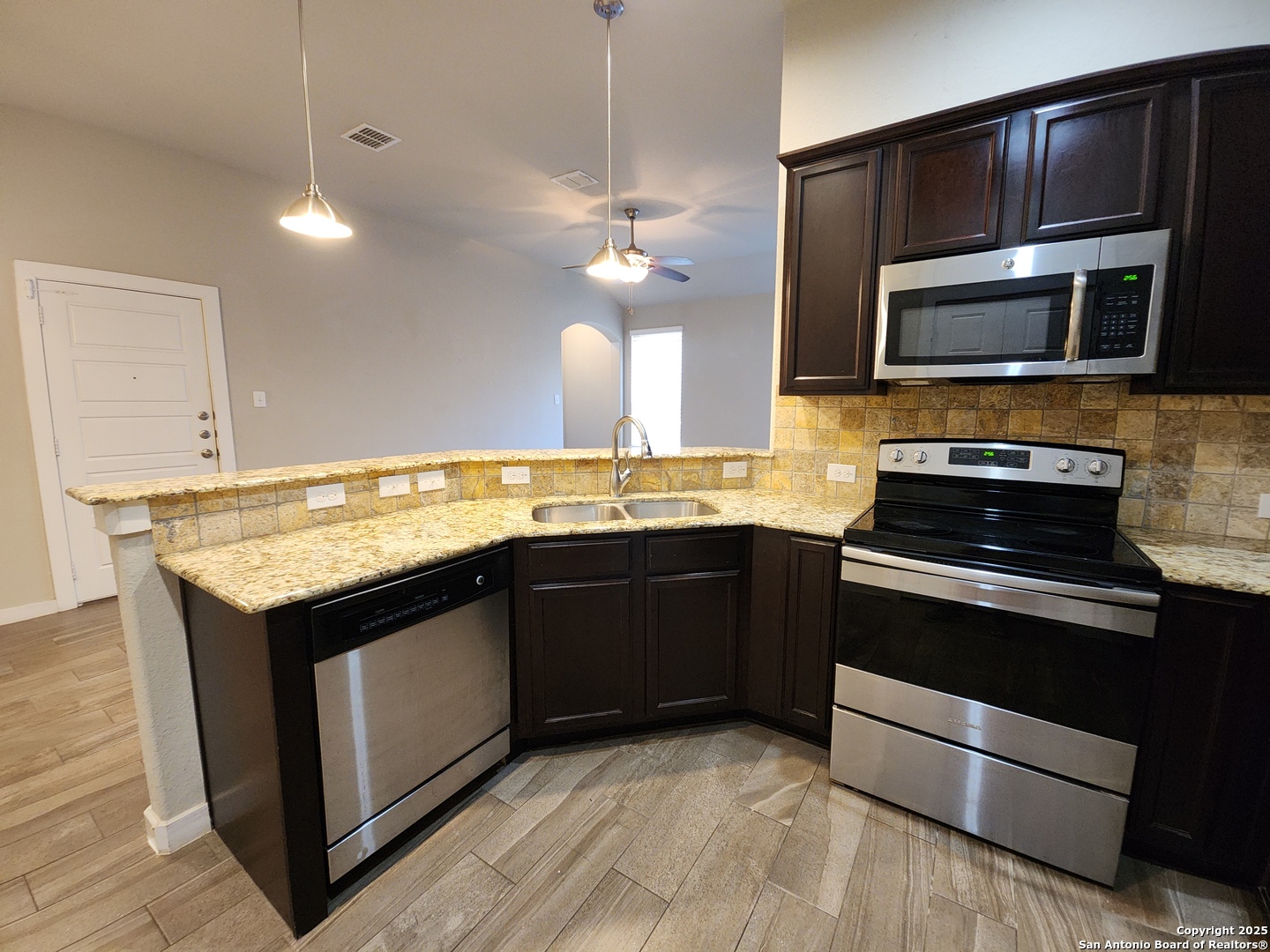 Gorgeous 3/2/2 Duplex Home Located in Comal ISD and Minutes to IH 35 and the Creekside Shopping Area. Tons Of Features: Granite Countertops in the Kitchen with Under Mount Sink, Stainless Steel Appliances, Built-In Microwave, Dishwasher, Stove, Upscale Light & Plumbing Fixtures, Walk-In Shower & Double Vanity in Primary Bath, High Ceilings, Upscale Wood-Look Tile Flooring with Carpet in All Bedrooms, Ceilings Fans, Patio, Sprinkler System, and Privacy Fenced-In Backyard! CISD. 1 Pet Negotiable, 25lb Max. Floor Plan 2530