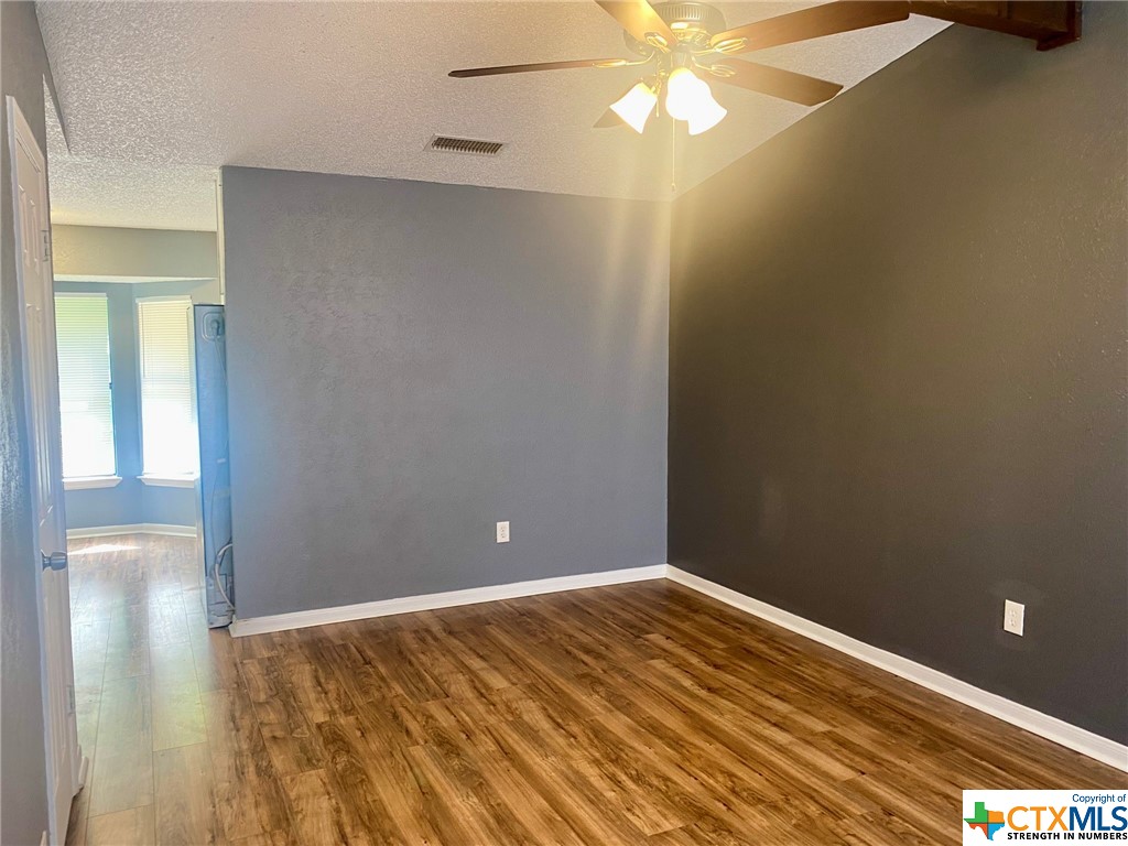 The described home is offering a modern living experience with its wood plank flooring and contemporary paint choices. The inclusion of stainless steel appliances and unique woodwork backsplash in the kitchen adds a touch of elegance, while the spacious primary bedroom with a walk-in closet and en-suite bathroom provides a private retreat within the home. The additional bedrooms are well-accommodated with a shared full-size bath, ensuring ample space for family or guests. The outdoor space is equally impressive, featuring a large fenced-in yard with a storage shed and a charming rock garden patio, perfect for outdoor activities or relaxation under the shade of mature trees. This property appears to be a wonderful option for those seeking a blend of modern amenities and inviting living spaces.