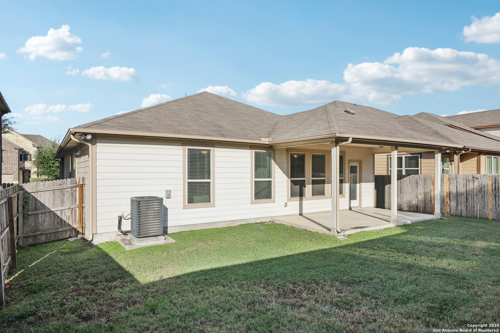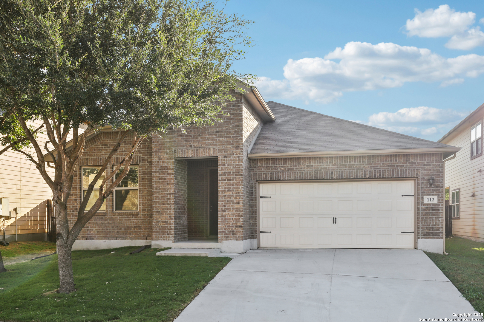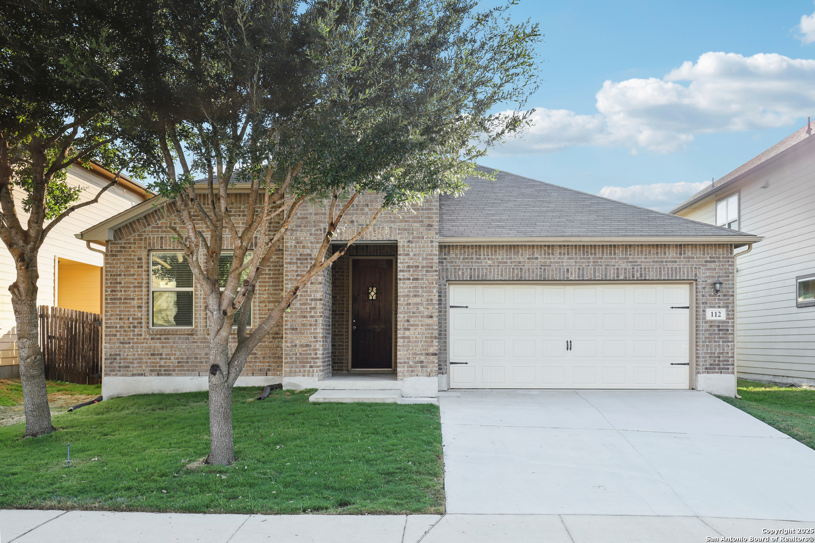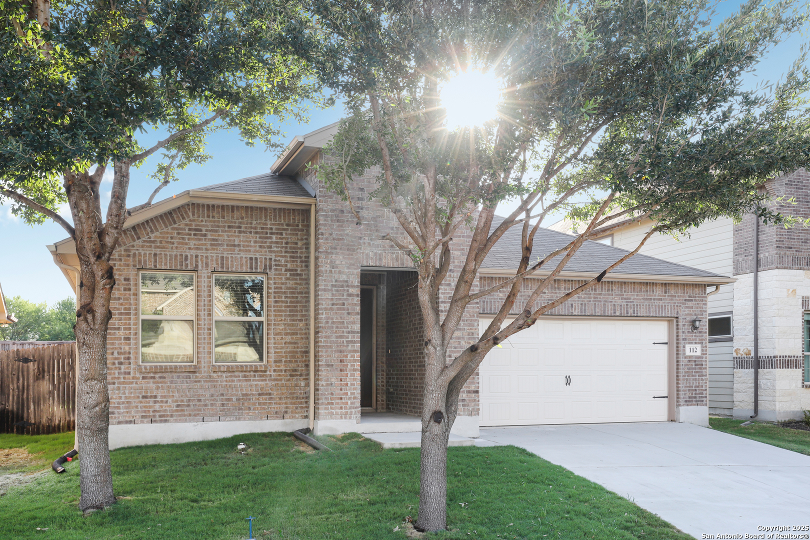 Welcome to 112 Grand Vista, a charming single-story home featuring 3 bedrooms, a versatile flex room, and 2 bathrooms. A beautiful front archway and mature trees create an inviting curb appeal. Inside, the open floorplan is filled with natural light, with a spacious kitchen that includes a large island with seating and abundant cabinet space. The primary suite offers a private bathroom with dual vanities, a garden tub, and a separate shower. Enjoy outdoor living on the large covered patio overlooking a fully fenced backyard for added privacy. Recent updates include a new A/C unit with a 10-year warranty, prep for a water softener, and a dishwasher in excellent condition. Located in the Cibolo Vistas community, residents enjoy access to a park, pool, and splash pad!