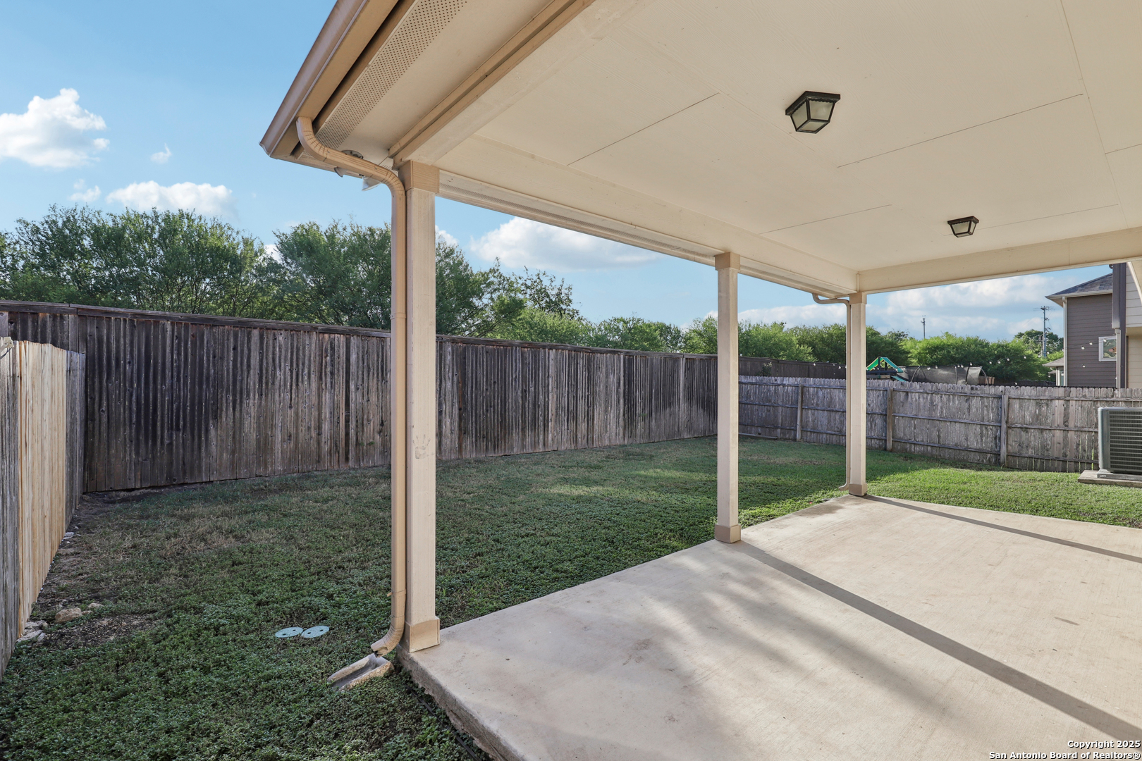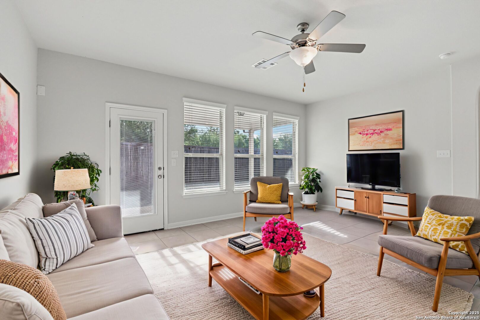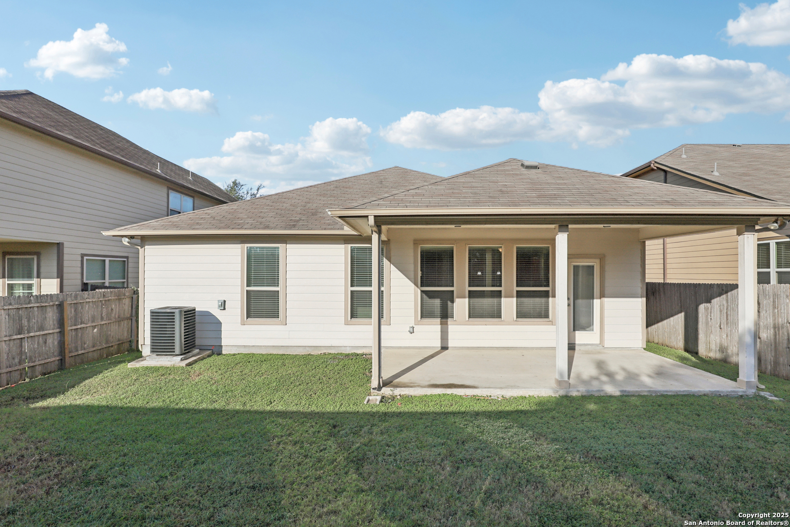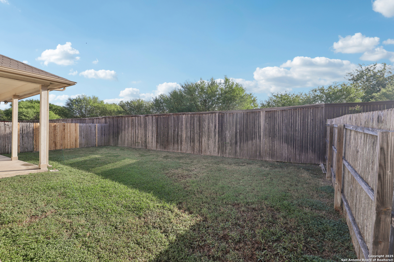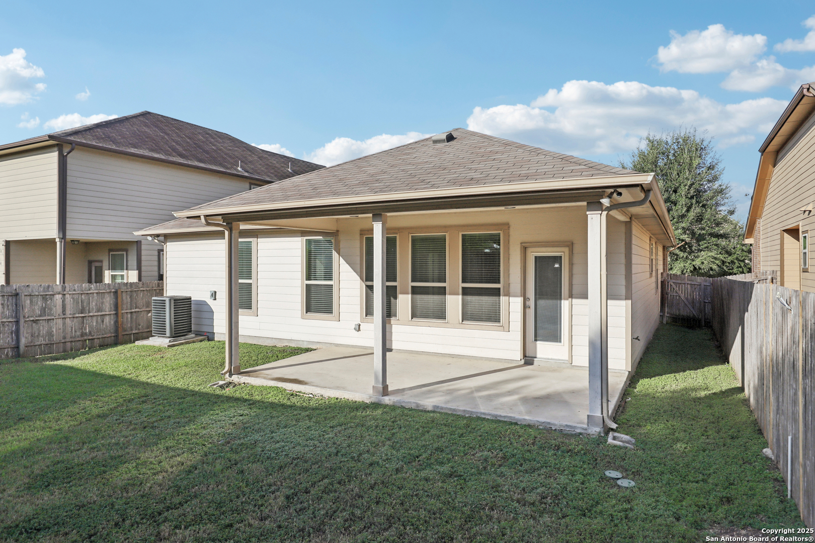 Welcome to 112 Grand Vista, a charming single-story home featuring 3 bedrooms, a versatile flex room, and 2 bathrooms. A beautiful front archway and mature trees create an inviting curb appeal. Inside, the open floorplan is filled with natural light, with a spacious kitchen that includes a large island with seating and abundant cabinet space. The primary suite offers a private bathroom with dual vanities, a garden tub, and a separate shower. Enjoy outdoor living on the large covered patio overlooking a fully fenced backyard for added privacy. Recent updates include a new A/C unit with a 10-year warranty, prep for a water softener, and a dishwasher in excellent condition. Located in the Cibolo Vistas community, residents enjoy access to a park, pool, and splash pad!