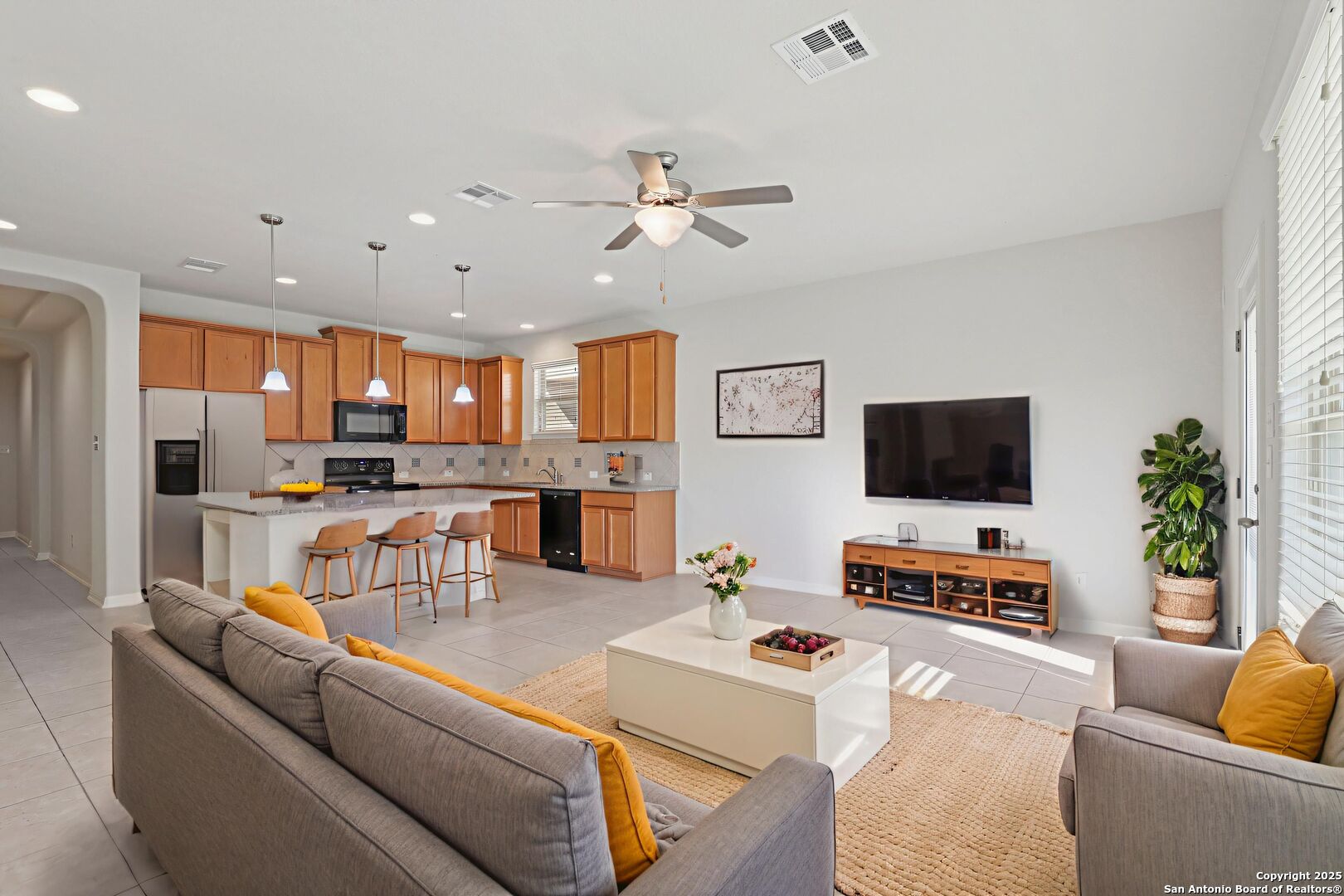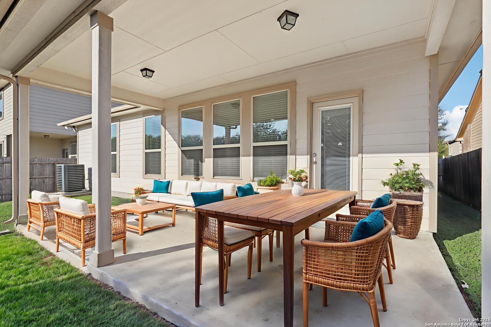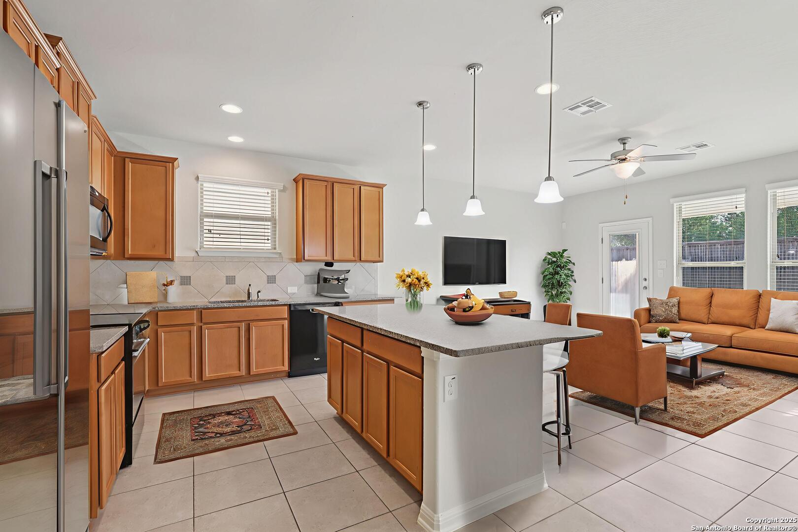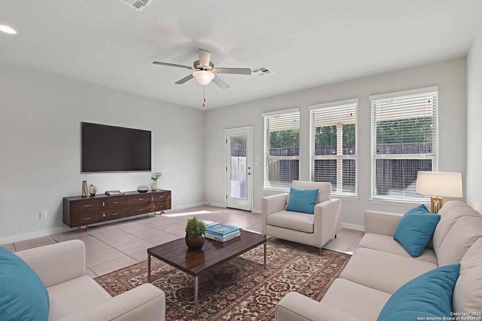 Welcome to 112 Grand Vista, a charming single-story home featuring 3 bedrooms, a versatile flex room, and 2 bathrooms. A beautiful front archway and mature trees create an inviting curb appeal. Inside, the open floorplan is filled with natural light, with a spacious kitchen that includes a large island with seating and abundant cabinet space. The primary suite offers a private bathroom with dual vanities, a garden tub, and a separate shower. Enjoy outdoor living on the large covered patio overlooking a fully fenced backyard for added privacy. Recent updates include a new A/C unit with a 10-year warranty, prep for a water softener, and a dishwasher in excellent condition. Located in the Cibolo Vistas community, residents enjoy access to a park, pool, and splash pad!