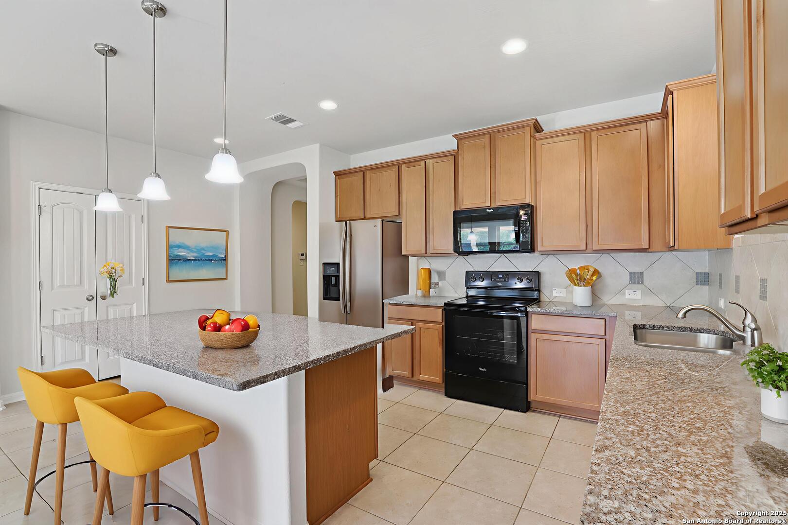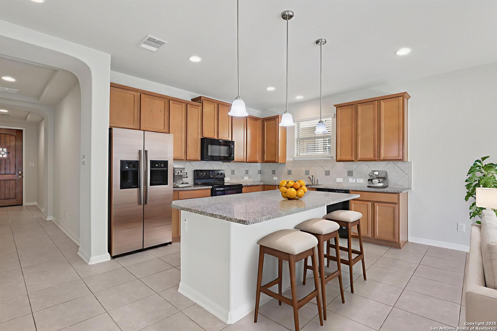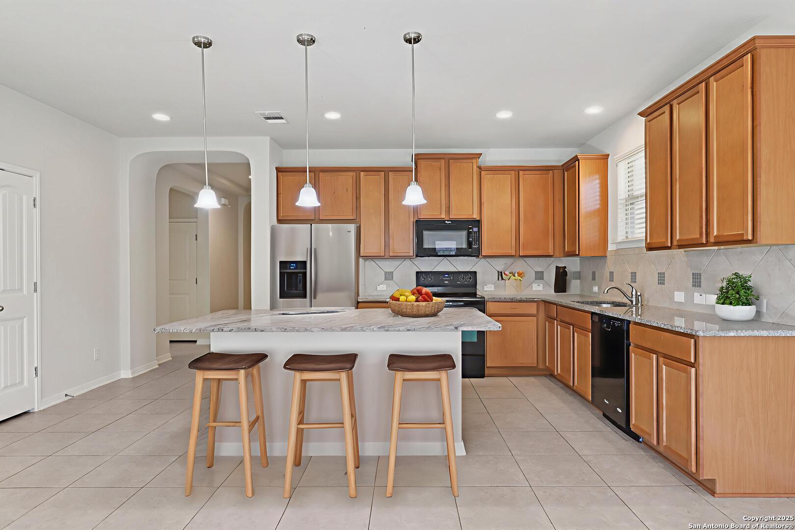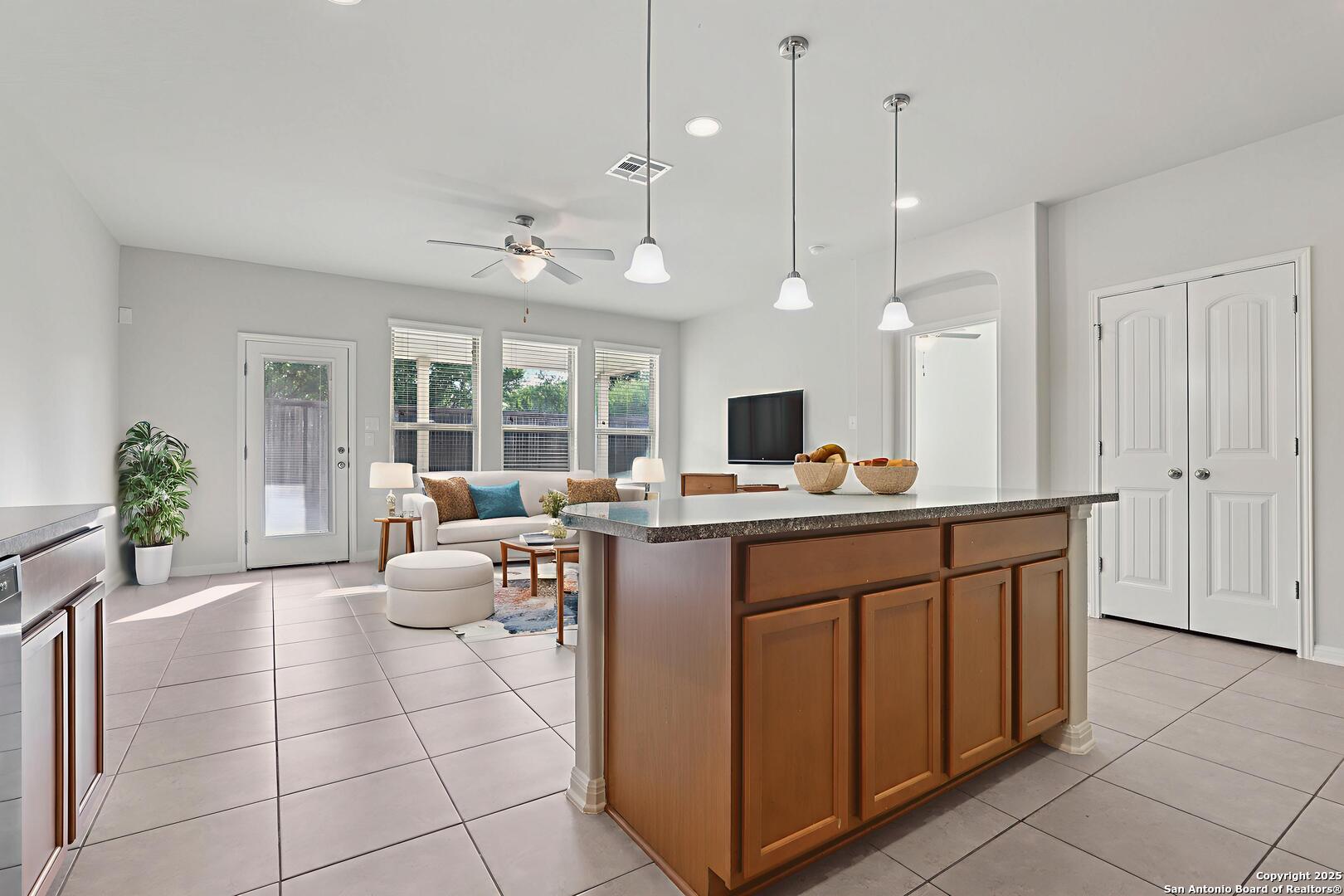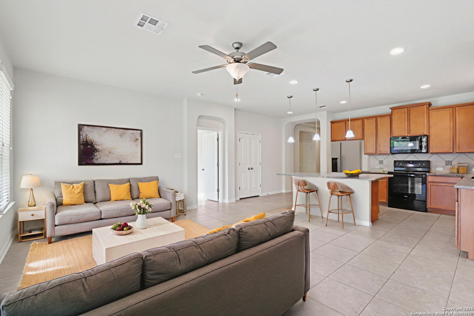 Welcome to 112 Grand Vista, a charming single-story home featuring 3 bedrooms, a versatile flex room, and 2 bathrooms. A beautiful front archway and mature trees create an inviting curb appeal. Inside, the open floorplan is filled with natural light, with a spacious kitchen that includes a large island with seating and abundant cabinet space. The primary suite offers a private bathroom with dual vanities, a garden tub, and a separate shower. Enjoy outdoor living on the large covered patio overlooking a fully fenced backyard for added privacy. Recent updates include a new A/C unit with a 10-year warranty, prep for a water softener, and a dishwasher in excellent condition. Located in the Cibolo Vistas community, residents enjoy access to a park, pool, and splash pad!