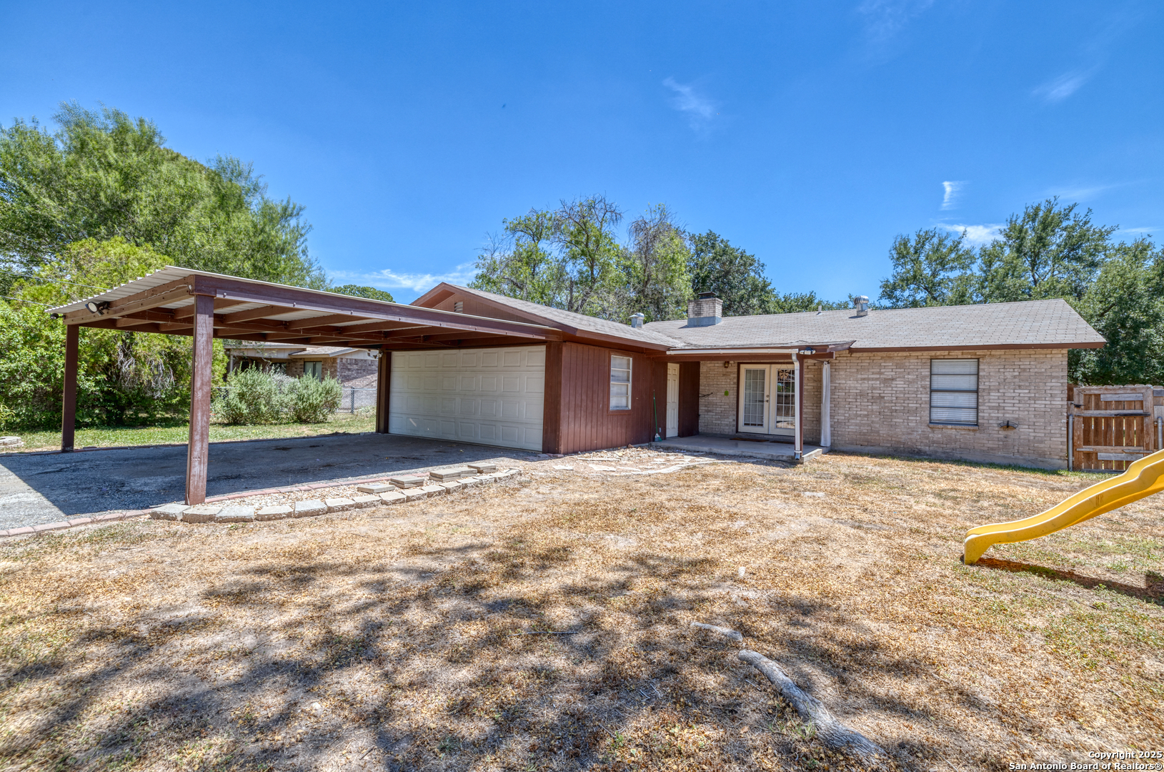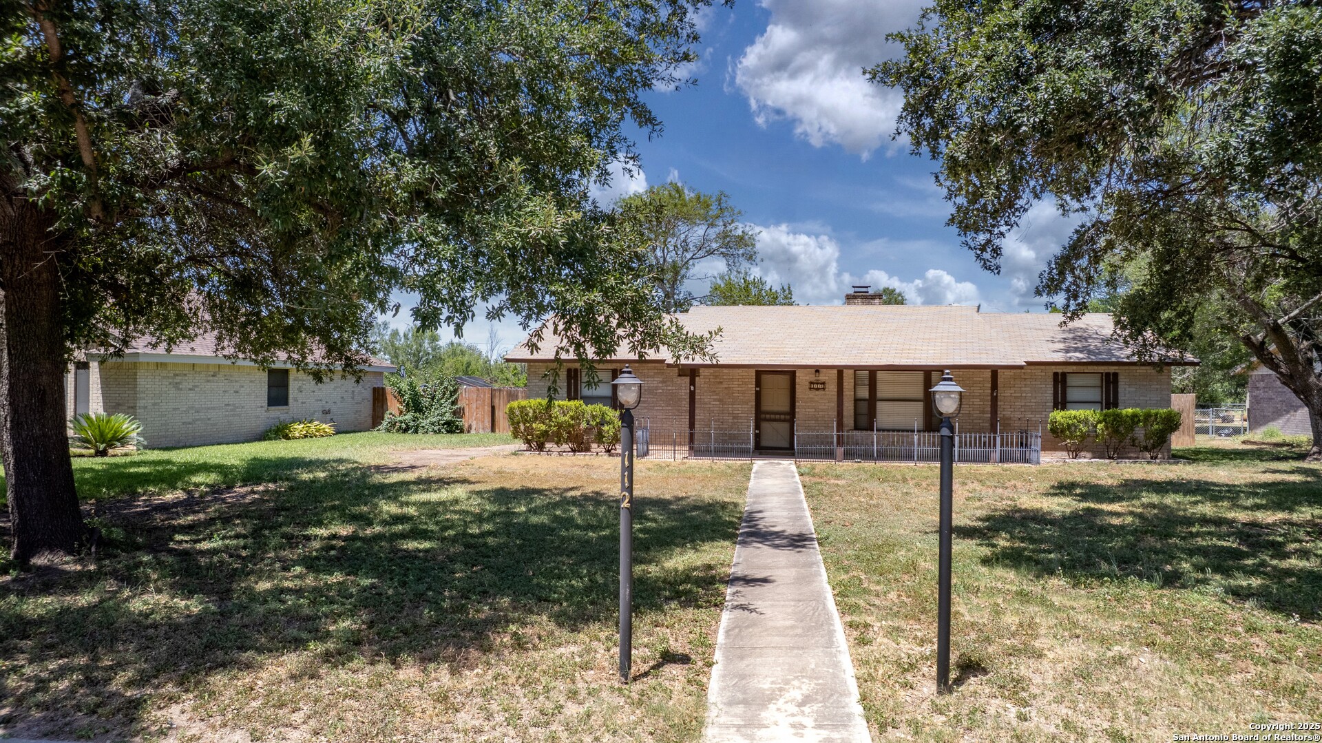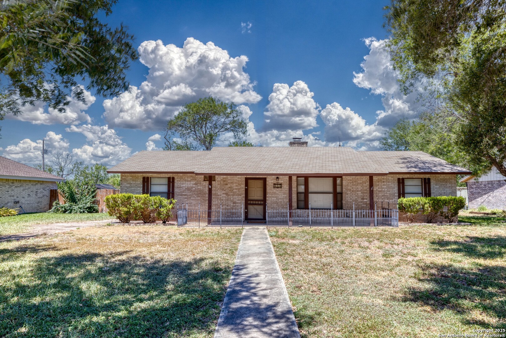 Tucked just south of town in a peaceful, well-kept neighborhood, this 3-bedroom brick home combines a country feel with city convenience. Built in 1979, it offers 1,595 sq. ft. of comfortable living space on a tree-shaded 0.30-acre lot. Inside, the living room features a bay window and a cozy brick fireplace. The kitchen is both functional and inviting with a mix of open and closed shelving, a breakfast bar, and French doors in the dining area that open to the back patio. All appliances convey-including cooktop, in-wall oven, microwave, refrigerator, dishwasher, washer, and dryer-so it's ready for move-in from day one. The primary suite includes a remodeled bathroom with updated countertop, fixtures, and tub-shower combo. Two additional bedrooms, each with ceiling fans, share a stylish hallway bath highlighted by granite counters, ornamental cabinetry, and a colonial-style mirror. Ceramic tile runs through the main living areas while bedrooms feature plush carpeting. Outdoors, the property is set up for both relaxation and play with a storage shed, children's playset, and privacy fencing on three sides. Parking is plentiful with a finished two-car garage (complete with ceiling fans, flooring, and a window unit-perfect for a game room, workshop, or gym), plus an attached two-car carport and asphalt rear drive with an electric gate. All of this is just minutes from H-E-B, the new hospital, and Southwest Texas Junior College, making this home an ideal blend of charm, comfort, and convenience.