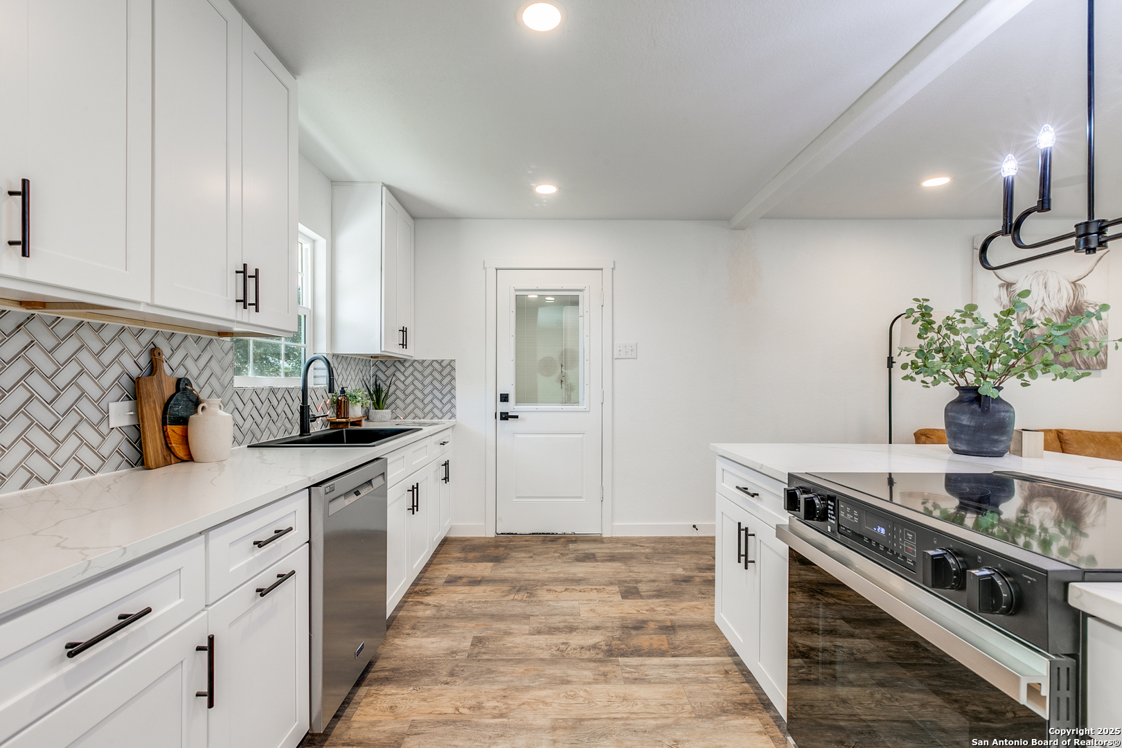Step into this completely remodeled 3-bedroom, 2-bath home, perfectly situated on a large corner lot with a side fence and private access door for extra convenience. This home has been transformed from top to bottom, offering a fresh, modern, and move-in-ready feel. As you enter, you're greeted by a bright and open living area that flows seamlessly into the inviting kitchen. The stunning quartz island serves as the heart of the home, welcoming guests and creating an ideal space for entertaining. The kitchen also features a large pantry with built-in cabinetry, providing exceptional storage and organization. Throughout the home, enjoy all-new flooring, energy-efficient windows, and beautiful finishing touches that elevate every room. Both bathrooms have been fully remodeled with stylish modern updates. For added comfort and peace of mind, the home includes a new roof, new water heater, and security cameras already in place. The home is also equipped with Bluetooth speakers throughout, perfect for everyday living or hosting friends and family. Step outside to a newly sodded backyard complete with a full sprinkler system, ideal for relaxation or outdoor gatherings. The garage features epoxy flooring, offering durability and a clean, polished look. With thoughtful upgrades and quality finishes at every turn, this home truly blends style, comfort, and functionality, ready to welcome its next owner