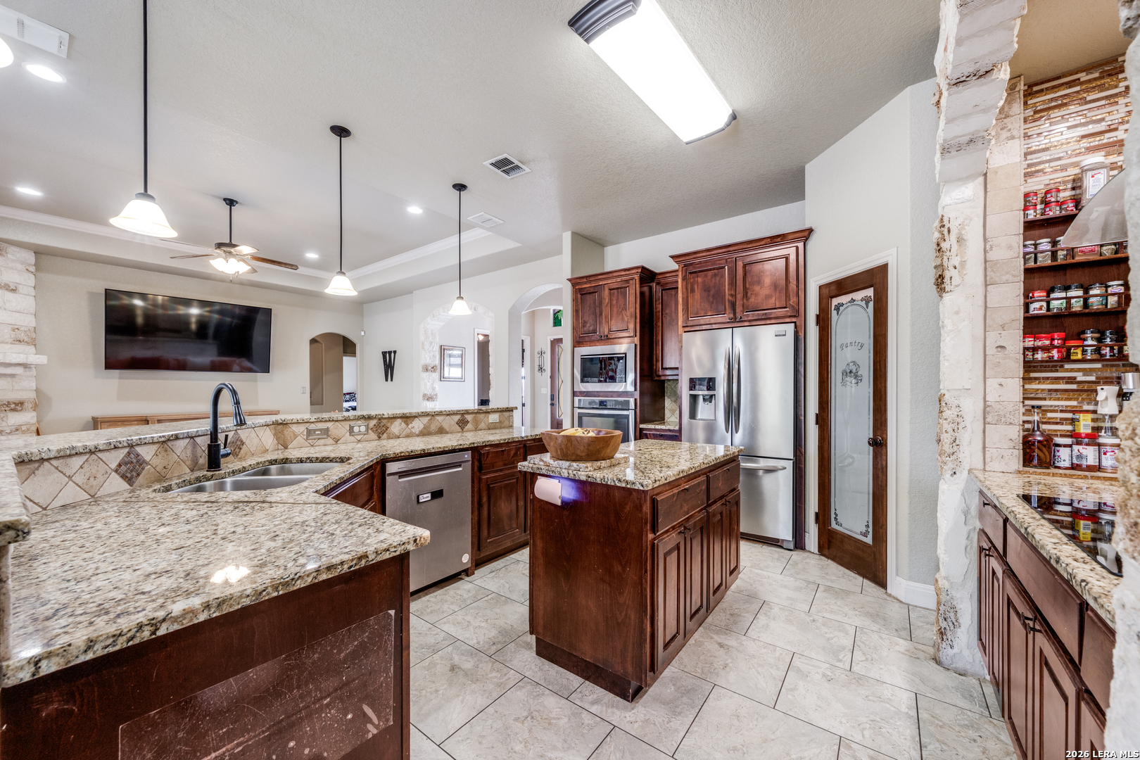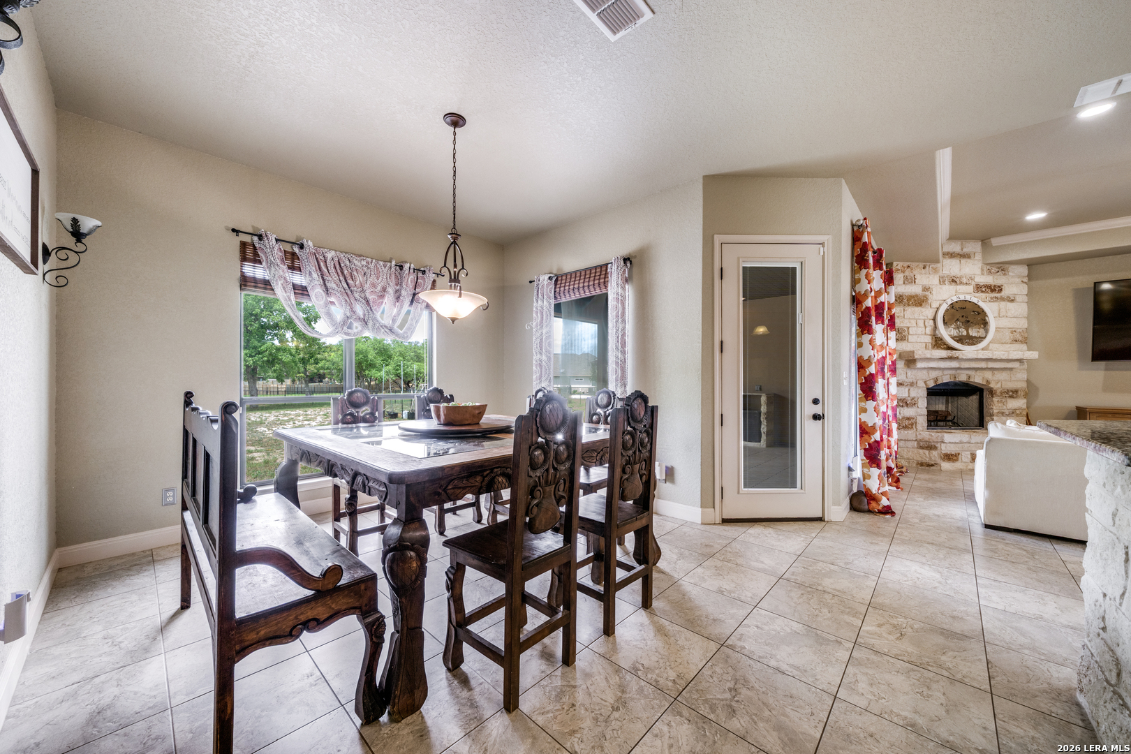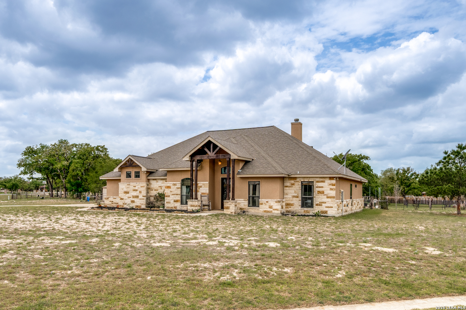 Welcome to your little piece of heaven that sits on over an acre lot! As you arrive, the home immediately welcomes you with a peaceful landscape dotted with over 30 mature trees that offer both beauty and privacy. Stepping toward the entrance you're greeted by flagstone flooring and rock exterior accents that adds natural texture and timeless character. Walking through the grand front doors you will be greeted by rock archways and porcelain ceramic tile that guide you from room to room. The main living room centers around a beautiful rock fireplace creating a cozy focal point that anchors the home. Your study area offers a quiet retreat with vinyl wood flooring, coffer ceilings, and Texas size French Doors making it the perfect space for work or study. As you continue, the kitchen opens up as the heart of the home featuring granite countertops, Island, a stainless steel vent hood, pot filler, breakfast bar, and a gorgeous backsplash. Your cooktop is framed by rock, tying in seamlessly with the home's natural elements, while stainless steel appliances complete the space with a modern touch. The primary suite feels like its own private escape with direct access to the outdoors. Inside you'll find crown molding, multiple closets, and a luxurious ensuite bath complete with a walk-through shower featuring a rain showerhead, a garden tub with jets and dual granite vanities. Throughout the rest of the home, thoughtful upgrades continue with a central vacuum system, Ecobee programmable thermostat, and an AC system enhanced with a blue light feature for added air quality. Just beyond, the outdoor living space unfolds with an impressive wood-burning fireplace, 30x17 patio, shed, garden & raised bedding area and wet bar area, perfect for entertaining or enjoying quiet evenings under the Texas sky. This isn't just a house-it's a place where every space tells a story, and every feature invites you to stay a little longer.