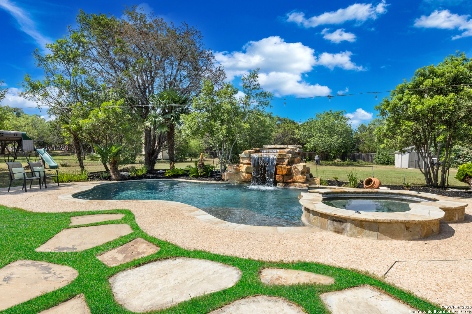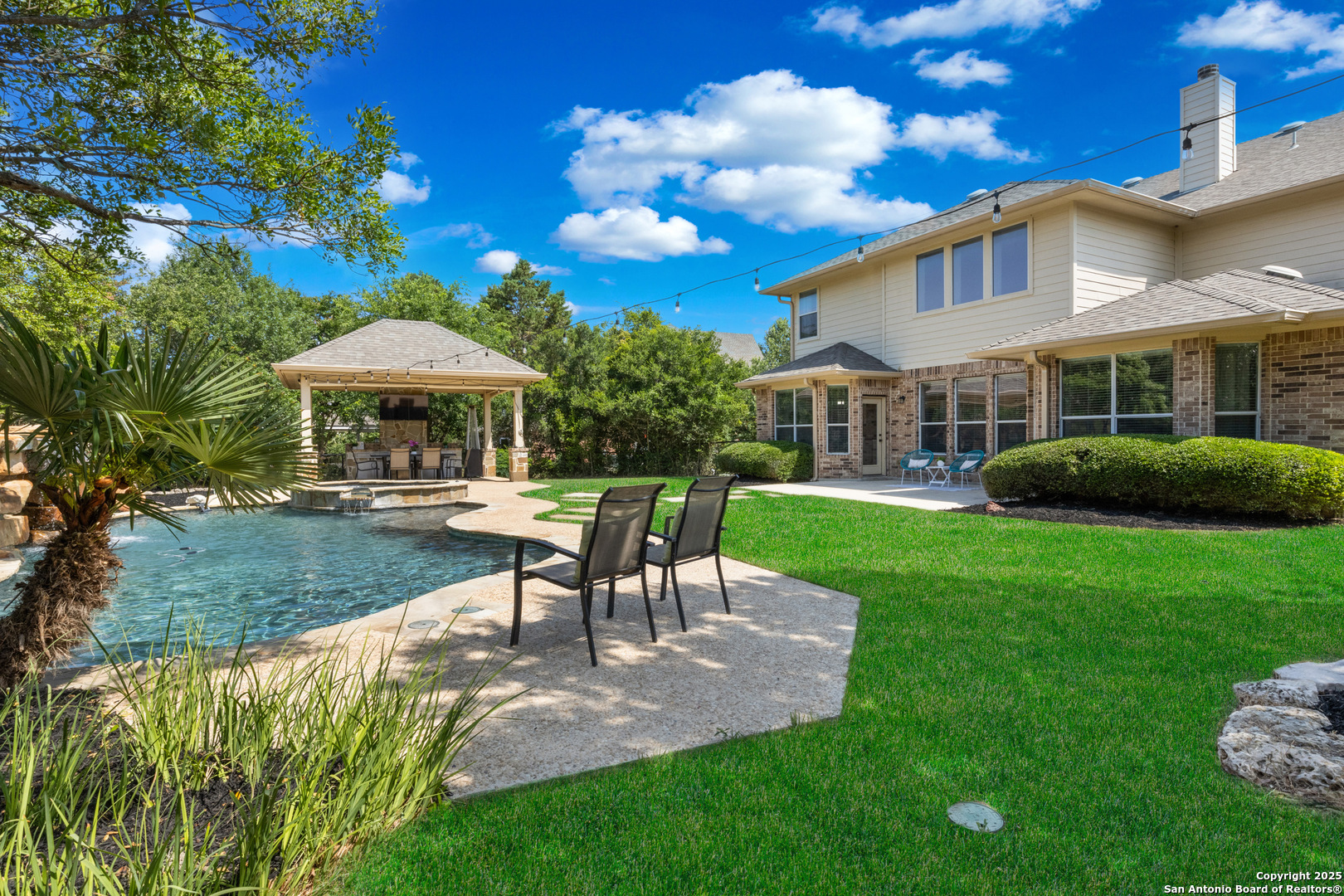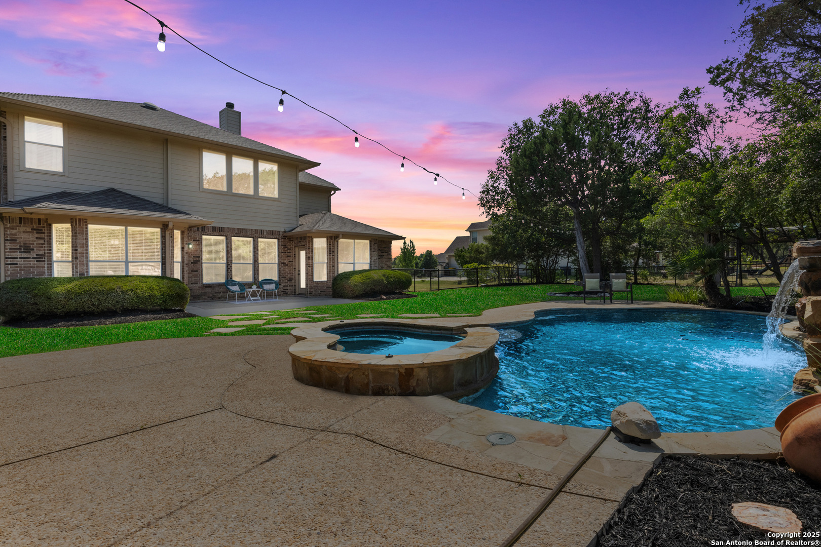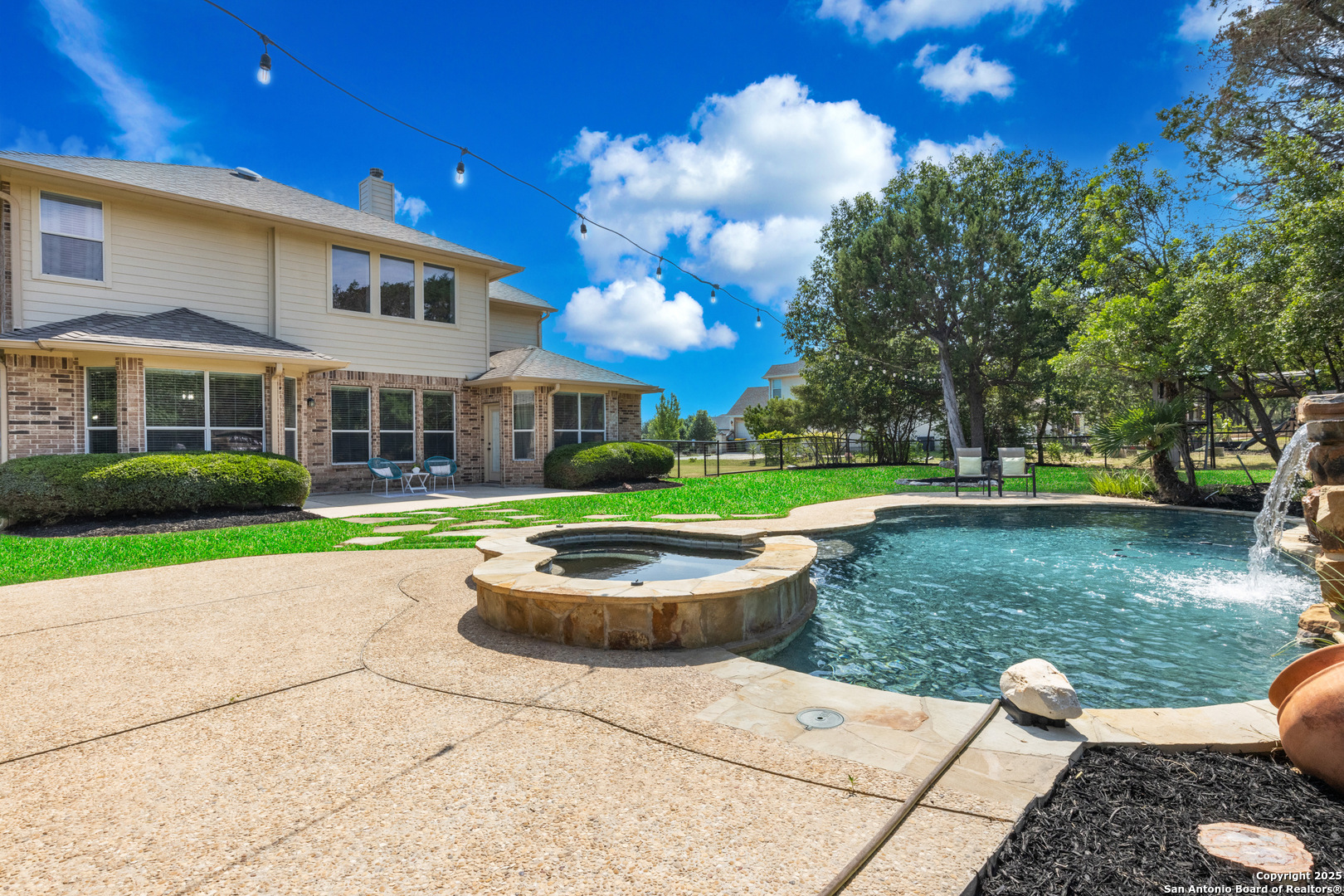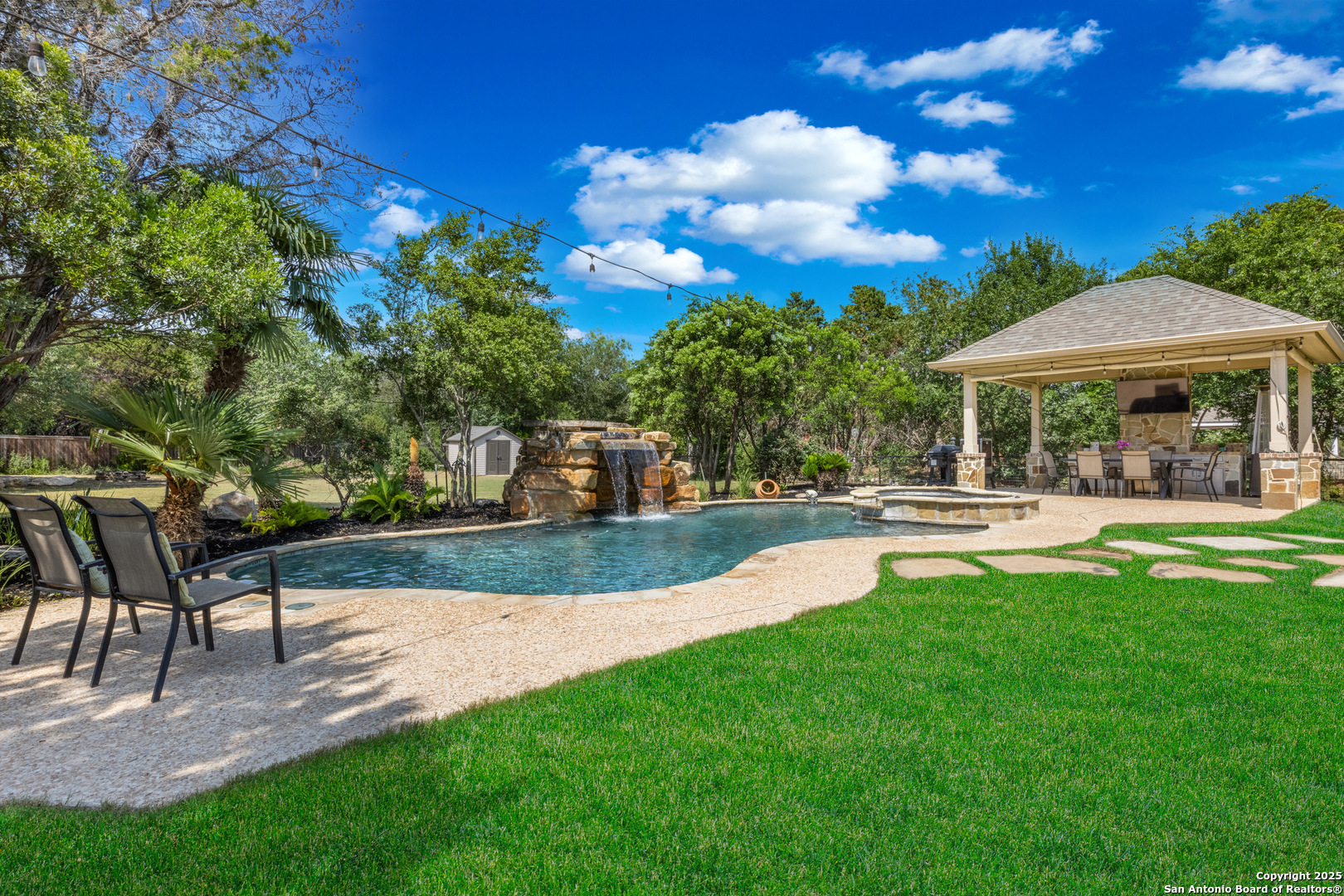 This exceptional home has it all, luxury, space, and lifestyle! Come see this stunning two-story home on a spacious 0.80-acre lot with an IN-GROUND HEATED POOL and attached JACUZZI by Keith Zars! Located in the desirable subdivision of Hearthstone in Helotes, this beautifully maintained property features outstanding curb appeal, 4-sided brick exterior and mature trees. Inside, you'll be welcomed by luxury porcelain tile and engineered hardwood flooring throughout the main level. The formal dining room leads to a cozy family room with a charming corner fireplace and open view of the chef's kitchen, that boasts a huge island, granite countertops, a stylish tile backsplash, white cabinetry, double oven, stainless-steel appliances, and a breakfast nook perfect for both everyday living and entertaining. In the main level you have the spacious primary suite with a large bathroom featuring a garden tub, standing shower, dual vanities, and an oversized walk-in closet. Also, conveniently located on the main floor are the office and laundry room. Upstairs, you'll find four additional bedrooms, two sharing a Jack-and-Jill bath, as well as a spacious game room, and a great media room with a surround sound system. Step outside to your private backyard oasis that features a pool with a water fountain, a large gazebo with an outdoor kitchen, playground set, sprinkler system, a shed and a 3 car garage, all this nested on almost an acre lot, perfect for year-round entertaining. It's a must see! This will not last long!