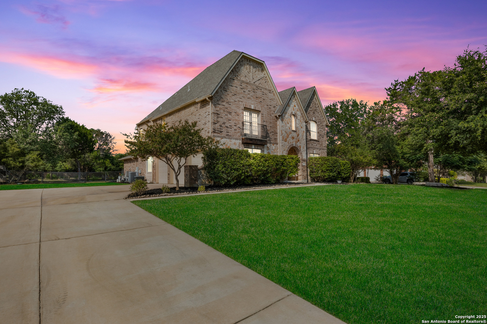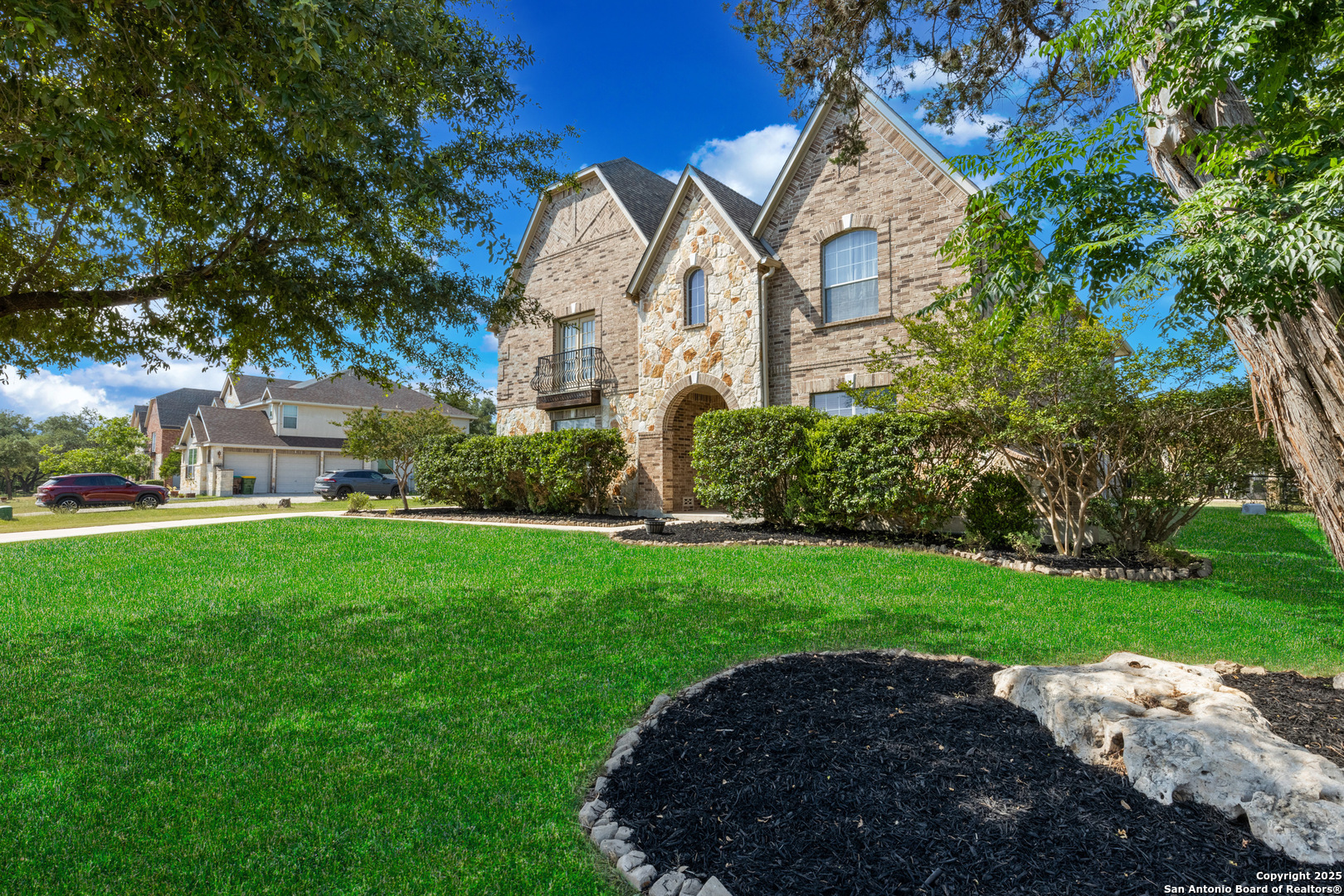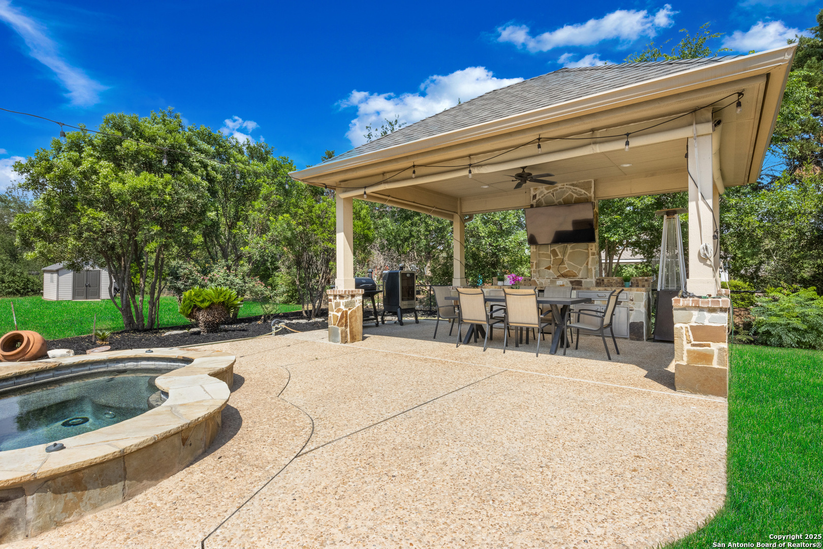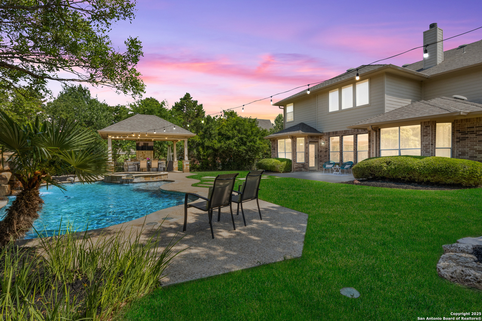 This exceptional home has it all, luxury, space, and lifestyle! Come see this stunning two-story home on a spacious 0.80-acre lot with an IN-GROUND HEATED POOL and attached JACUZZI by Keith Zars! Located in the desirable subdivision of Hearthstone in Helotes, this beautifully maintained property features outstanding curb appeal, 4-sided brick exterior and mature trees. Inside, you'll be welcomed by luxury porcelain tile and engineered hardwood flooring throughout the main level. The formal dining room leads to a cozy family room with a charming corner fireplace and open view of the chef's kitchen, that boasts a huge island, granite countertops, a stylish tile backsplash, white cabinetry, double oven, stainless-steel appliances, and a breakfast nook perfect for both everyday living and entertaining. In the main level you have the spacious primary suite with a large bathroom featuring a garden tub, standing shower, dual vanities, and an oversized walk-in closet. Also, conveniently located on the main floor are the office and laundry room. Upstairs, you'll find four additional bedrooms, two sharing a Jack-and-Jill bath, as well as a spacious game room, and a great media room with a surround sound system. Step outside to your private backyard oasis that features a pool with a water fountain, a large gazebo with an outdoor kitchen, playground set, sprinkler system, a shed and a 3 car garage, all this nested on almost an acre lot, perfect for year-round entertaining. It's a must see! This will not last long!