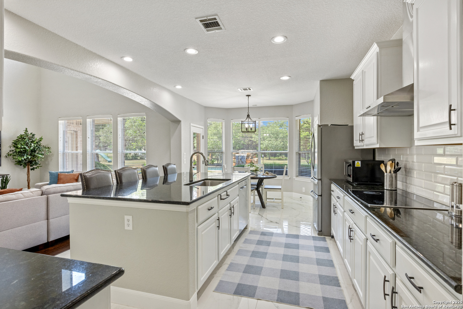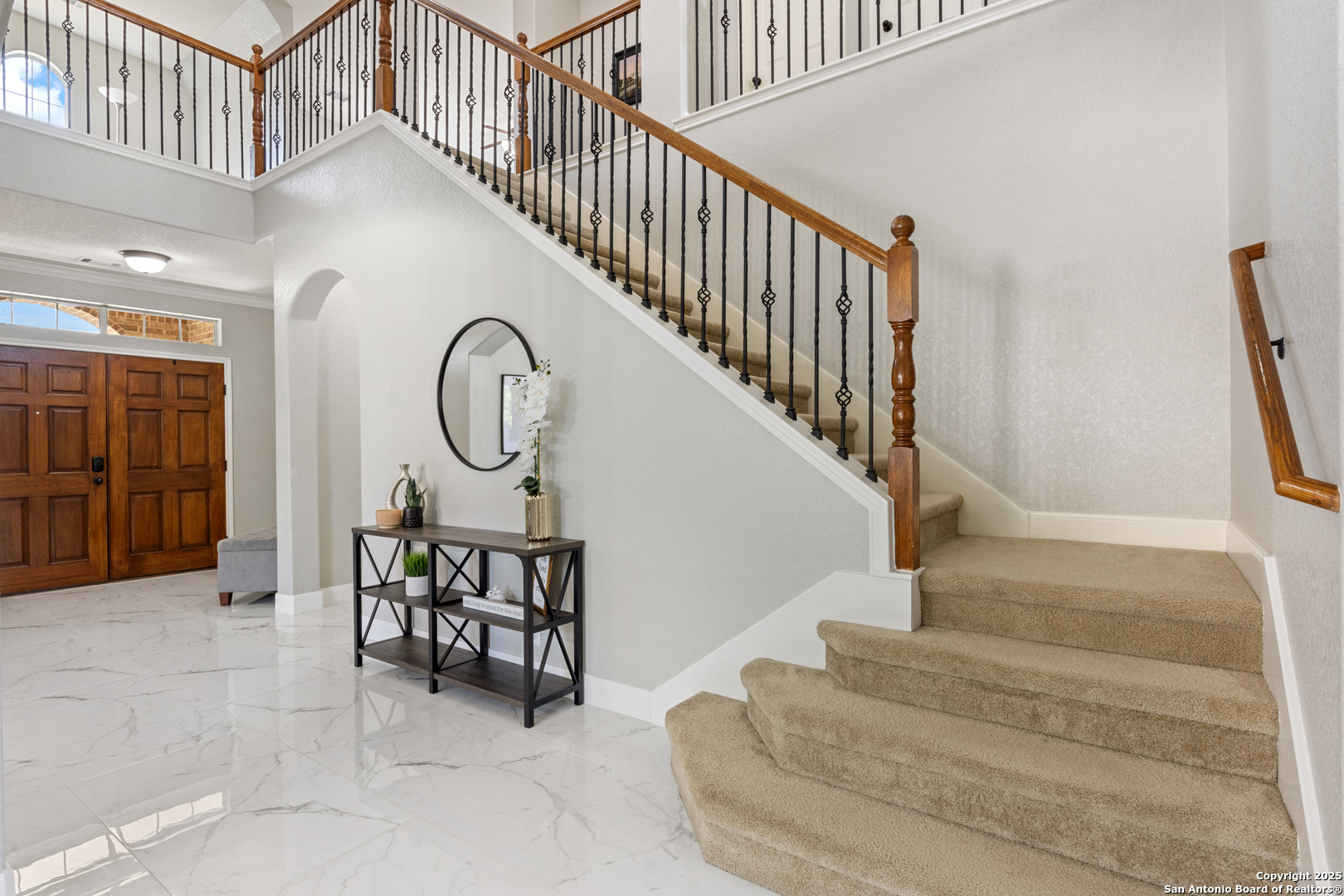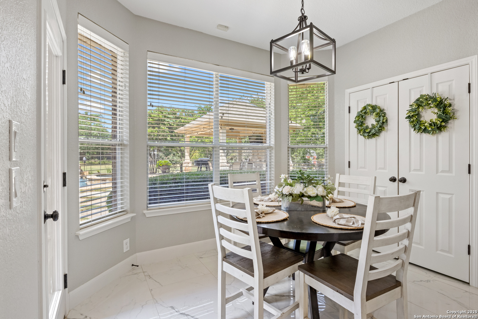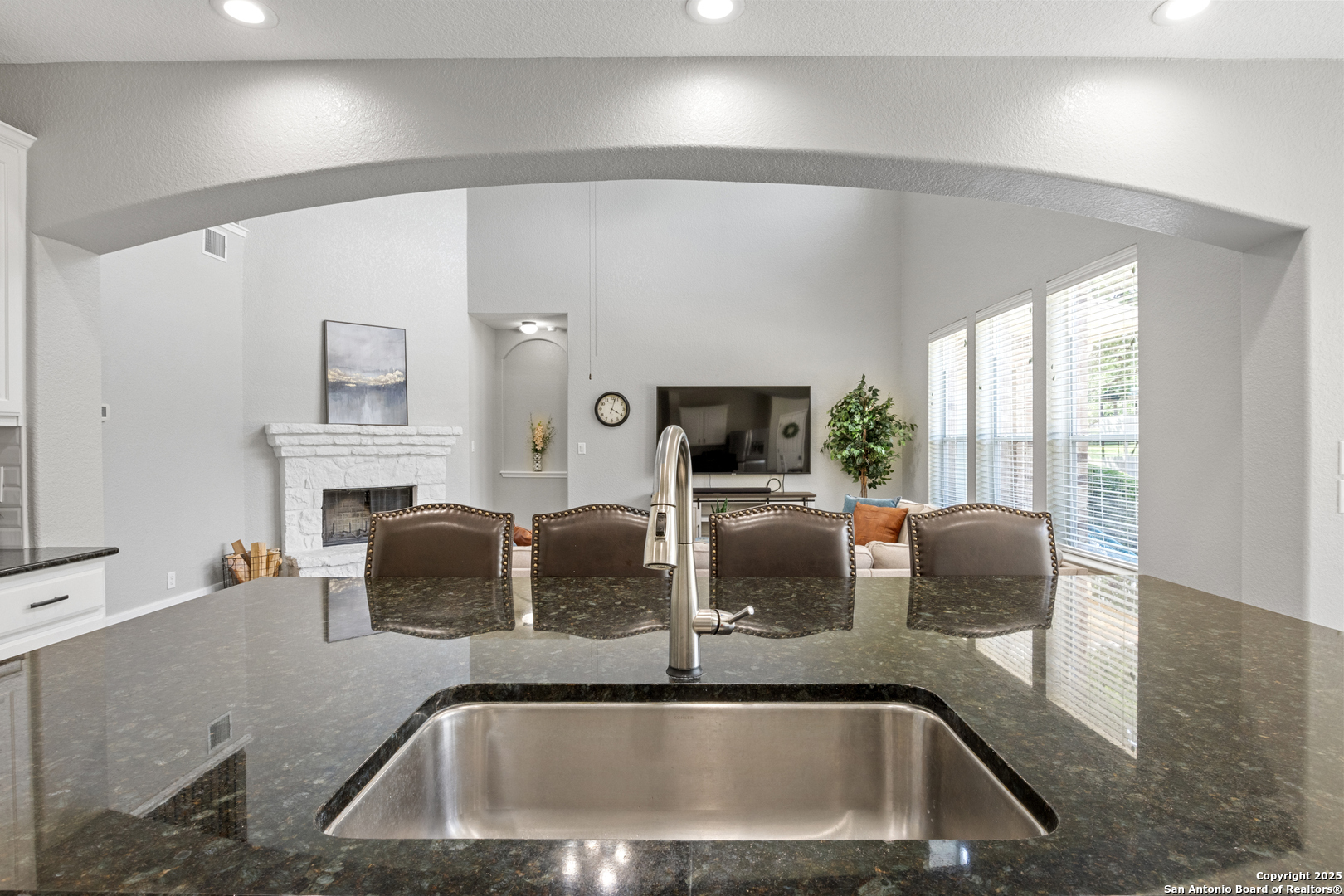 This exceptional home has it all, luxury, space, and lifestyle! Come see this stunning two-story home on a spacious 0.80-acre lot with an IN-GROUND HEATED POOL and attached JACUZZI by Keith Zars! Located in the desirable subdivision of Hearthstone in Helotes, this beautifully maintained property features outstanding curb appeal, 4-sided brick exterior and mature trees. Inside, you'll be welcomed by luxury porcelain tile and engineered hardwood flooring throughout the main level. The formal dining room leads to a cozy family room with a charming corner fireplace and open view of the chef's kitchen, that boasts a huge island, granite countertops, a stylish tile backsplash, white cabinetry, double oven, stainless-steel appliances, and a breakfast nook perfect for both everyday living and entertaining. In the main level you have the spacious primary suite with a large bathroom featuring a garden tub, standing shower, dual vanities, and an oversized walk-in closet. Also, conveniently located on the main floor are the office and laundry room. Upstairs, you'll find four additional bedrooms, two sharing a Jack-and-Jill bath, as well as a spacious game room, and a great media room with a surround sound system. Step outside to your private backyard oasis that features a pool with a water fountain, a large gazebo with an outdoor kitchen, playground set, sprinkler system, a shed and a 3 car garage, all this nested on almost an acre lot, perfect for year-round entertaining. It's a must see! This will not last long!