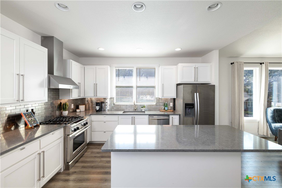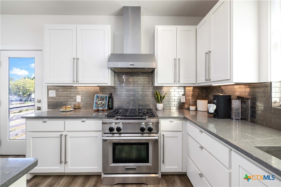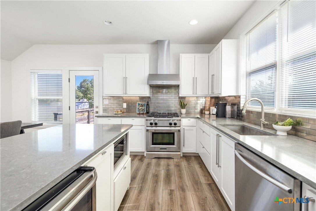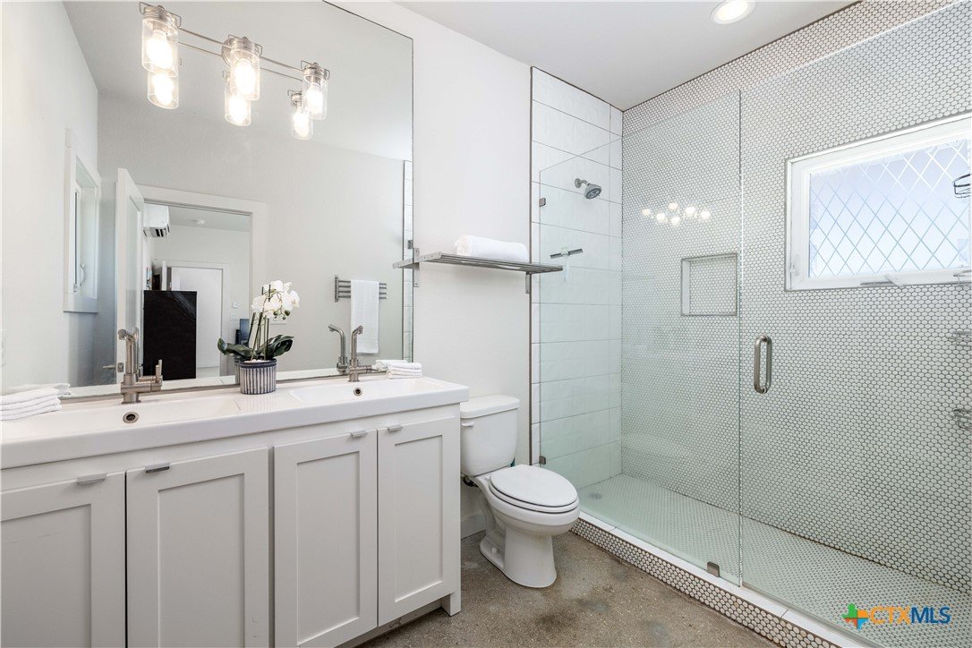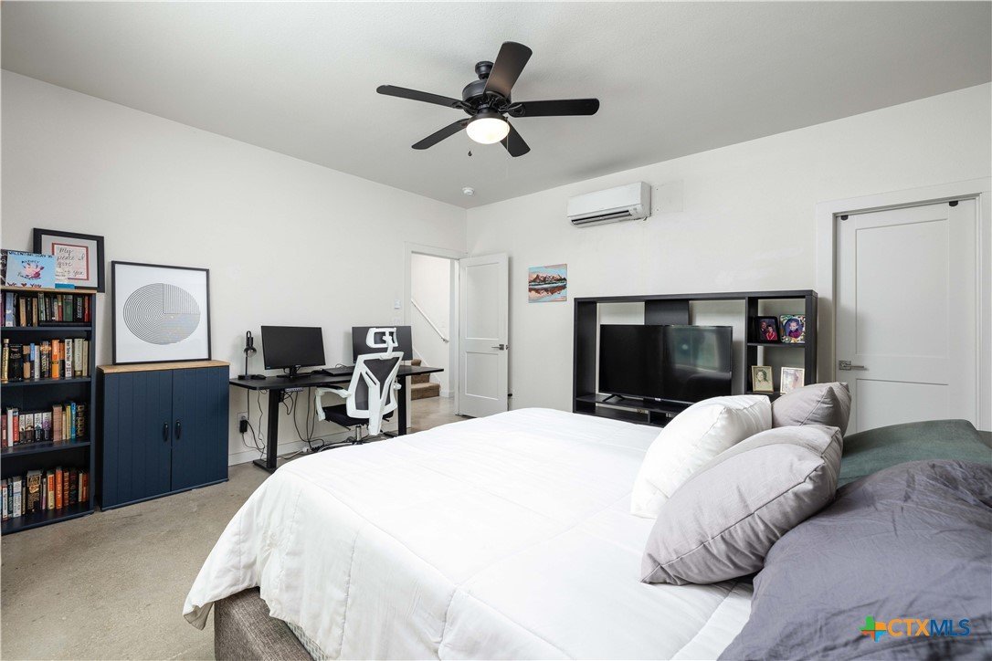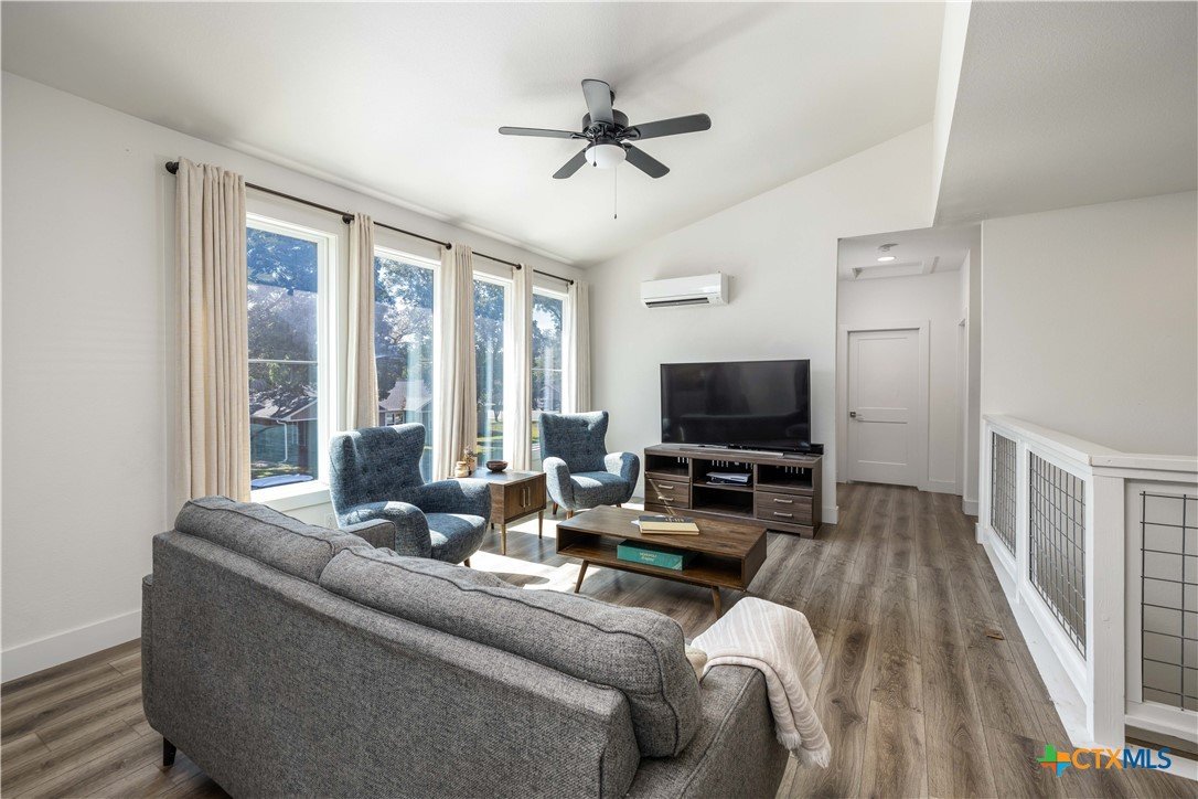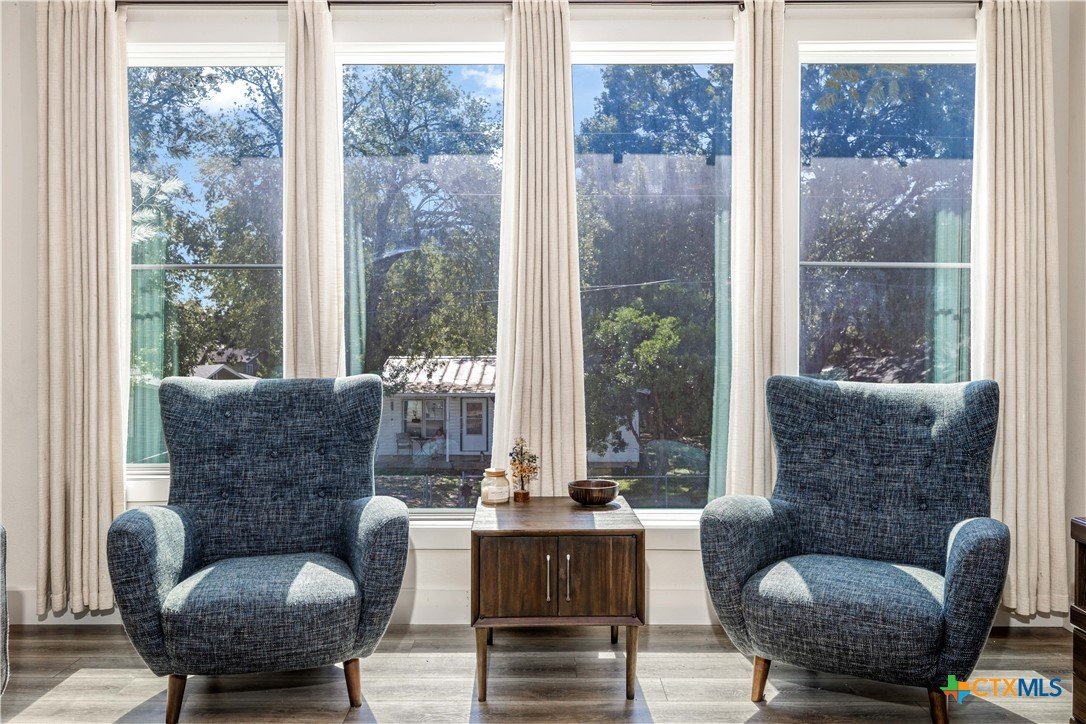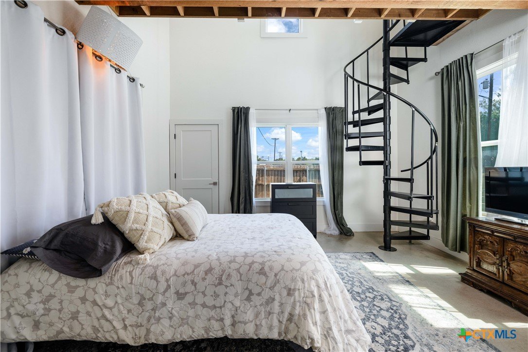 Nestled in the heart of New Braunfels, this gorgeous two-story home combines thoughtful design with a prime location just a 15-minute walk or bike ride to downtown. The main residence offers three bedrooms, two full baths, a spacious living room, dining area, and a beautifully appointed kitchen, while the attached guest suite-with its own private entrance-features a bedroom, full bath, and loft connected by a striking spiral staircase. An open-air deck separates the loft from the main home, where you can enjoy elevated views from the upstairs patio. This versatile second space is ideal for visiting guests, extended family, or even a private office. Modern tile selections in the kitchens and baths, elegant fixtures, and stylish design elements add a touch of sophistication, while an abundance of natural light enhances the home's welcoming feel. The chef's kitchen is both functional and stunning, featuring stainless steel appliances, generous counter and storage space, a bar-top island, and a built-in mini fridge and wine fridge that make entertaining effortless. Additional features include an all-new mini-split system installed in 2024, offering whisper-quiet operation, rapid cooling, and excellent energy efficiency. The property is free of HOA restrictions and is set in one of New Braunfels' most desirable areas. With its modern finishes, flexible layout, and exceptional location, this home offers the perfect backdrop for everyday living as well as entertaining, creating a place where memories are made for years to come!