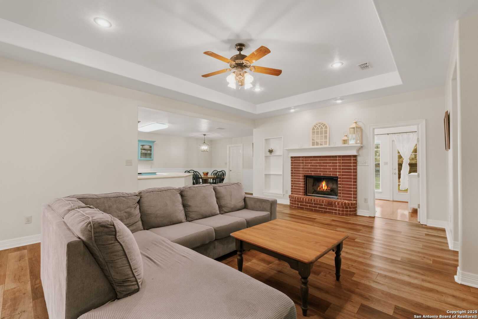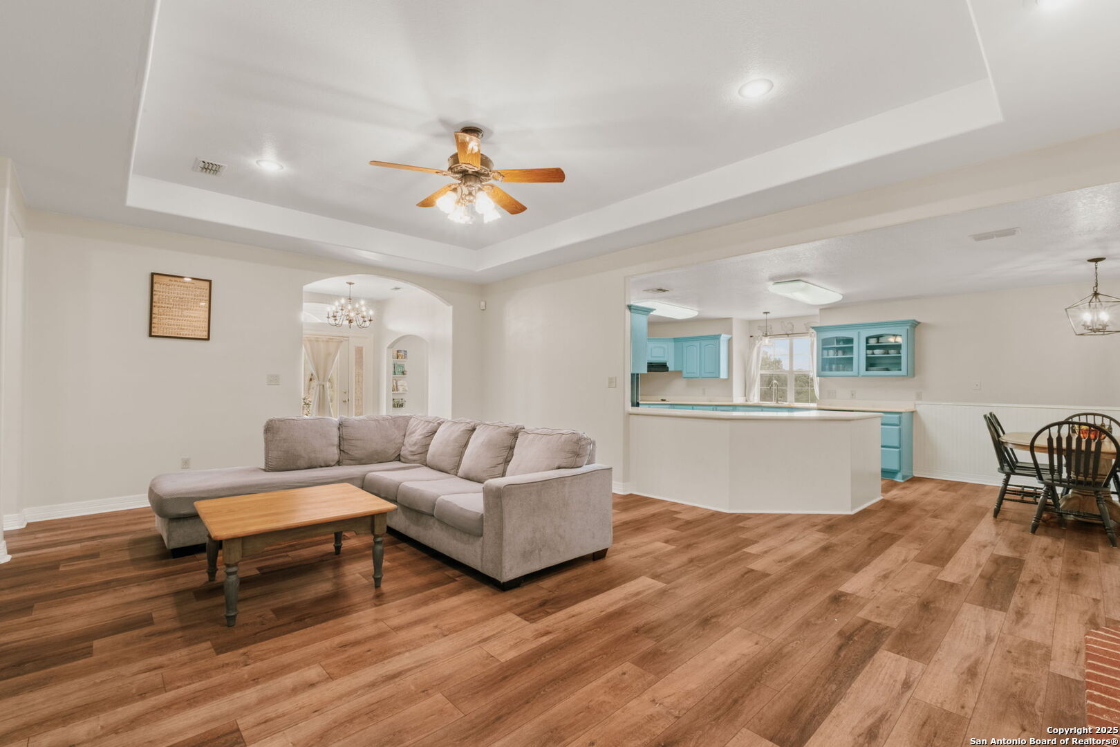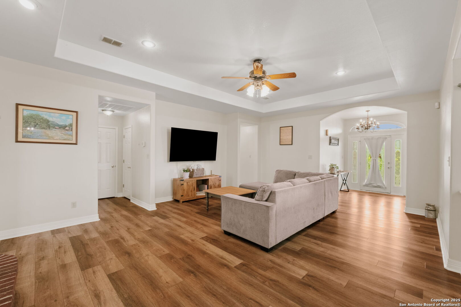 This move-in ready, 3 bedroom 2.5 bathroom home sits tucked away on 1.1ac in the heart of the Texas Hill Country! It's spacious 2,171sqft welcomes you in with its high, trey set ceilings, tasteful updates, and beautiful LVP flooring that flow seamlessly throughout the main living areas. The kitchen is set up perfectly for hosting success; complete with updated cabinets, loads of counter space, and ample storage. Relax on the back patio and enjoy the mature trees, tranquility, and privacy the yard provides. Ready to unwind? Escape to the large primary suite equipped with double vanities, a custom walk in shower, and an oversized garden tub. New roof installed Apr2025. Your chance to own a Texas Hill Country retreat is here, schedule your showing today!