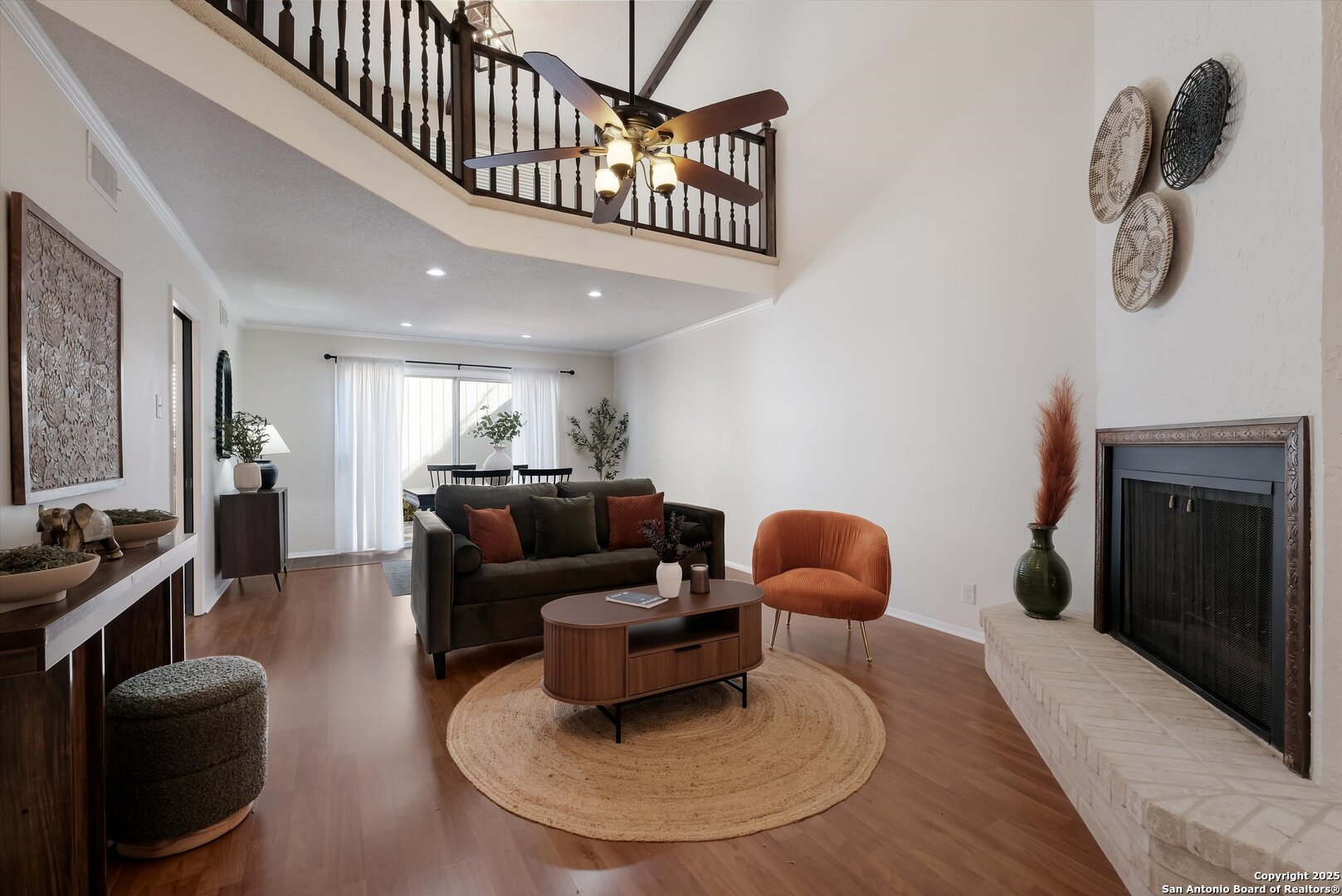 Beautiful three-bedroom, three-bath condo nestled in a peaceful community. The primary suite offers relaxing pool views and is conveniently located on main level. The living room features high ceilings and a cozy fireplace, creating an open and inviting atmosphere, Upstairs you'll find two additional bedrooms, two full baths in each bedroom and a loft-style living area. Nestled among mature trees, this home offers a private patio and a spacious detached two car garage a true retreat in a prime location. HOA dues include water and trash, along with upkeep of all common areas