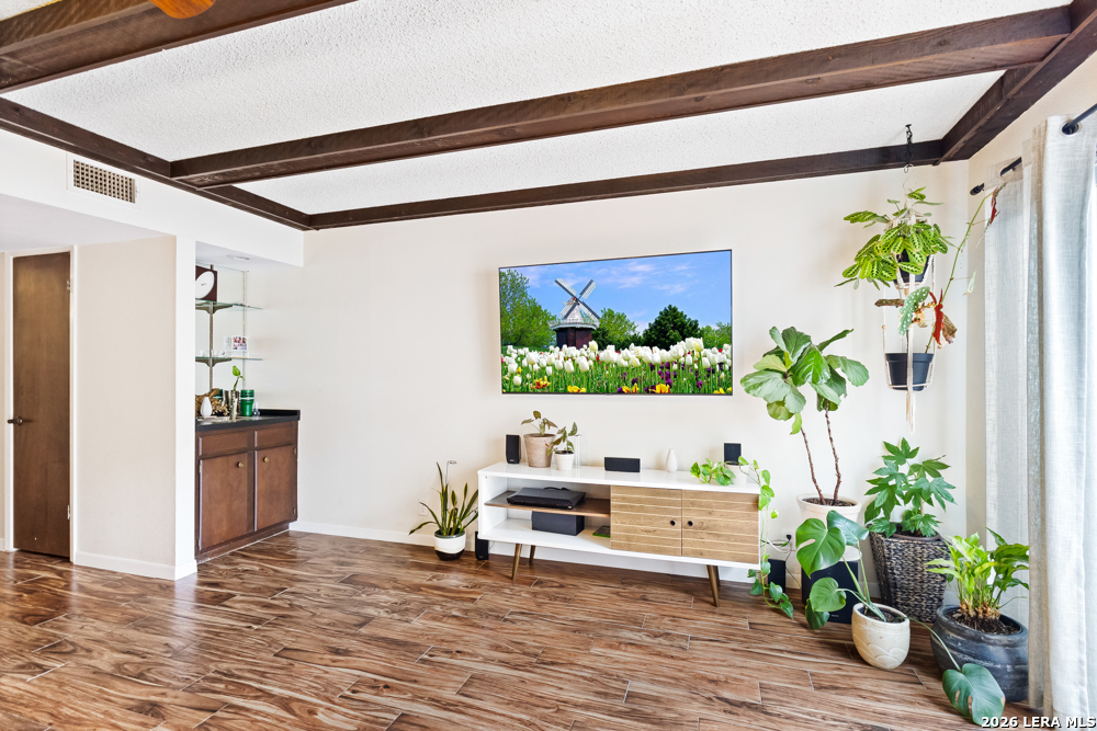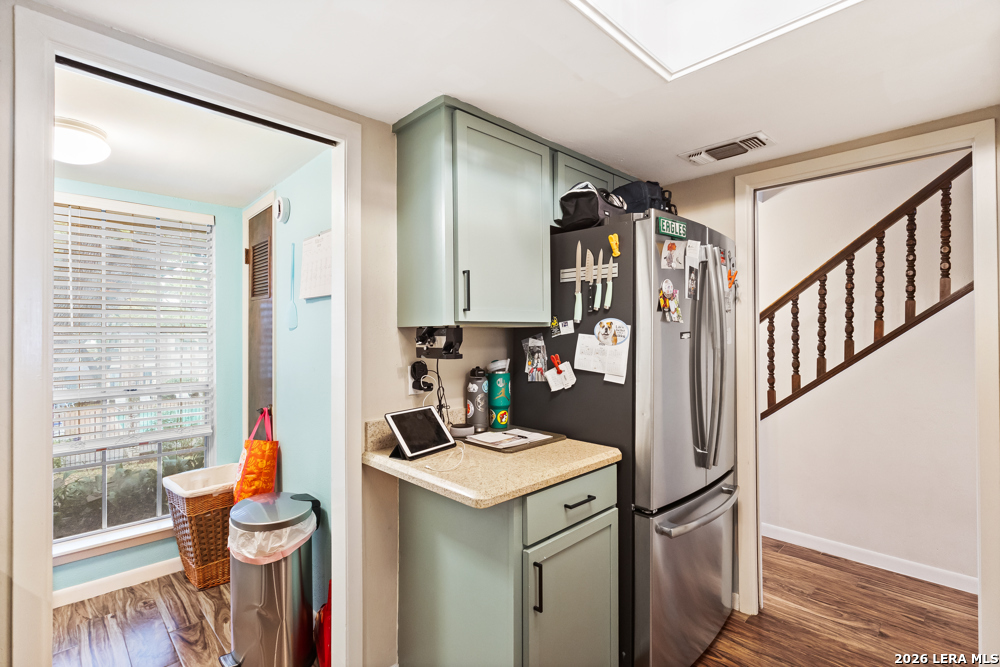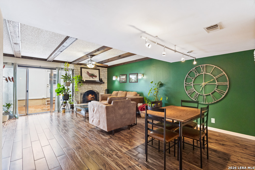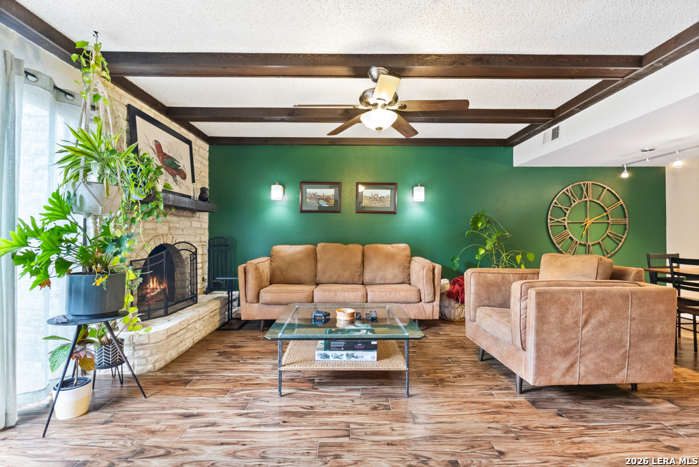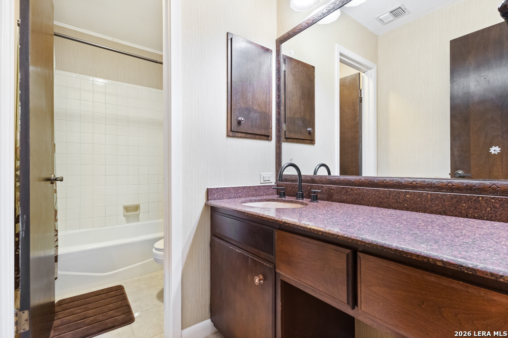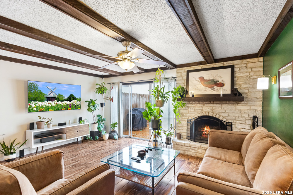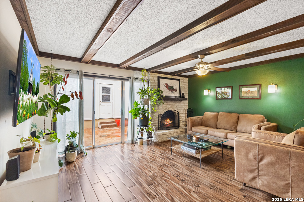 Beautiful 2 bedroom, 2.5 bath townhome located in the Bent Oak Townhome community, offering comfort, charm, and low-maintenance living. The entire first floor features beautiful ceramic tile flooring, plenty kitchen cabinets, and granite countertops, with a convenient utility room located just off the kitchen. The spacious yet cozy living and dining area is highlighted by a fireplace that adds warmth and character to the home. Upstairs, both the primary and guest bedrooms are generously sized, providing plenty of space to relax and unwind. Step outside to a private patio that's perfect for morning coffee or family gatherings. This home also includes a large detached two-car garage. Enjoy a direct view of the community pool and park-like surroundings right from your front door. The HOA covers concierge trash service, landscaping, and grounds maintenance. Close to major highways, USAA, UTSA, Fiesta Texas, La Cantera, The Rim.