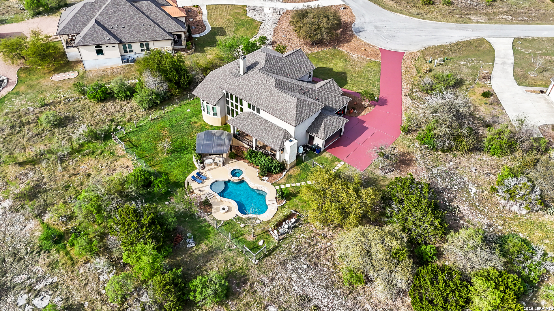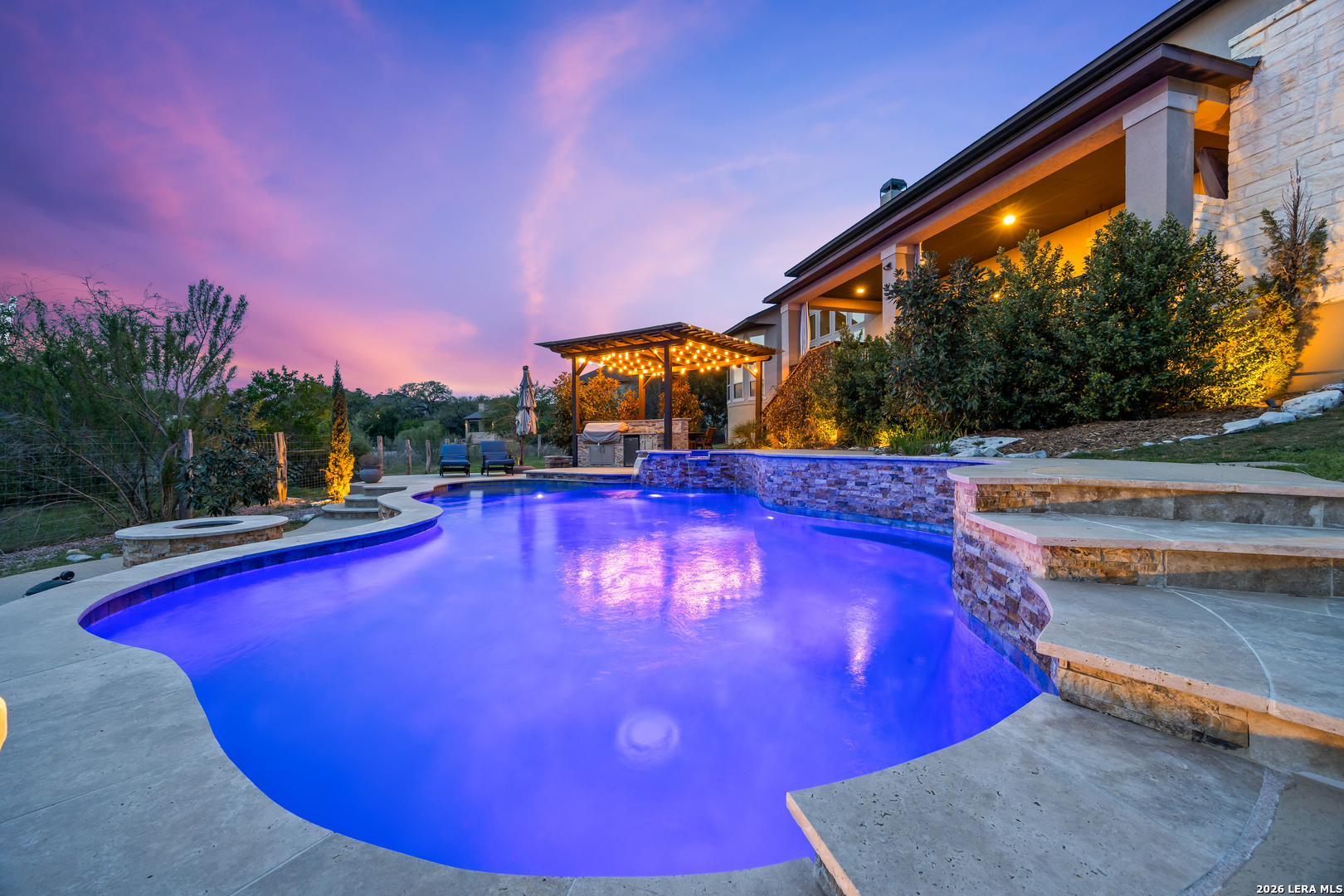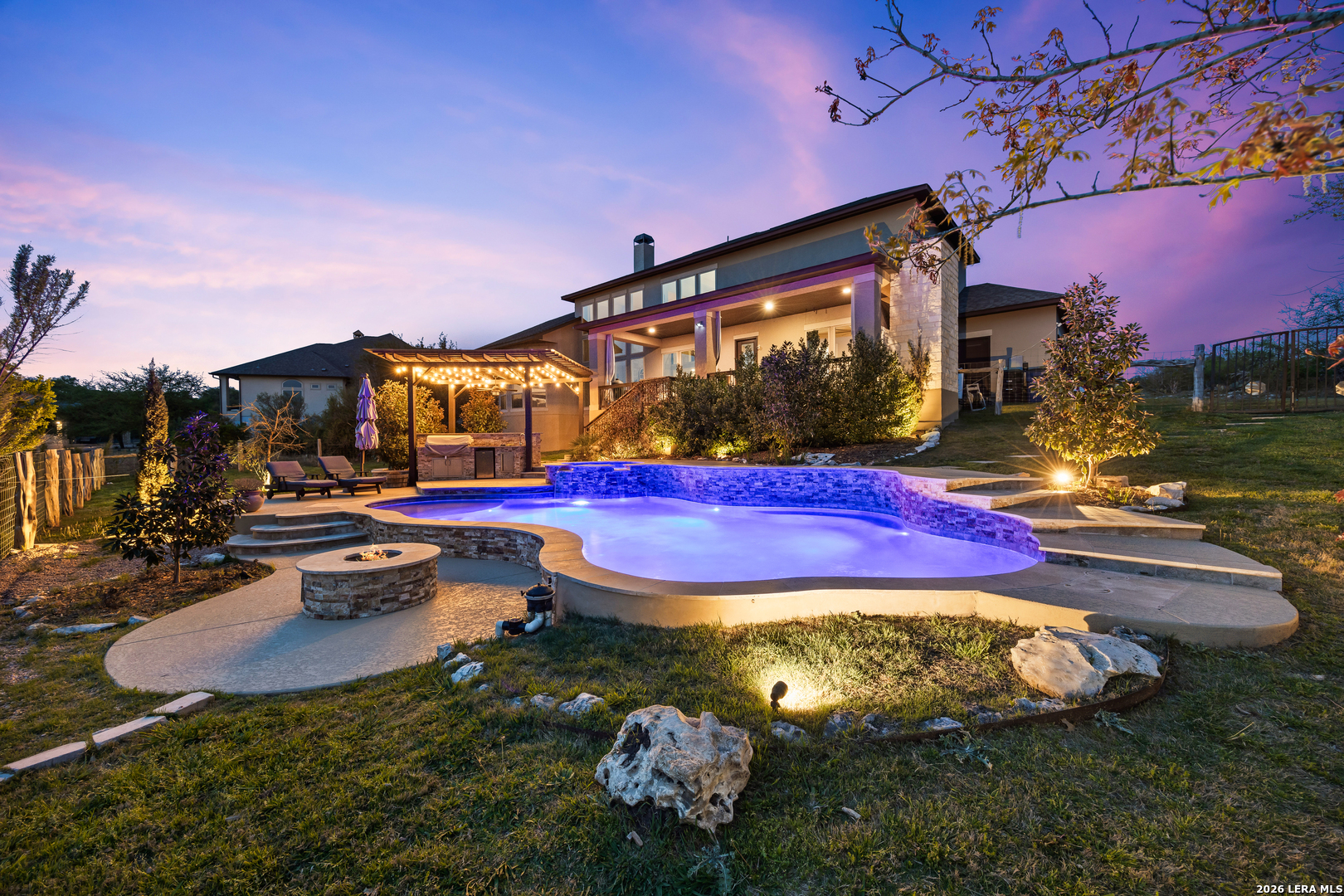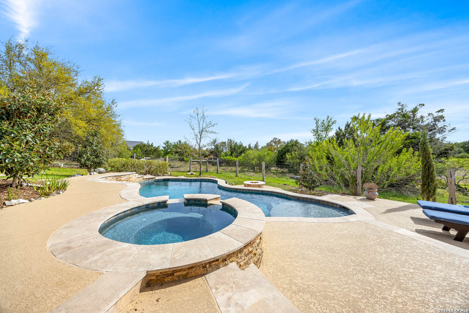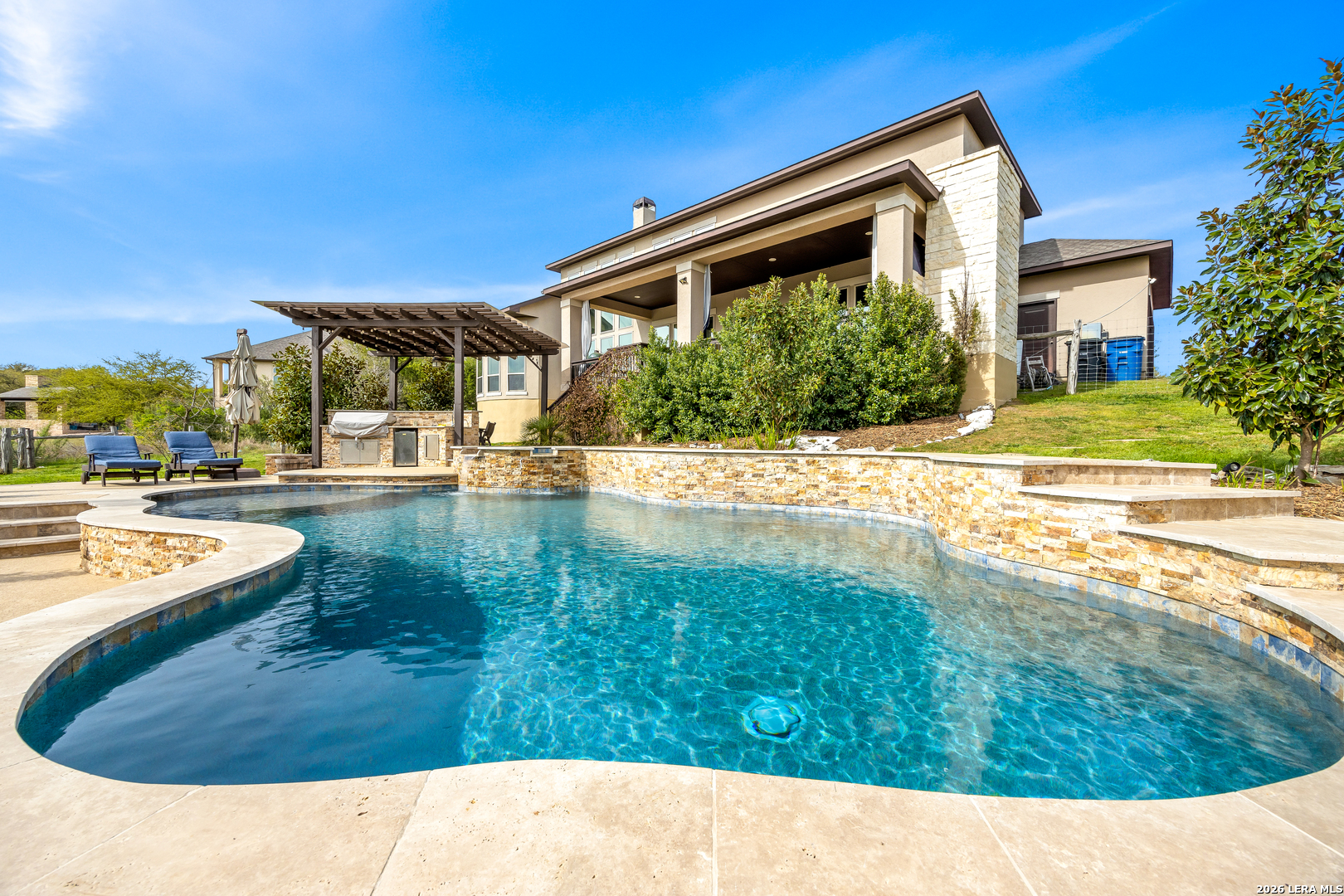 Experience the perfect blend of Hill Country beauty and refined living in this exceptional estate set on 1.44 private acres in the highly sought-after Vintage Oaks community. Backing to a serene greenbelt, this home offers privacy, open views, and a peaceful natural setting that makes every day feel like a retreat. The backyard is designed for both relaxation and entertaining, featuring a custom pool and spa with beautiful natural stone, a covered patio with its own outdoor chimney, a separate fire pit, and a stunning pergola that shelters a beautifully designed outdoor kitchen and grilling area-ideal for gatherings, sunset dinners, and evenings under the Texas sky. Inside, nearly 5,000 square feet of thoughtfully designed space welcomes you with soaring 20-foot ceilings, abundant natural light, and a dramatic floor-to-ceiling stone fireplace that anchors the main living area. The chef's kitchen impresses with an oversized island, double ovens, granite countertops, a Butler's pantry, and a 5-burner gas cooktop, all flowing seamlessly into the living and dining spaces. The main level features the spacious primary suite and a secondary bedroom with en-suite bath, offering comfort and flexibility. Upstairs, enjoy a large, beautiful media or movie room, an expansive loft, and additional bedrooms designed for both comfort and style. A custom-floored four-car garage provides ample space for vehicles, storage, or hobbies. Vintage Oaks residents enjoy resort-style amenities including a 7,800+ sq. ft. fitness center, lazy river, Olympic-style pool, clubhouse, basketball and tennis courts, soccer and baseball fields, playgrounds, and plenty of hiking trails that wind through scenic Hill Country surroundings. A rare opportunity to own a home where luxury, privacy, and lifestyle come together in one extraordinary setting.