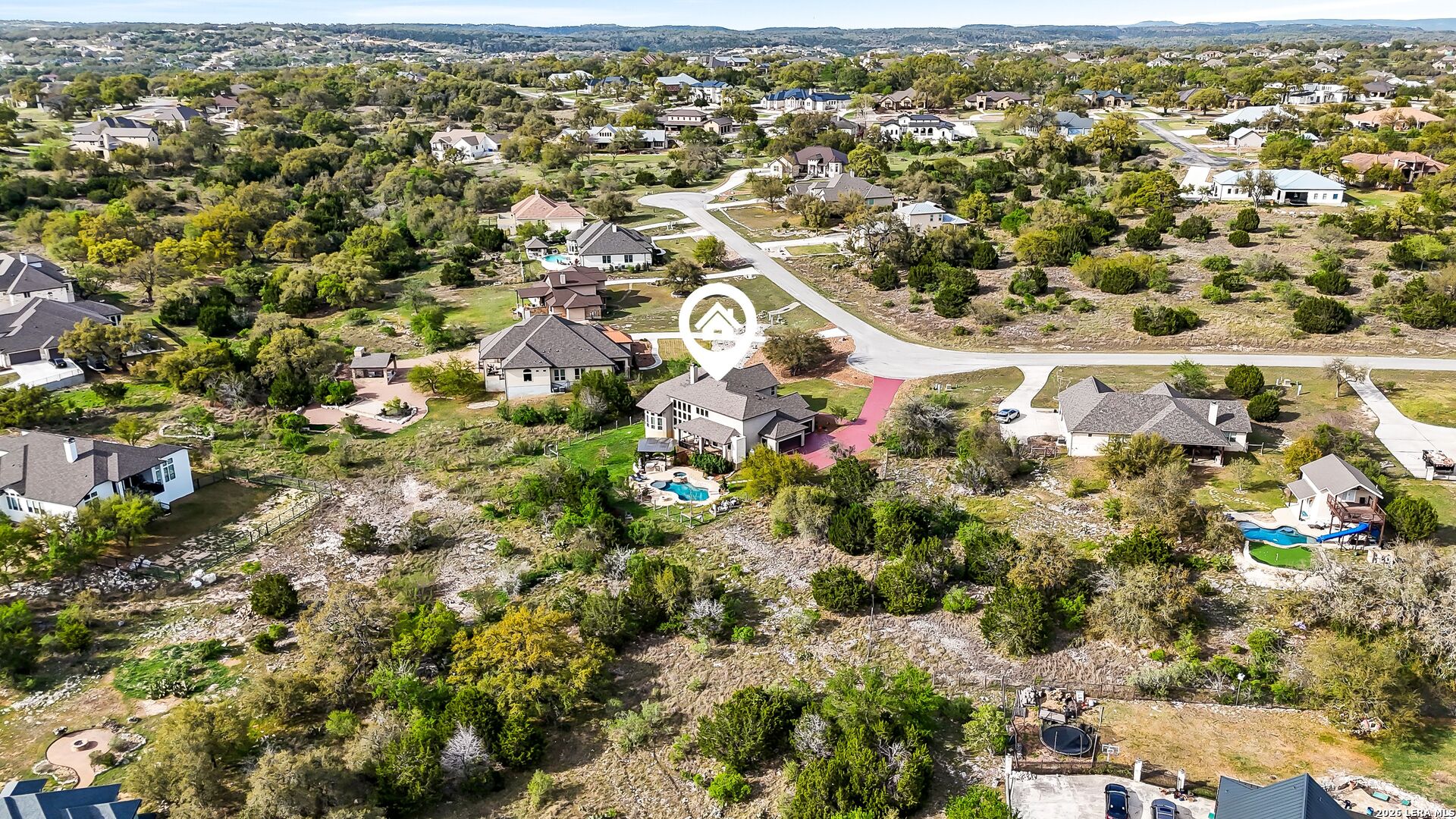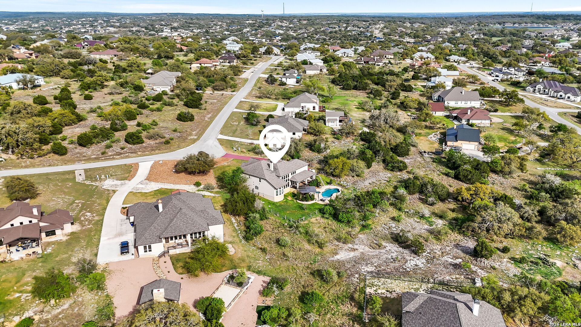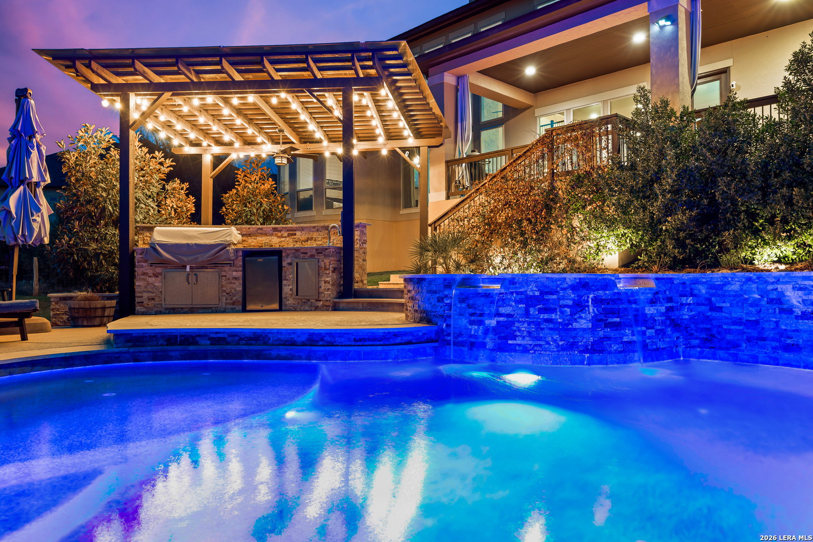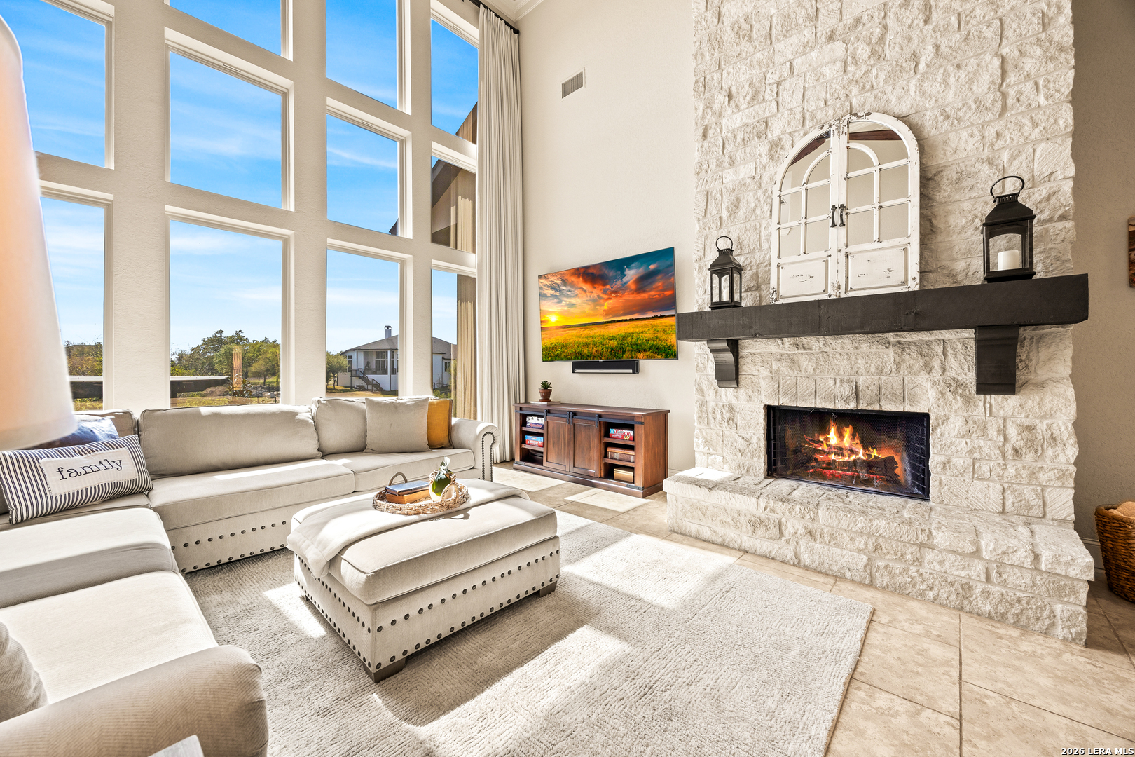Experience the perfect blend of Hill Country beauty and refined living in this exceptional estate set on 1.44 private acres in the highly sought-after Vintage Oaks community. Backing to a serene greenbelt, this home offers privacy, open views, and a peaceful natural setting that makes every day feel like a retreat. The backyard is designed for both relaxation and entertaining, featuring a custom pool and spa with beautiful natural stone, a covered patio with its own outdoor chimney, a separate fire pit, and a stunning pergola that shelters a beautifully designed outdoor kitchen and grilling area-ideal for gatherings, sunset dinners, and evenings under the Texas sky. Inside, nearly 5,000 square feet of thoughtfully designed space welcomes you with soaring 20-foot ceilings, abundant natural light, and a dramatic floor-to-ceiling stone fireplace that anchors the main living area. The chef's kitchen impresses with an oversized island, double ovens, granite countertops, a Butler's pantry, and a 5-burner gas cooktop, all flowing seamlessly into the living and dining spaces. The main level features the spacious primary suite and a secondary bedroom with en-suite bath, offering comfort and flexibility. Upstairs, enjoy a large, beautiful media or movie room, an expansive loft, and additional bedrooms designed for both comfort and style. A custom-floored four-car garage provides ample space for vehicles, storage, or hobbies. Vintage Oaks residents enjoy resort-style amenities including a 7,800+ sq. ft. fitness center, lazy river, Olympic-style pool, clubhouse, basketball and tennis courts, soccer and baseball fields, playgrounds, and plenty of hiking trails that wind through scenic Hill Country surroundings. A rare opportunity to own a home where luxury, privacy, and lifestyle come together in one extraordinary setting.