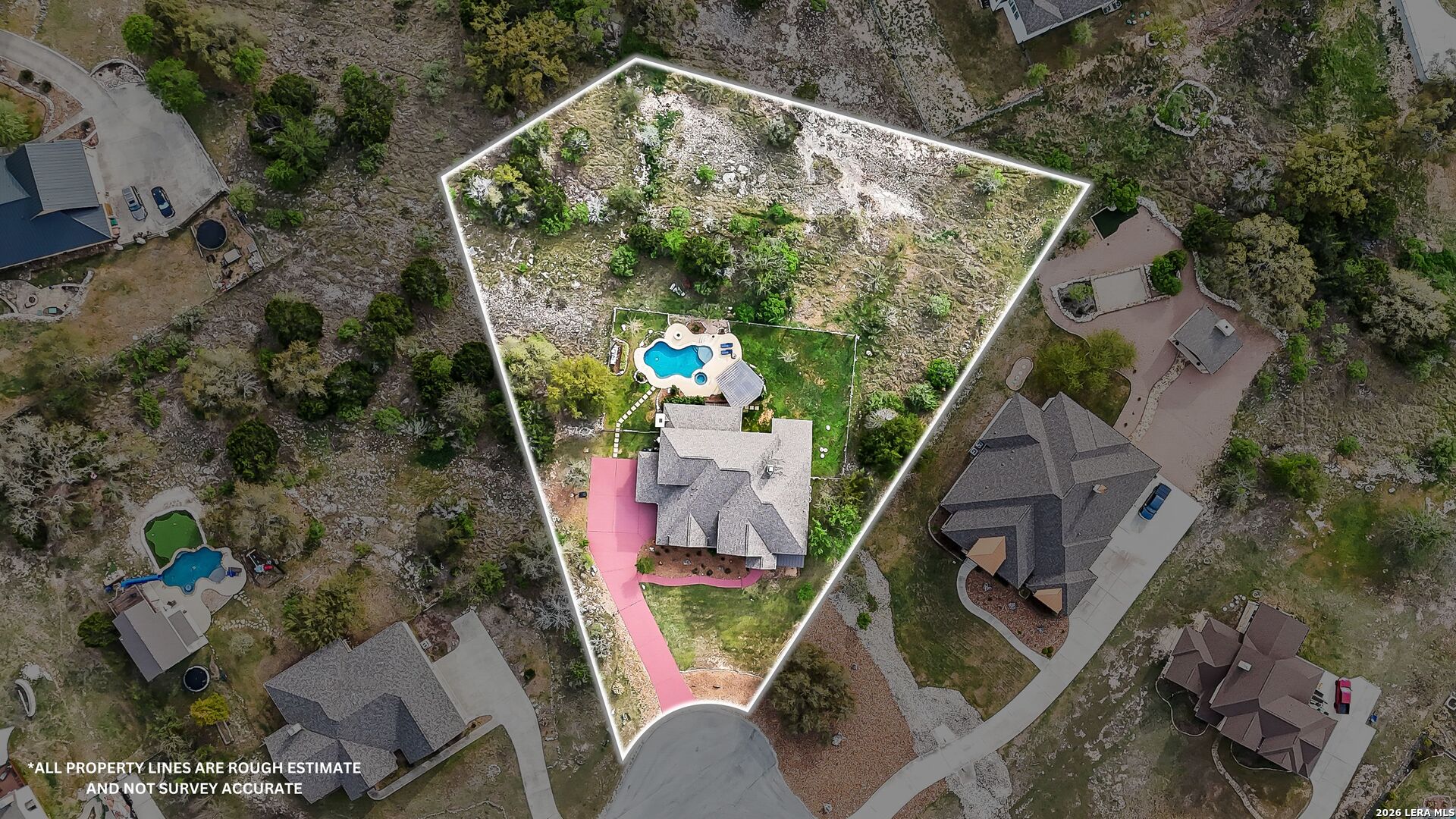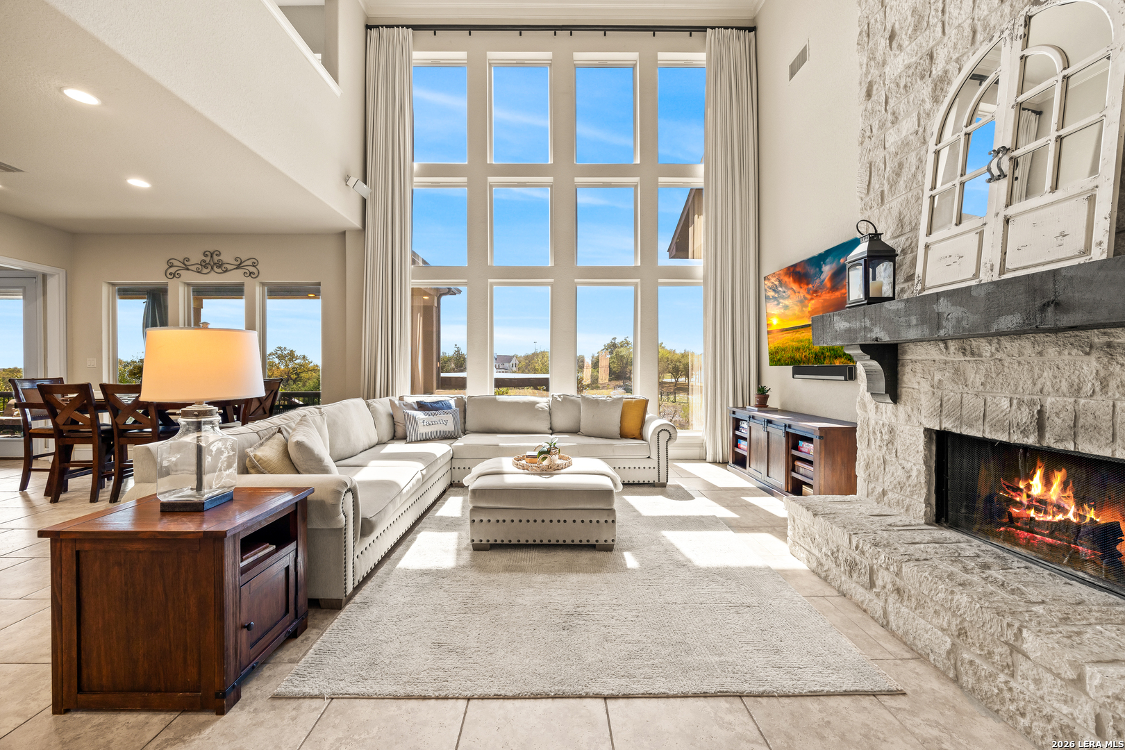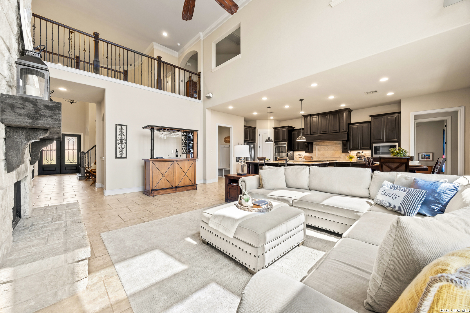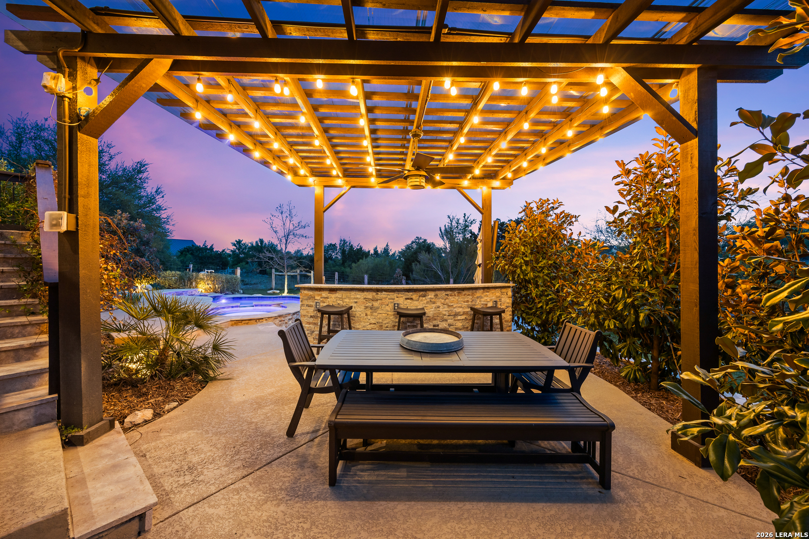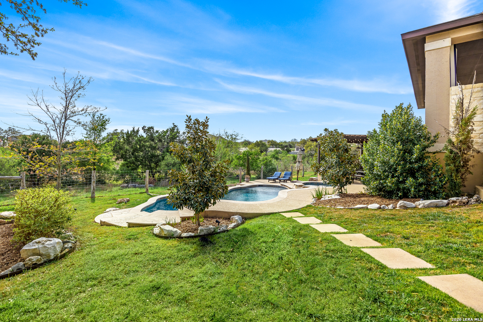 Experience the perfect blend of Hill Country beauty and refined living in this exceptional estate set on 1.44 private acres in the highly sought-after Vintage Oaks community. Backing to a serene greenbelt, this home offers privacy, open views, and a peaceful natural setting that makes every day feel like a retreat. The backyard is designed for both relaxation and entertaining, featuring a custom pool and spa with beautiful natural stone, a covered patio with its own outdoor chimney, a separate fire pit, and a stunning pergola that shelters a beautifully designed outdoor kitchen and grilling area-ideal for gatherings, sunset dinners, and evenings under the Texas sky. Inside, nearly 5,000 square feet of thoughtfully designed space welcomes you with soaring 20-foot ceilings, abundant natural light, and a dramatic floor-to-ceiling stone fireplace that anchors the main living area. The chef's kitchen impresses with an oversized island, double ovens, granite countertops, a Butler's pantry, and a 5-burner gas cooktop, all flowing seamlessly into the living and dining spaces. The main level features the spacious primary suite and a secondary bedroom with en-suite bath, offering comfort and flexibility. Upstairs, enjoy a large, beautiful media or movie room, an expansive loft, and additional bedrooms designed for both comfort and style. A custom-floored four-car garage provides ample space for vehicles, storage, or hobbies. Vintage Oaks residents enjoy resort-style amenities including a 7,800+ sq. ft. fitness center, lazy river, Olympic-style pool, clubhouse, basketball and tennis courts, soccer and baseball fields, playgrounds, and plenty of hiking trails that wind through scenic Hill Country surroundings. A rare opportunity to own a home where luxury, privacy, and lifestyle come together in one extraordinary setting.