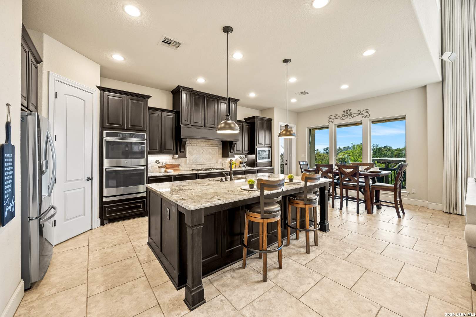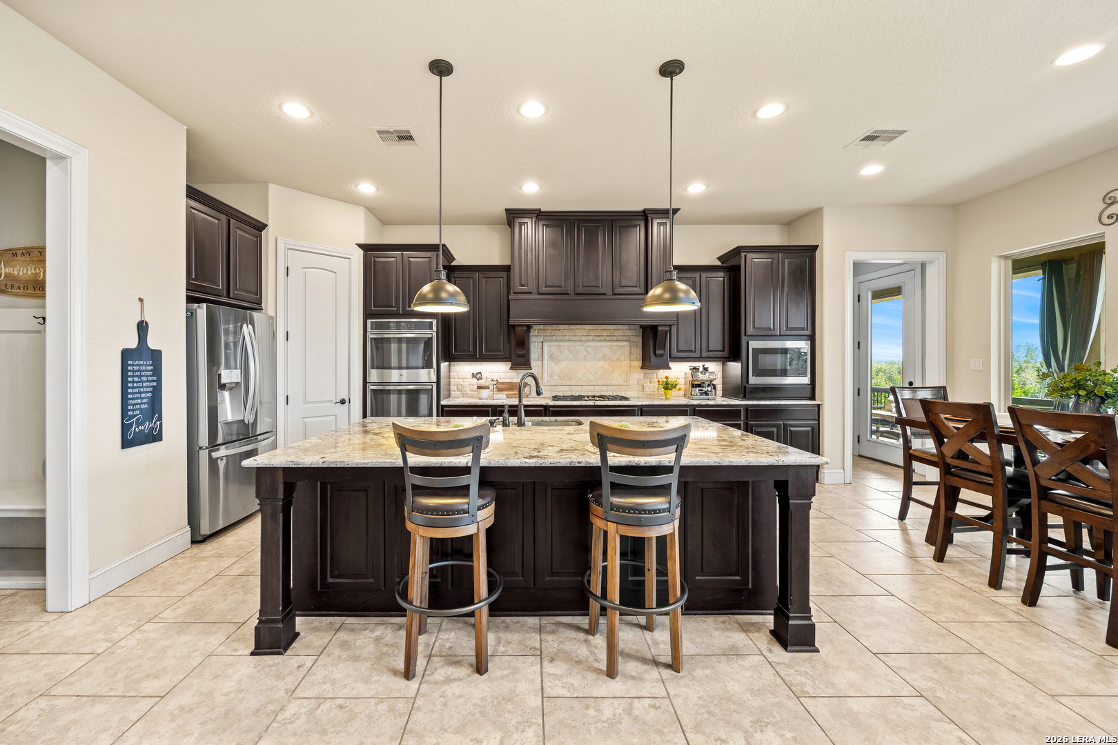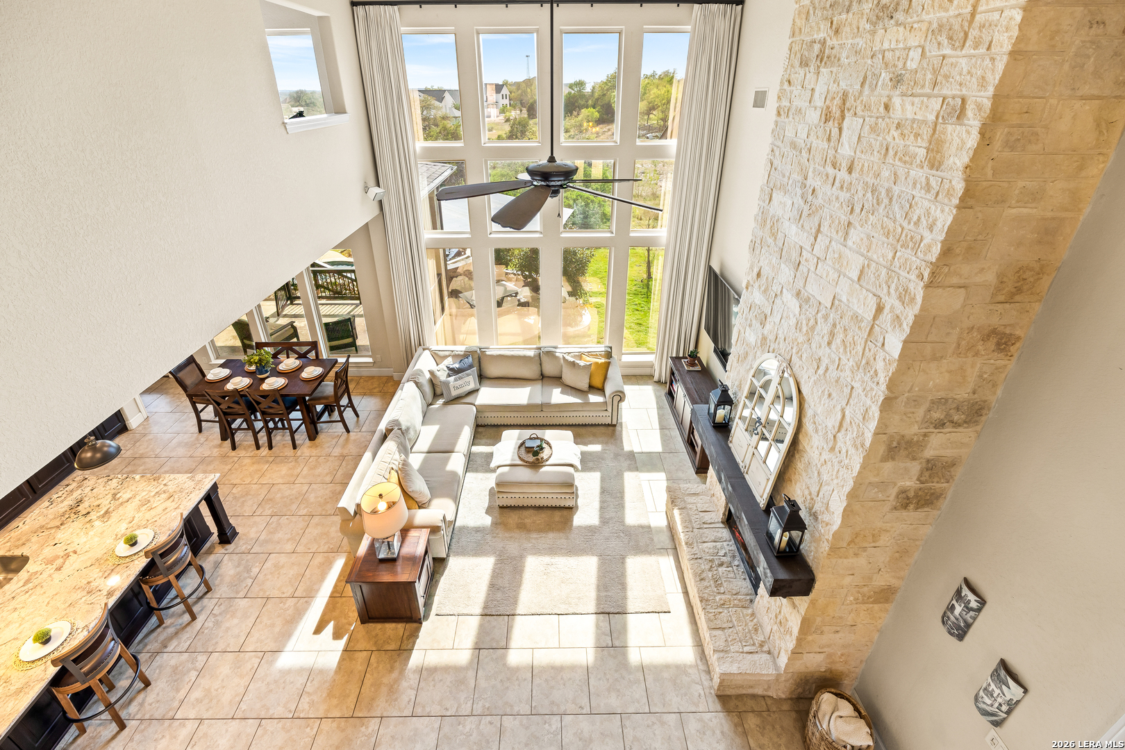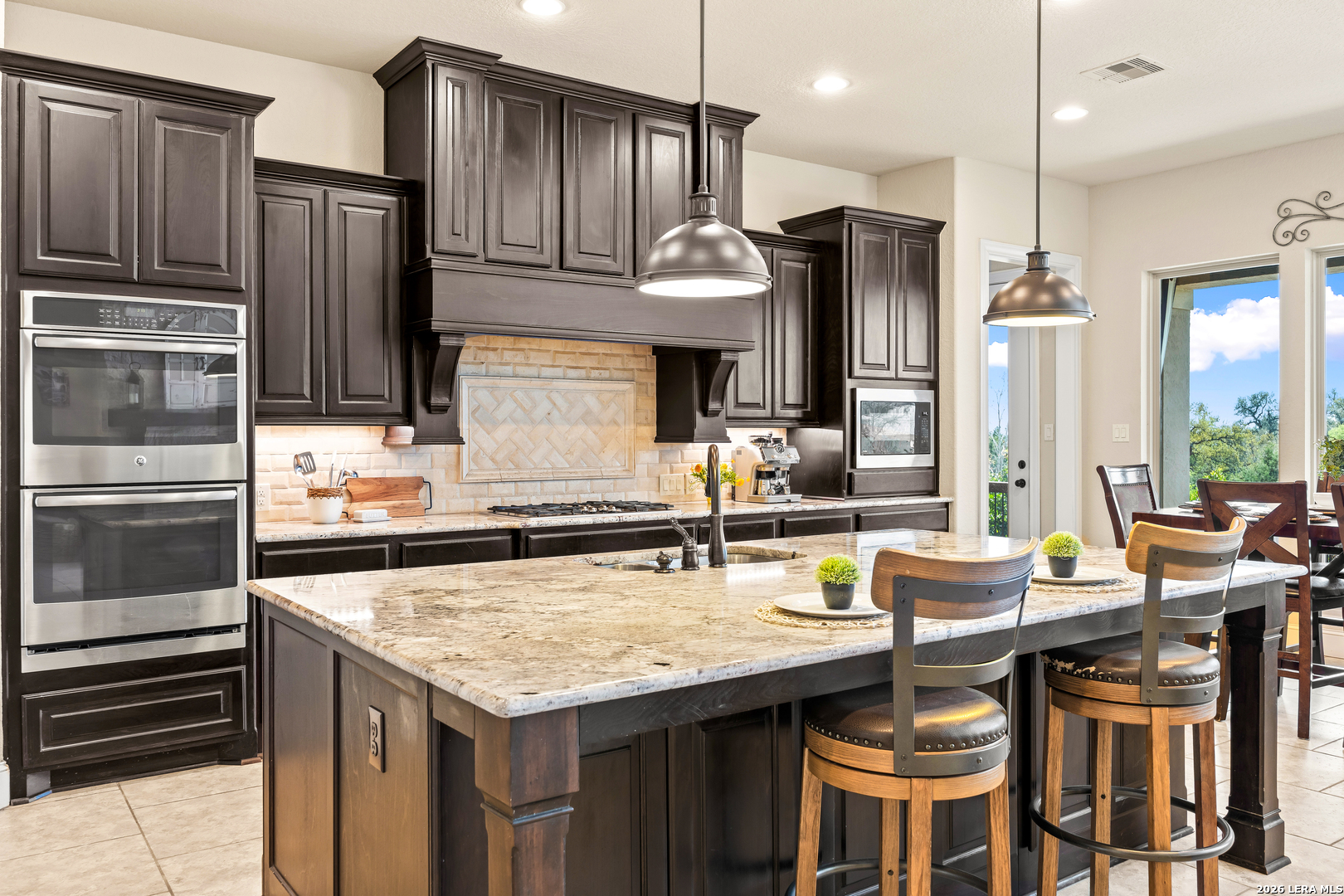 Experience the perfect blend of Hill Country beauty and refined living in this exceptional estate set on 1.44 private acres in the highly sought-after Vintage Oaks community. Backing to a serene greenbelt, this home offers privacy, open views, and a peaceful natural setting that makes every day feel like a retreat. The backyard is designed for both relaxation and entertaining, featuring a custom pool and spa with beautiful natural stone, a covered patio with its own outdoor chimney, a separate fire pit, and a stunning pergola that shelters a beautifully designed outdoor kitchen and grilling area-ideal for gatherings, sunset dinners, and evenings under the Texas sky. Inside, nearly 5,000 square feet of thoughtfully designed space welcomes you with soaring 20-foot ceilings, abundant natural light, and a dramatic floor-to-ceiling stone fireplace that anchors the main living area. The chef's kitchen impresses with an oversized island, double ovens, granite countertops, a Butler's pantry, and a 5-burner gas cooktop, all flowing seamlessly into the living and dining spaces. The main level features the spacious primary suite and a secondary bedroom with en-suite bath, offering comfort and flexibility. Upstairs, enjoy a large, beautiful media or movie room, an expansive loft, and additional bedrooms designed for both comfort and style. A custom-floored four-car garage provides ample space for vehicles, storage, or hobbies. Vintage Oaks residents enjoy resort-style amenities including a 7,800+ sq. ft. fitness center, lazy river, Olympic-style pool, clubhouse, basketball and tennis courts, soccer and baseball fields, playgrounds, and plenty of hiking trails that wind through scenic Hill Country surroundings. A rare opportunity to own a home where luxury, privacy, and lifestyle come together in one extraordinary setting.