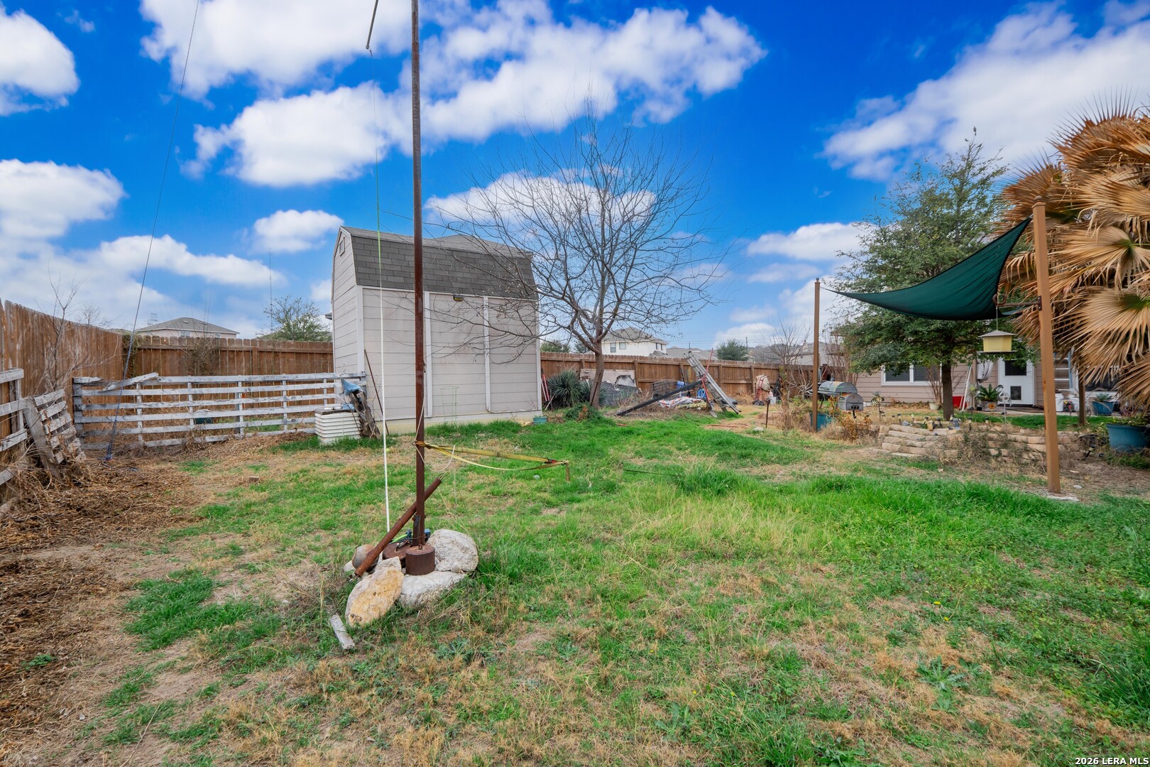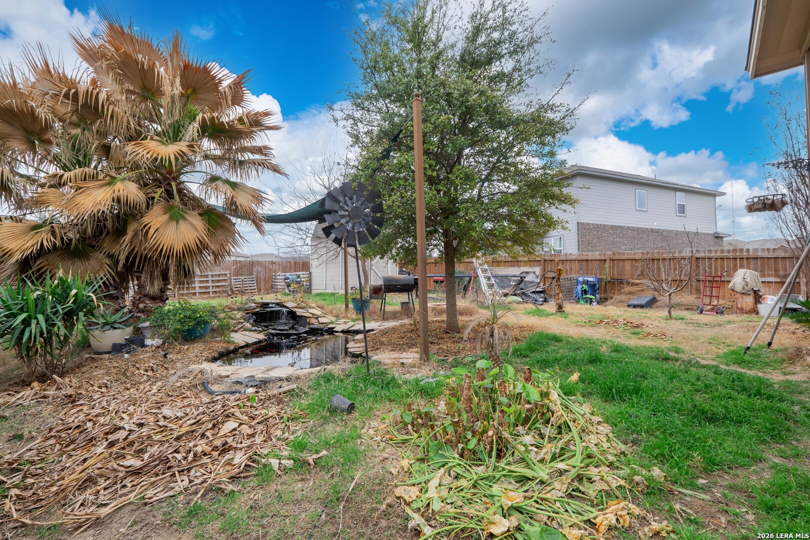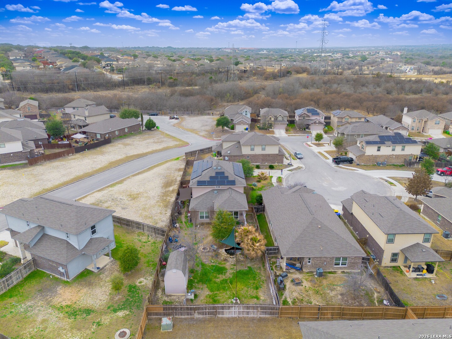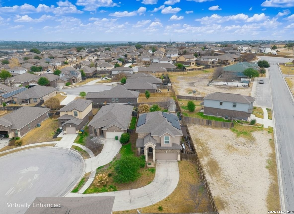 Nestled in a cul-de-sac within a gated community, this 4-bedroom, 3.5-bath, two-story home offers privacy, security, and an exceptional layout ideal for everyday living and multigenerational arrangements. Equipped with solar panels for energy efficiency and an attached 2-car garage, the home blends comfort with long-term savings. Step inside the foyer, which opens to an inviting open-concept living, dining, and kitchen area highlighted by elegant interior archways that add architectural character. The living room features high ceilings, creating a bright and airy atmosphere. The spacious kitchen offers a large center island, granite countertops, and a pantry, making it ideal for both daily use and entertaining. The primary suite is conveniently located on the main level at the rear of the home for added privacy. This carpeted retreat features a tray ceiling, high ceilings, and an ensuite bath with a double vanity, walk-in shower, and walk-in closet. Upstairs, a thoughtfully designed split floorplan includes three additional bedrooms and two full bathrooms, including a Jack-and-Jill bath. All upstairs bedrooms and the expansive family room are carpeted, providing a comfortable and cohesive space for relaxation, play, or gatherings. The spacious backyard is enclosed by a wooden privacy fence and includes a storage shed, offering ample room for outdoor activities, pets, or future enhancements. Conveniently located just minutes from TJ Maxx, Costco, Walmart, H-E-B Plus, and a wide variety of additional shopping, dining, and everyday amenities. With its versatile layout, spacious upper-level living area, and private main-level primary suite, this home is perfectly suited for multigenerational living or anyone seeking flexible space in a desirable neighborhood.