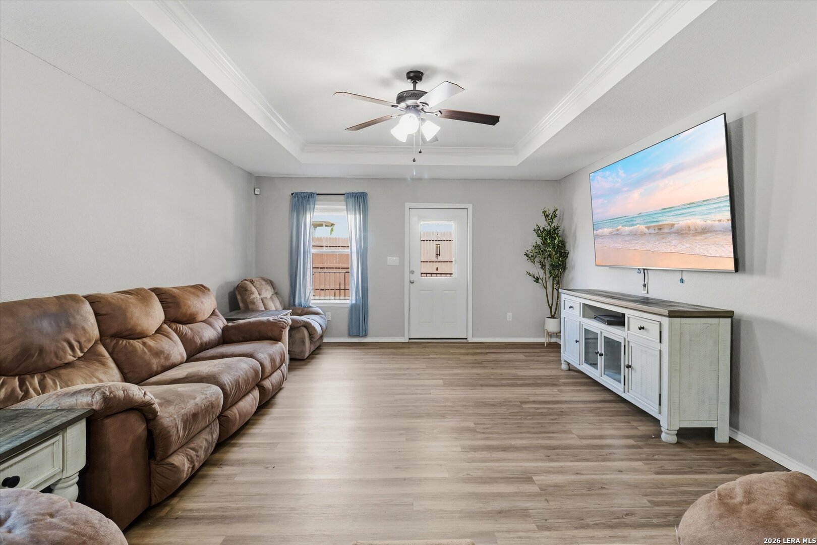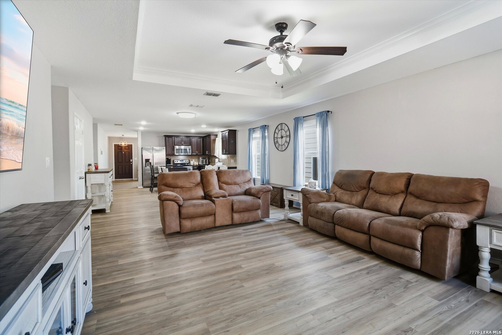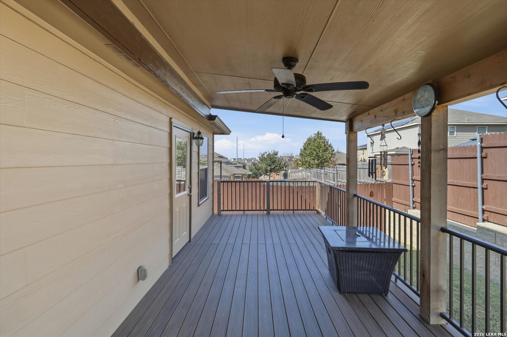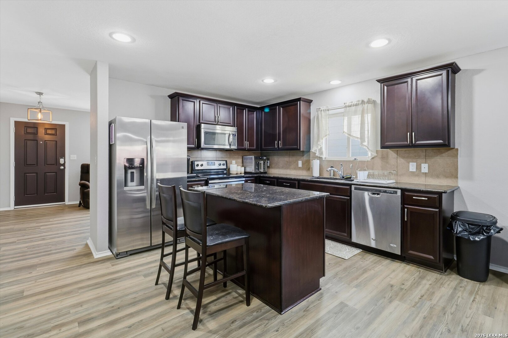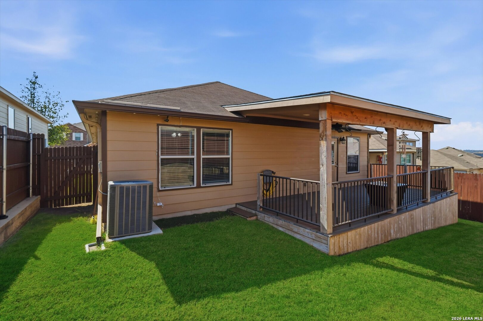 This move-in ready one-story home offers a bright open floor plan with three bedrooms and two full baths, perfect for comfortable everyday living. The kitchen is a true centerpiece, featuring a large granite island, abundant cabinet and countertop space, and a refrigerator that conveys with the home. Enjoy year-round comfort with a garage equipped with a mini-split AC and heating system, ideal for a workspace or additional flex use. The home also features Govee Pro permanent exterior lighting, adding both convenience and curb appeal. Step outside to a spacious covered patio, perfect for relaxing or entertaining. Conveniently located near Lackland Air Force Base and situated in a community with excellent amenities including a pool, basketball court, and park with playground, this home blends convenience, functionality, and lifestyle appeal.