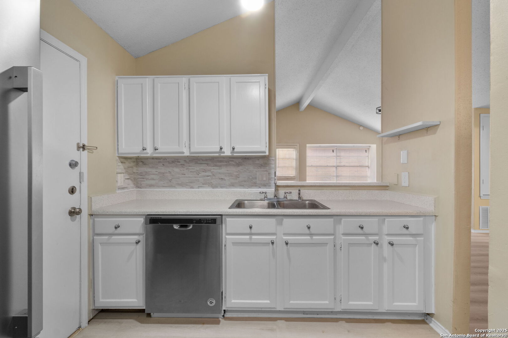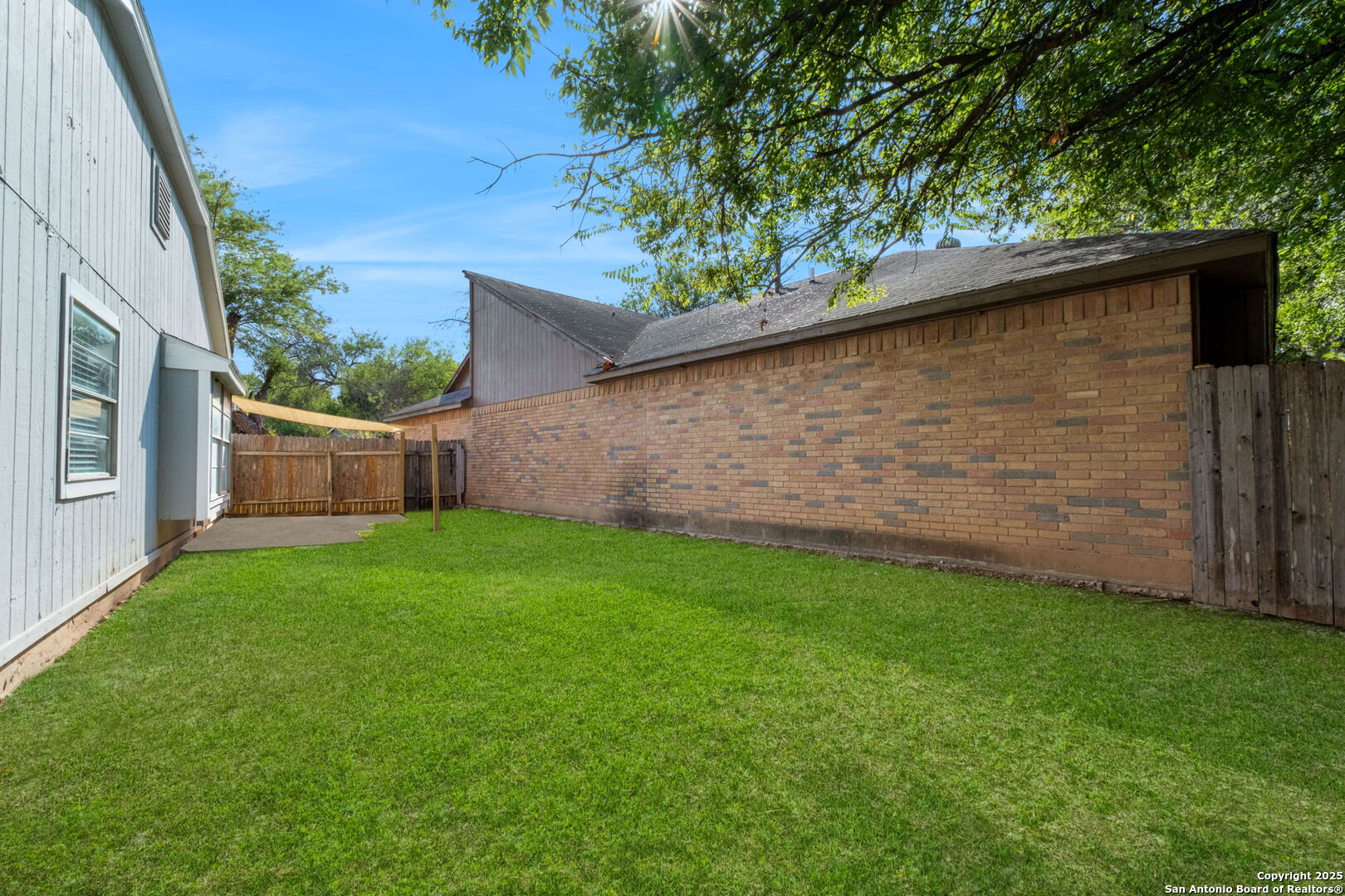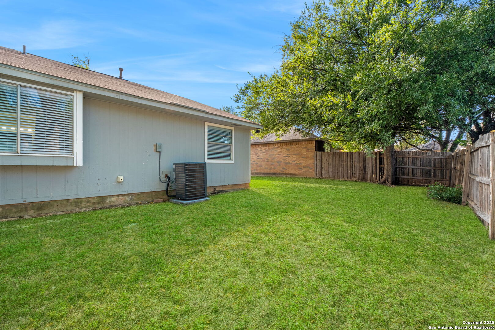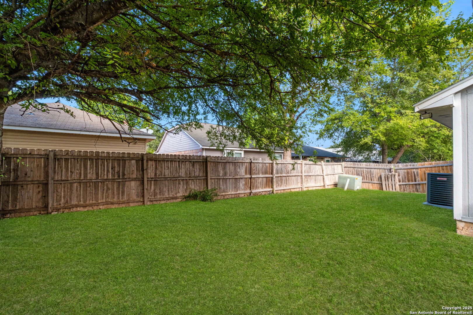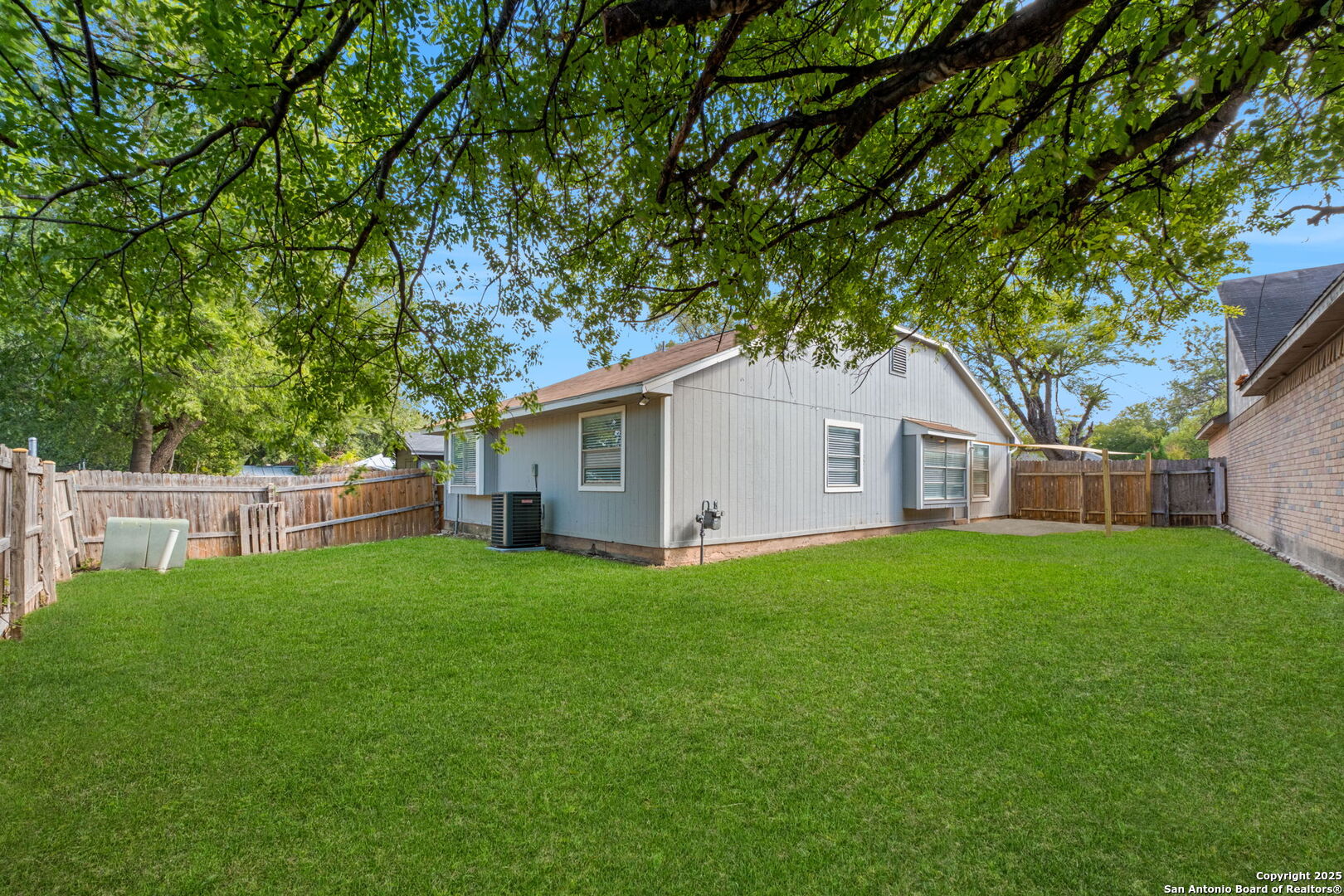 This well-maintained home in the Big Country neighborhood with no HOA features vaulted ceilings that create an open and airy feel throughout the living and dining areas. The living room includes a beautiful brick fireplace as a focal point, while large bay windows in both the living area and primary room invite in abundant natural light. The kitchen showcases white cabinetry and a tile backsplash, complemented by stainless steel appliances that were installed recently. The attached garage includes painted epoxy-finished floors that add durability and polish. Step outside to the covered patio and enjoy the low-maintenance backyard enclosed by a privacy fence, an ideal space for casual outdoor living or entertaining. Conveniently located just minutes away from Lackland Air Force Base, with easy access to Loop 1604 and major highways. Also a quick drive to SeaWorld, shopping, dining, and recreation.