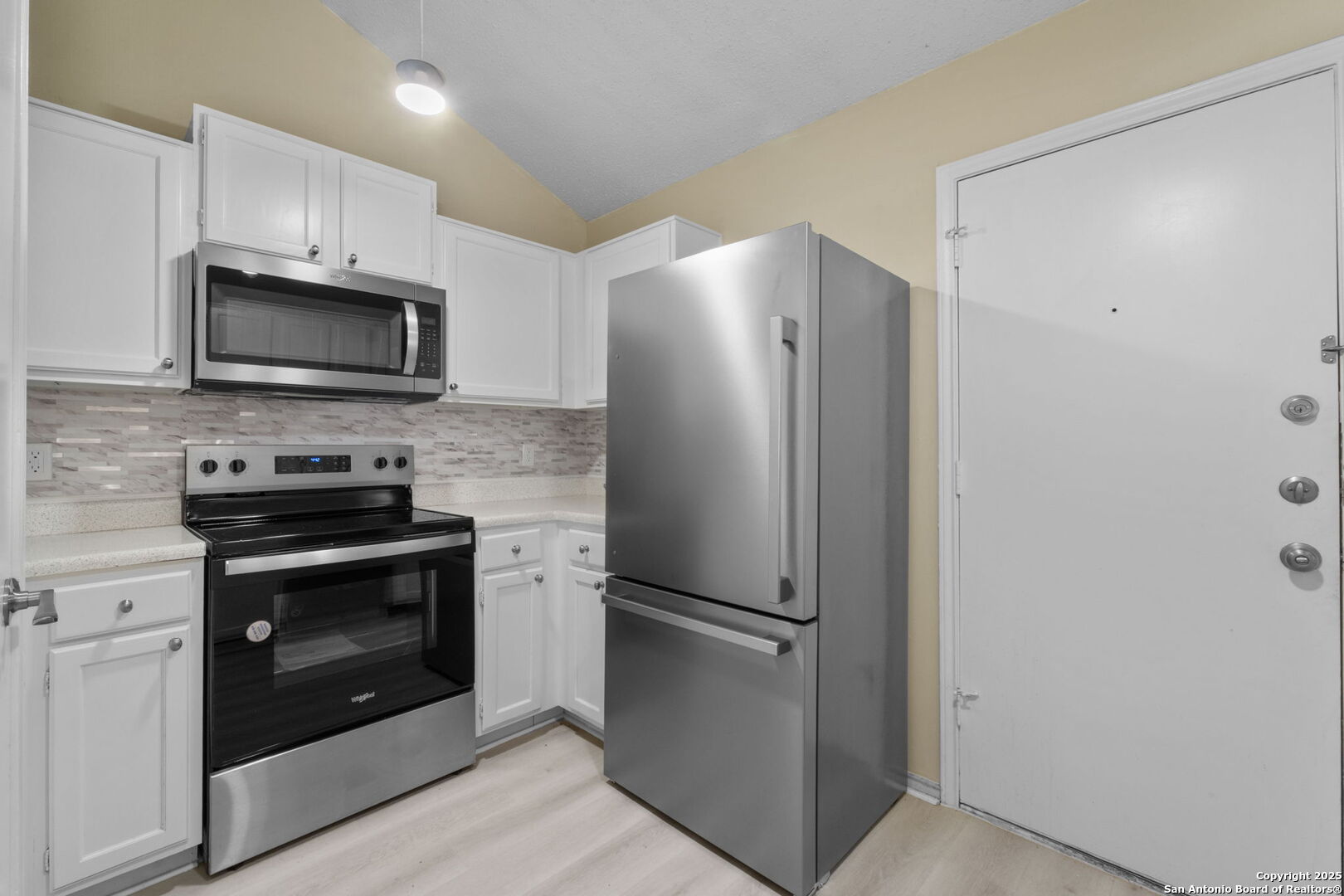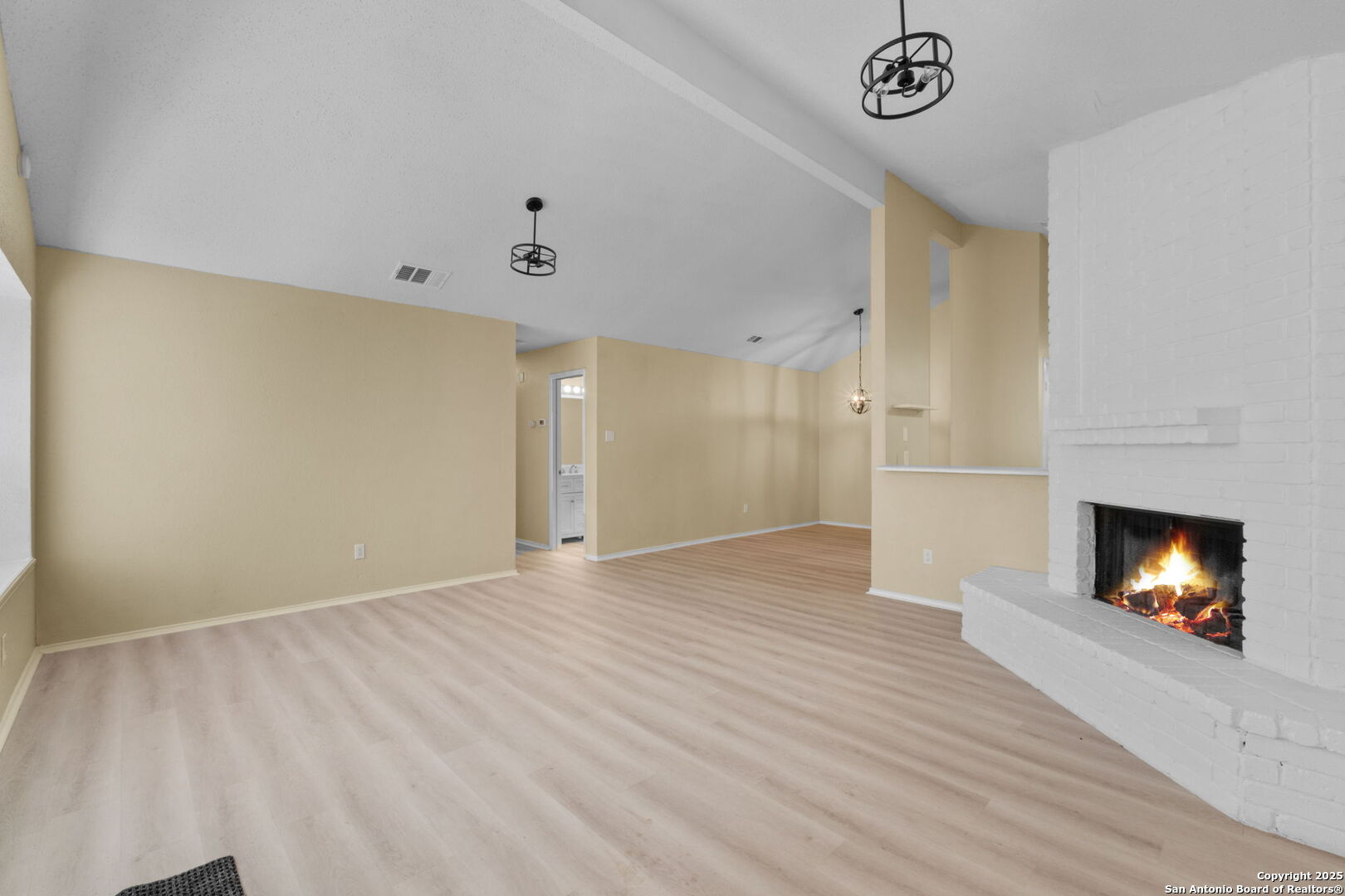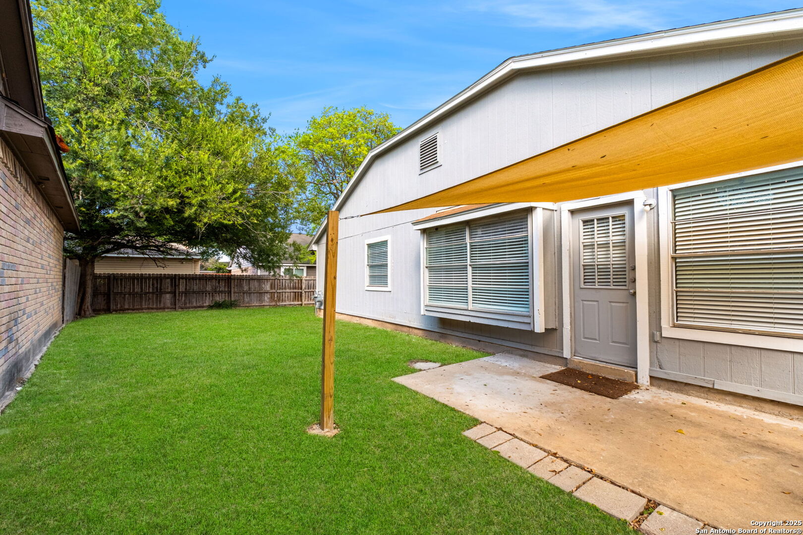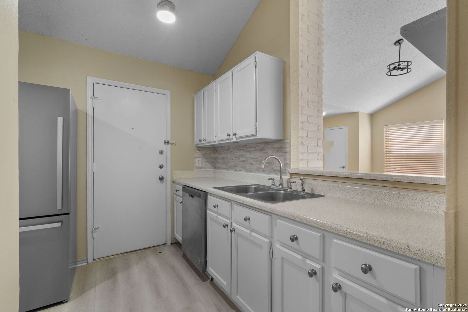 This well-maintained home in the Big Country neighborhood with no HOA features vaulted ceilings that create an open and airy feel throughout the living and dining areas. The living room includes a beautiful brick fireplace as a focal point, while large bay windows in both the living area and primary room invite in abundant natural light. The kitchen showcases white cabinetry and a tile backsplash, complemented by stainless steel appliances that were installed recently. The attached garage includes painted epoxy-finished floors that add durability and polish. Step outside to the covered patio and enjoy the low-maintenance backyard enclosed by a privacy fence, an ideal space for casual outdoor living or entertaining. Conveniently located just minutes away from Lackland Air Force Base, with easy access to Loop 1604 and major highways. Also a quick drive to SeaWorld, shopping, dining, and recreation.