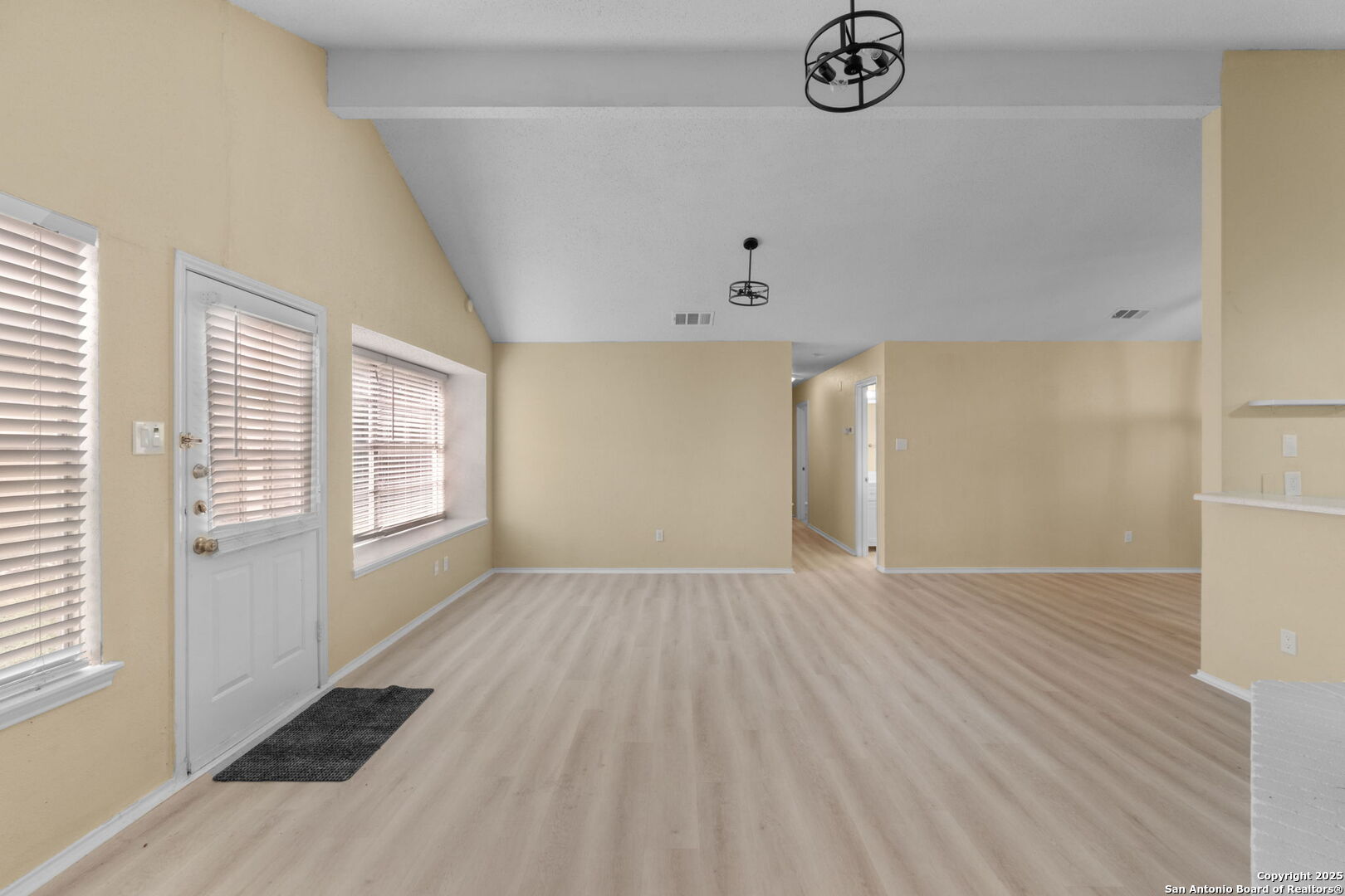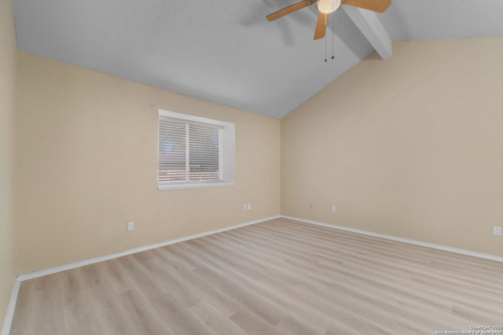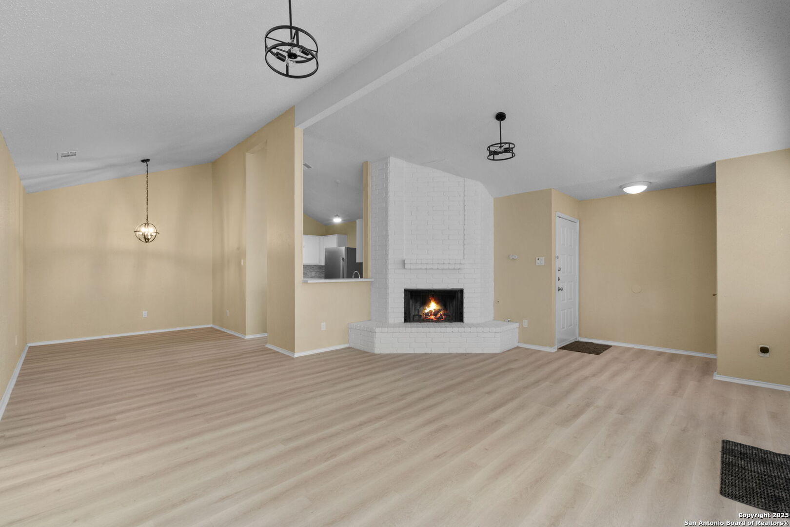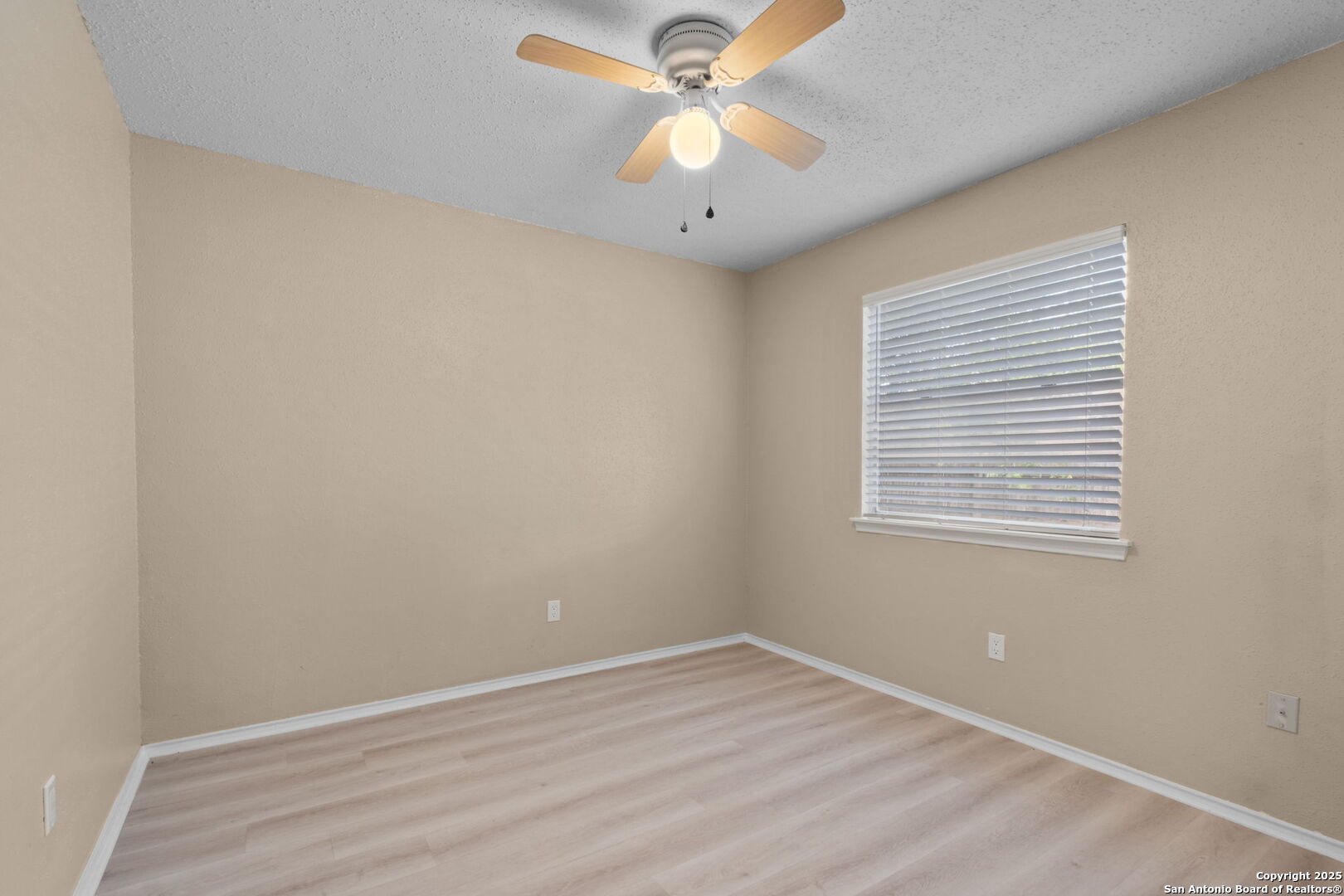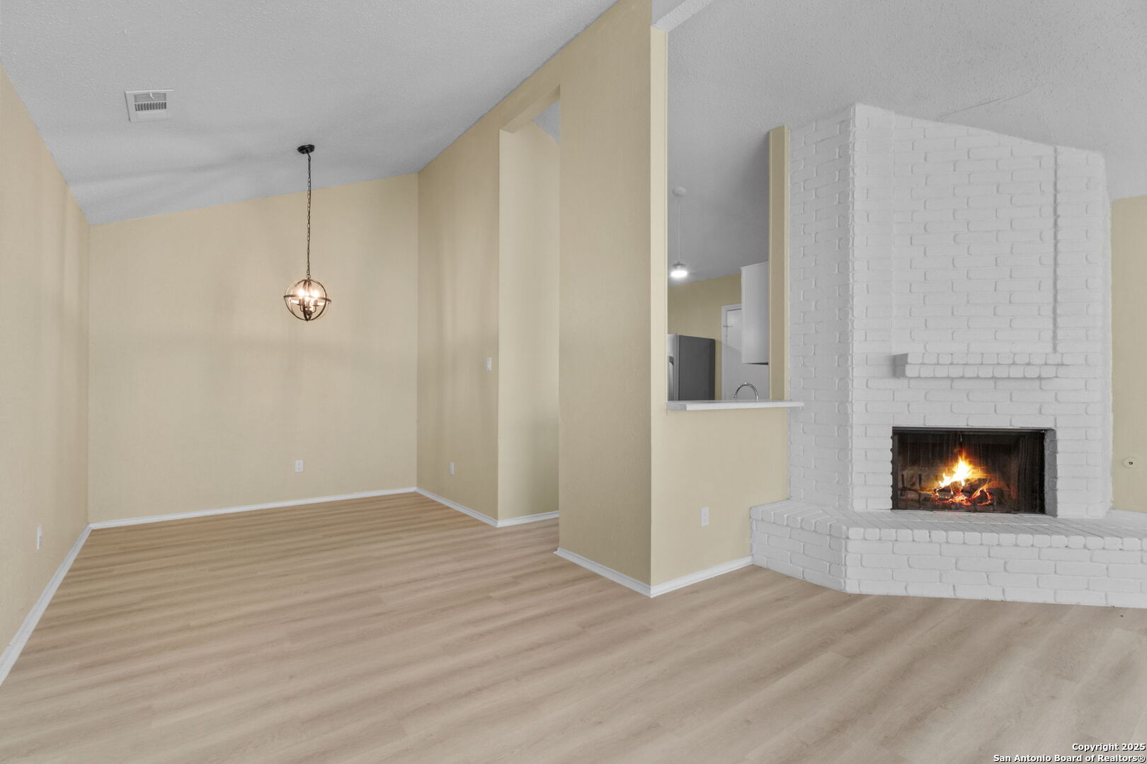 This well-maintained home in the Big Country neighborhood with no HOA features vaulted ceilings that create an open and airy feel throughout the living and dining areas. The living room includes a beautiful brick fireplace as a focal point, while large bay windows in both the living area and primary room invite in abundant natural light. The kitchen showcases white cabinetry and a tile backsplash, complemented by stainless steel appliances that were installed recently. The attached garage includes painted epoxy-finished floors that add durability and polish. Step outside to the covered patio and enjoy the low-maintenance backyard enclosed by a privacy fence, an ideal space for casual outdoor living or entertaining. Conveniently located just minutes away from Lackland Air Force Base, with easy access to Loop 1604 and major highways. Also a quick drive to SeaWorld, shopping, dining, and recreation.